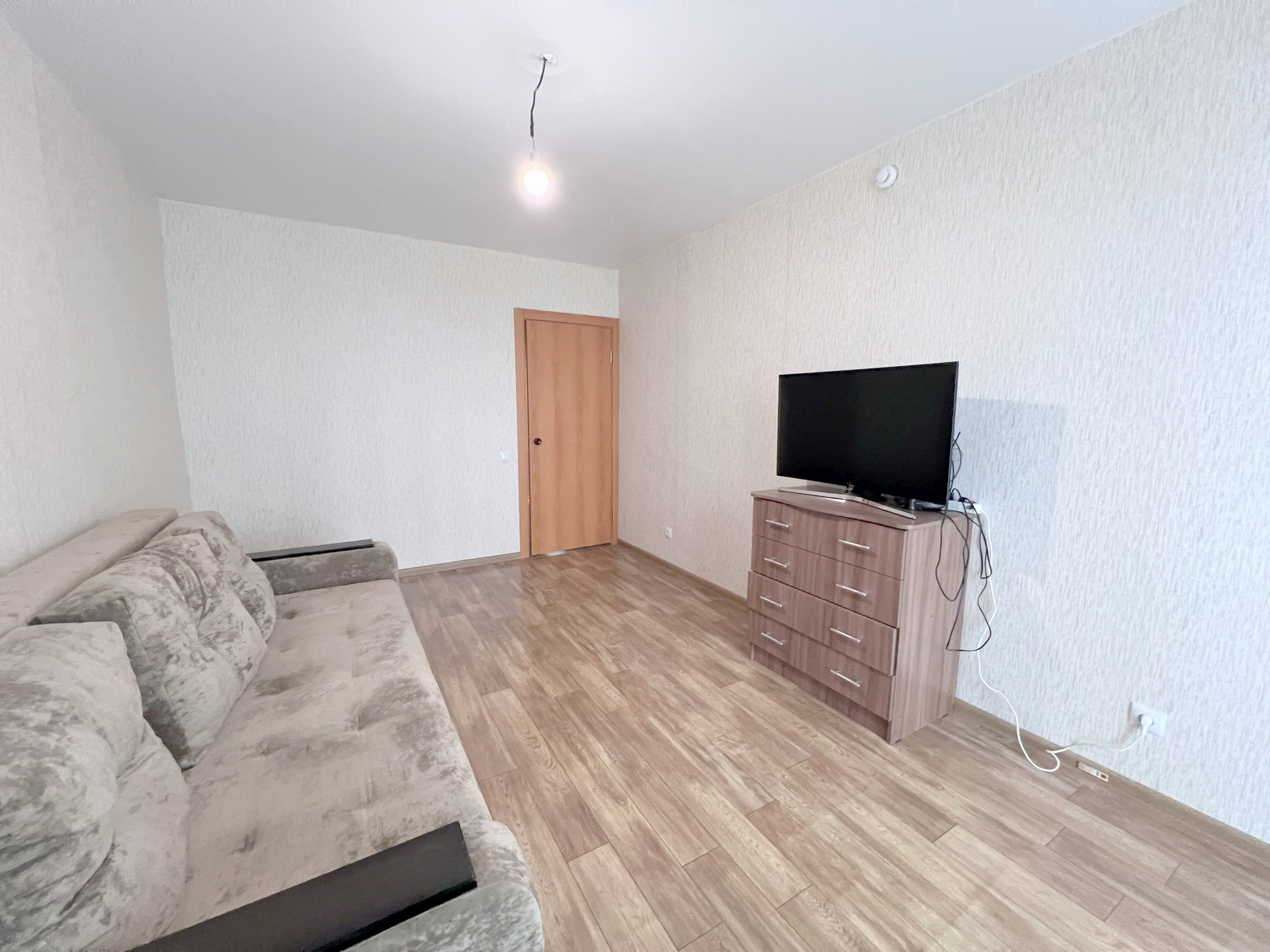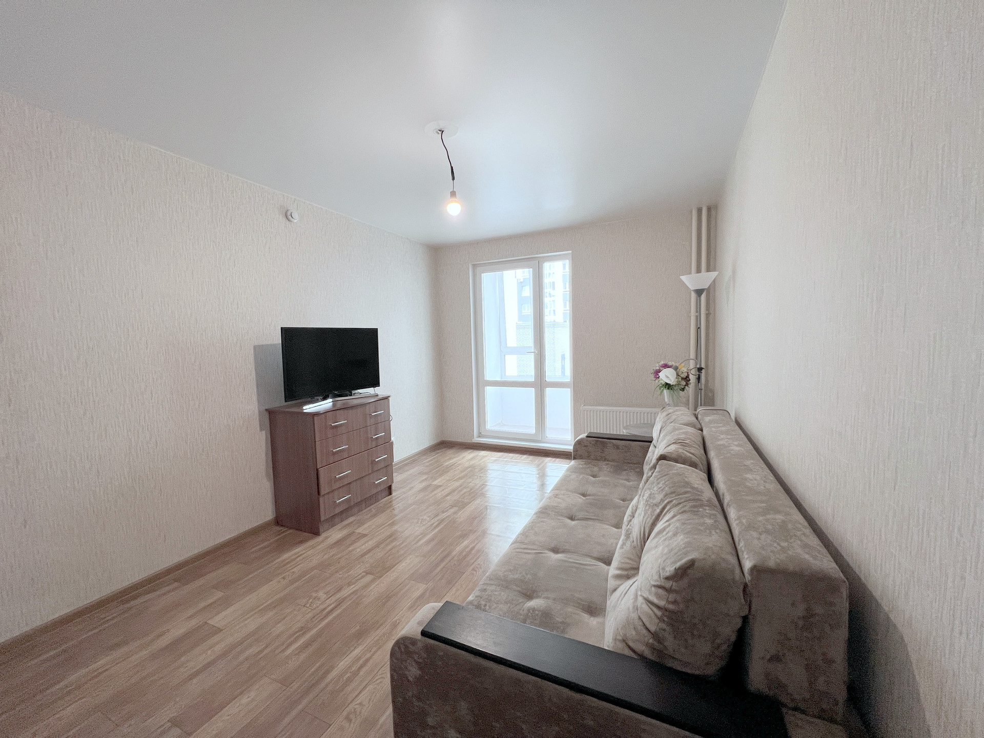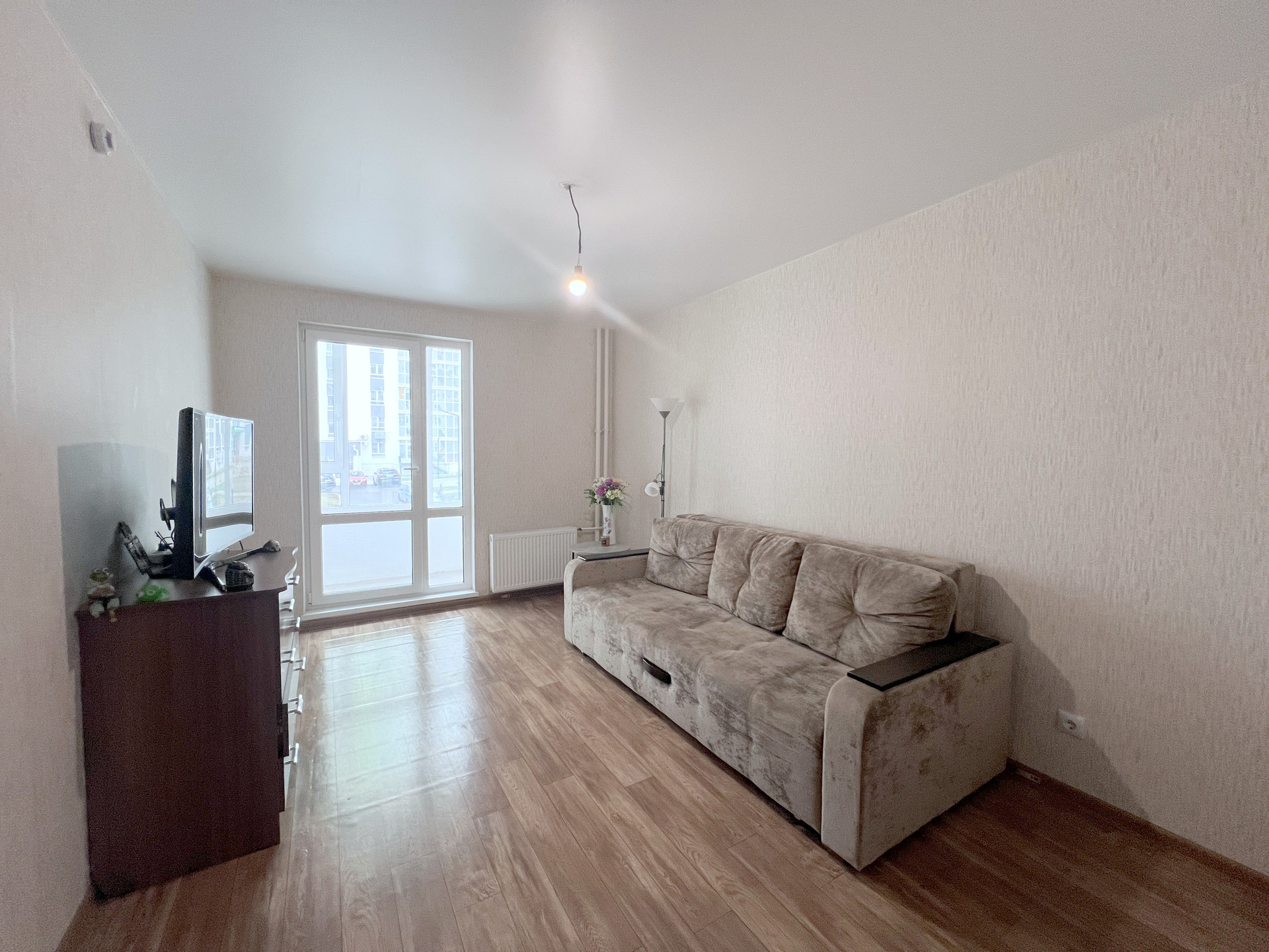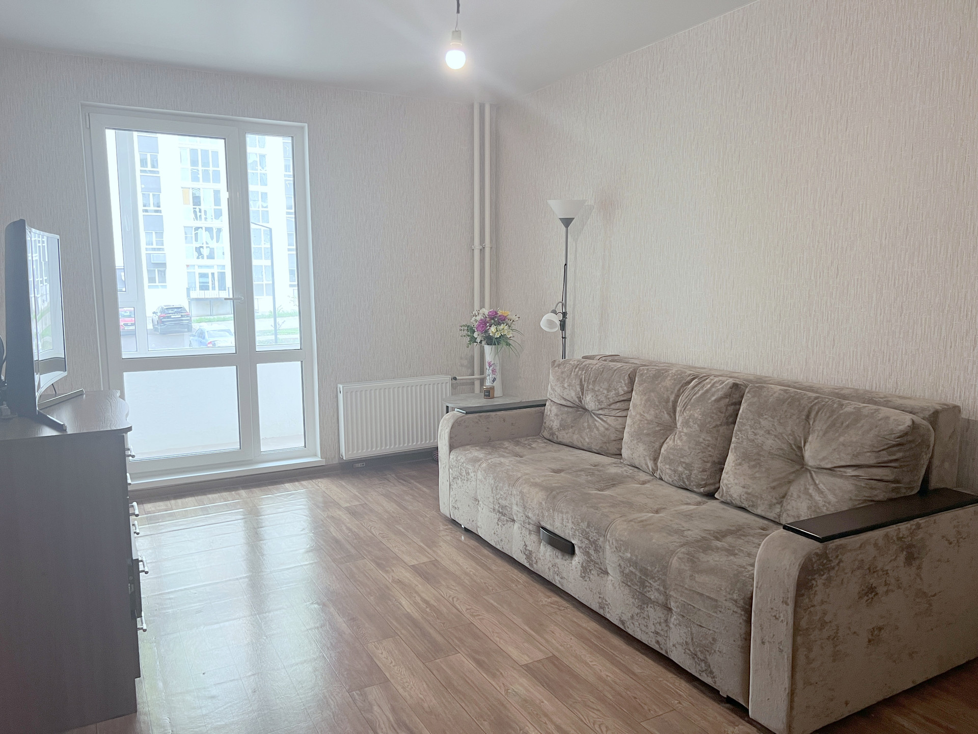 В квартире выполнен качественный социальный ремонт: натяжные потолки, на стенах обои в нейтральный тонах, на полу линолеум, на кухне и в ванной керамический фартук, новая электроплита. Окна пластиковые, лоджия также остеклена, выход на лоджию – витраж в пол.