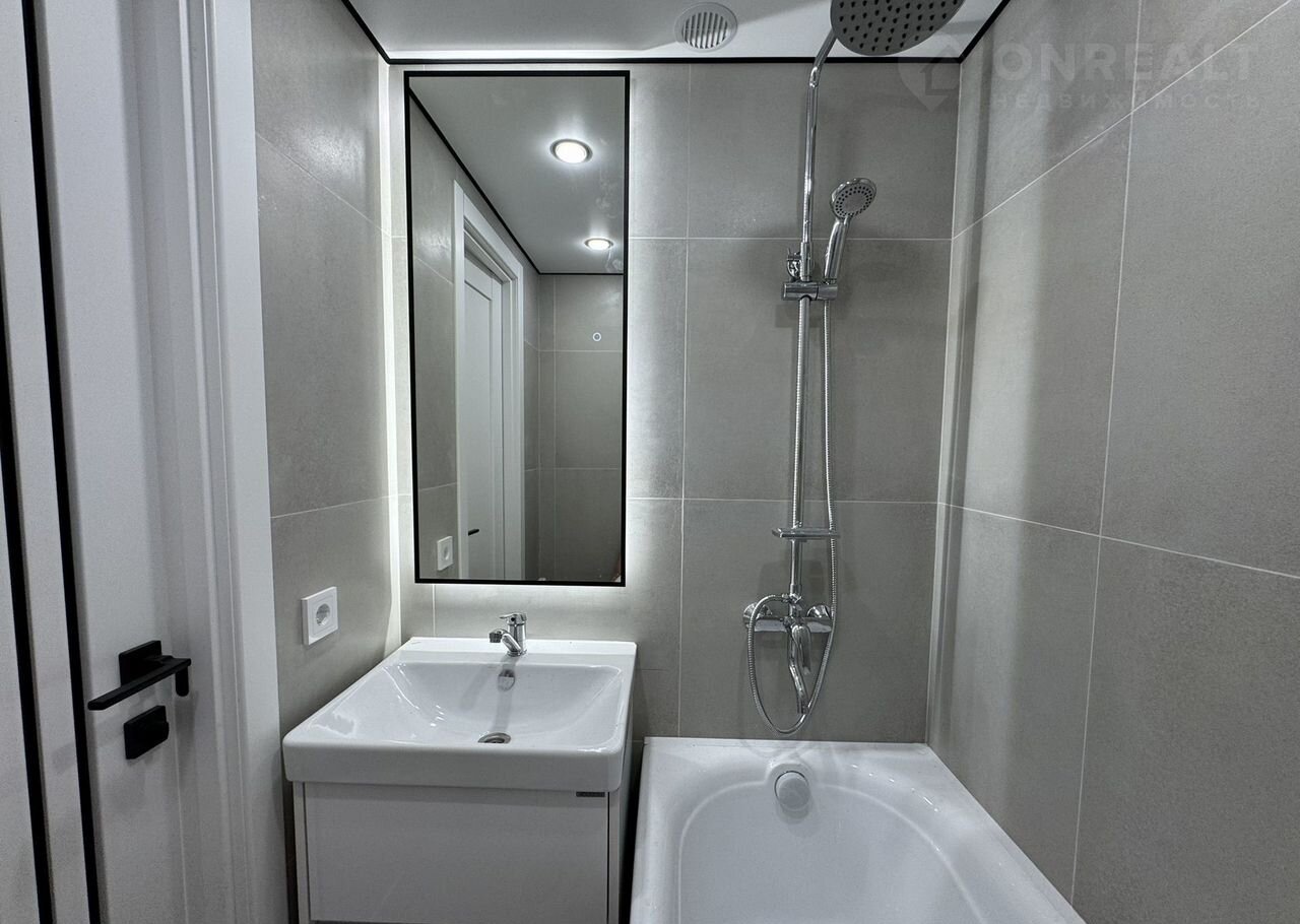 Санузел раздельный, подвесной унитаз с инсталляцией, раковина с тумбой, зеркало с подсветкой.