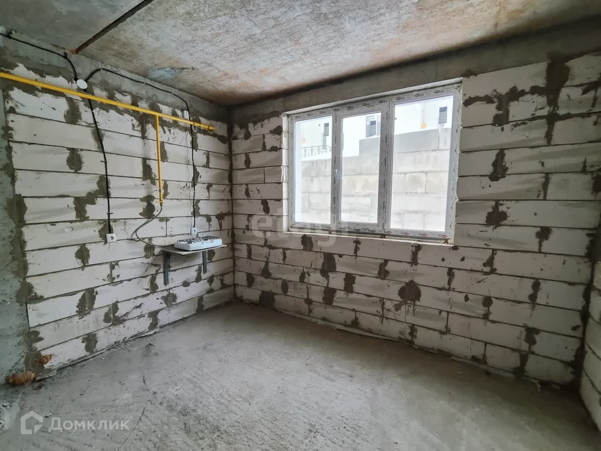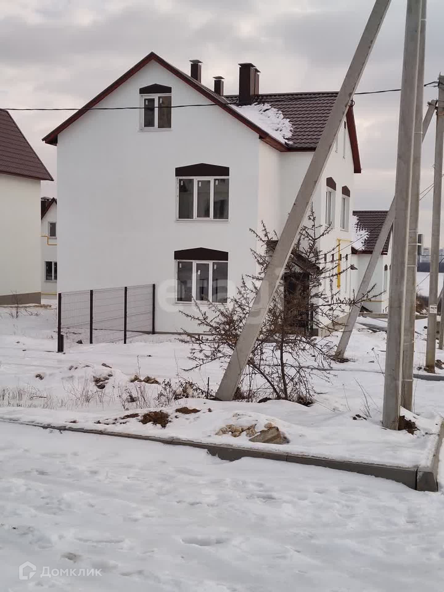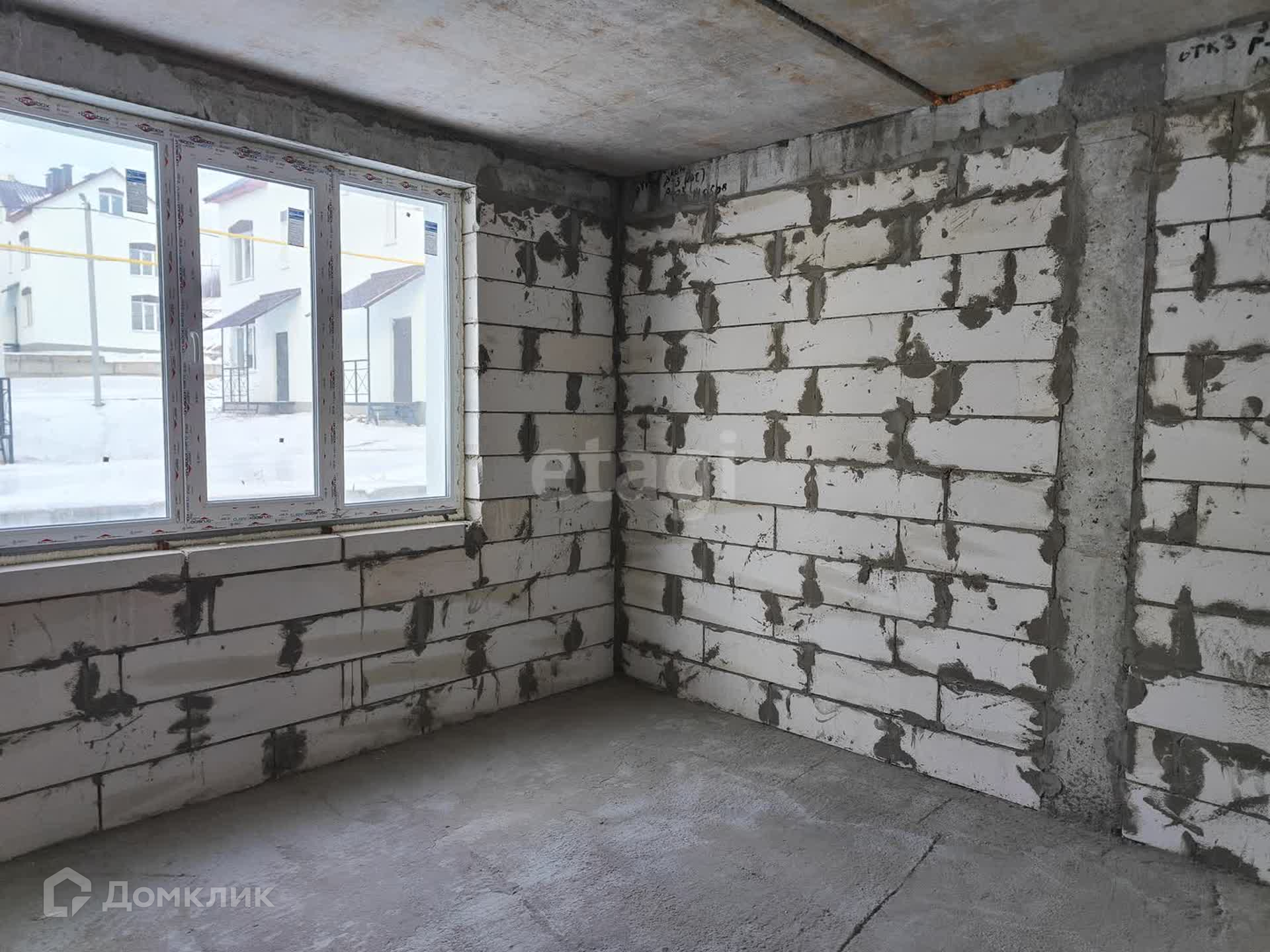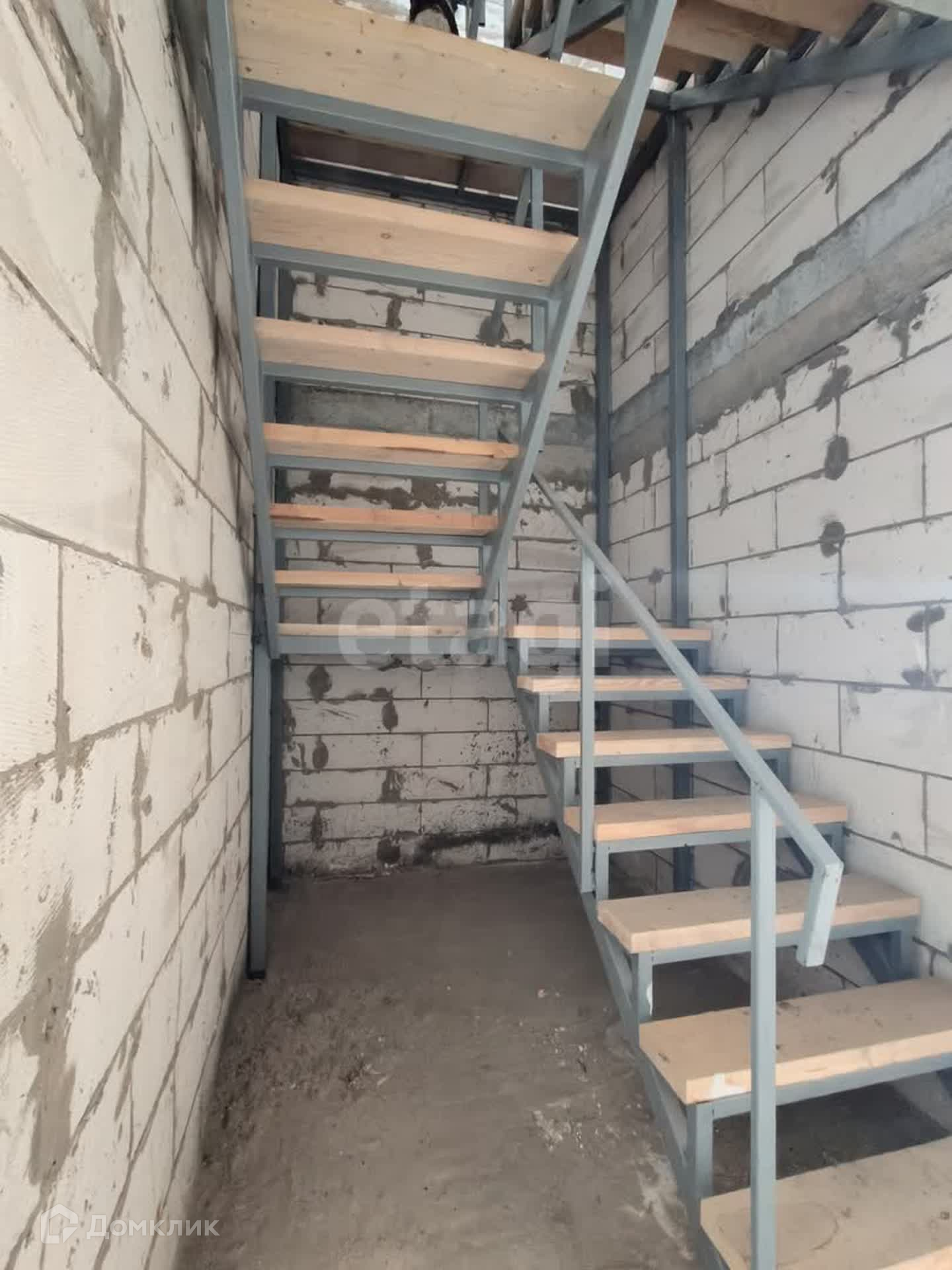 Монолитный каркас на ленточном фундаменте, стены - газосиликатные блоки, фасад утеплен, снаружи штукатурка, крыша - металлочерепица, дом без внутренней отделки, металлическая строительная лестница с перилами, пластиковые окна, металлические двери, пол/стяжка.