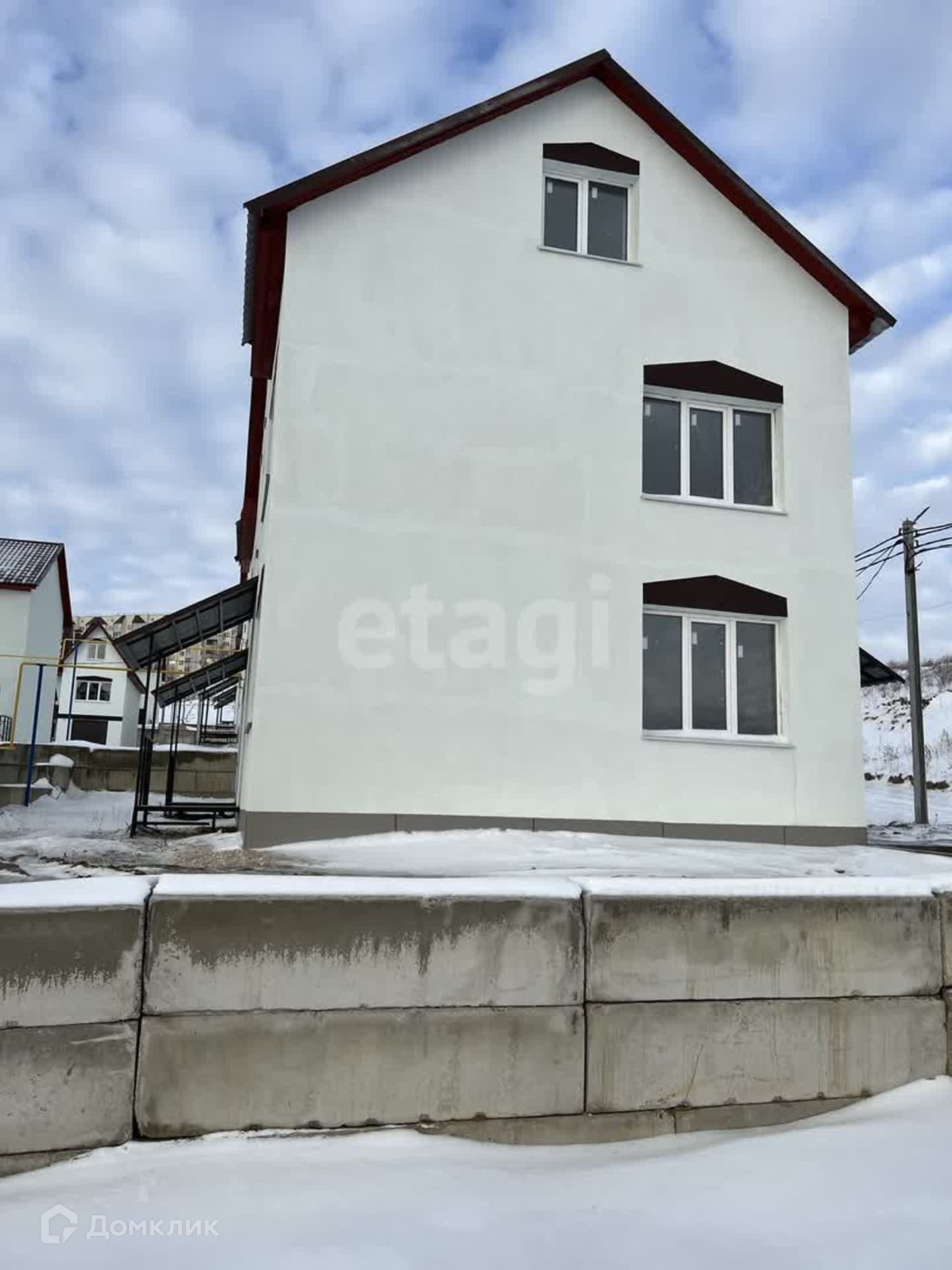 Монолитный каркас на ленточном фундаменте, блоки, фасад утеплен, снаружи штукатурка, крыша -металлочерепица, дом без отделки, все коммуникации подключены (электроэнергия, газ, вода, канализация), установлен двухконтурный котел.