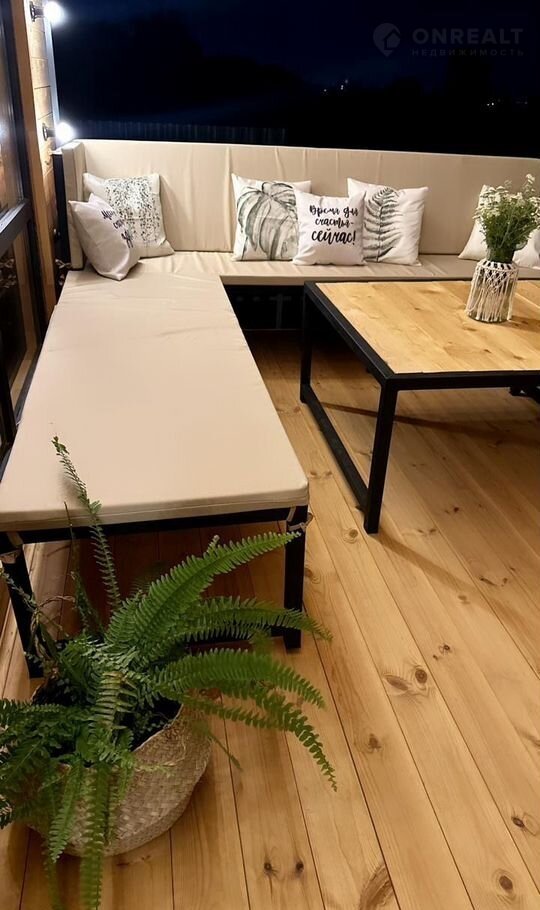 На веранде размером 3х6 метров установлен удобный большой диван с подушками и большой стол.