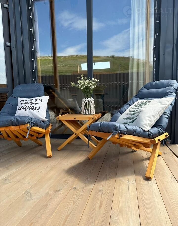 Веранда банного дома (2х7) оснащена 2 удобными креслами Кентукки с подушками и мини-столиком, а также мангалом, решеткой барбекю и шампура.