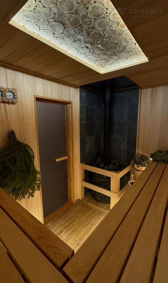 В парной установлена чугунная печь (Искандер) с подачей мелкодисперсного пара, набором банных ведер, ковша. Печная зона отделана оздоровительным камнем-минералом (талькохлорит), потолок с можжевеловым панно.