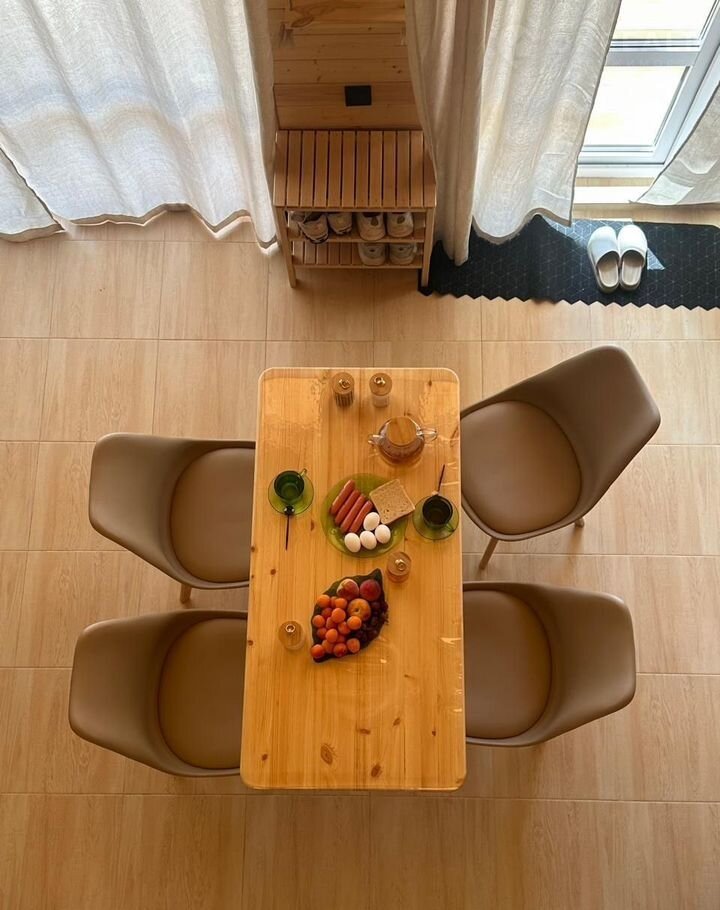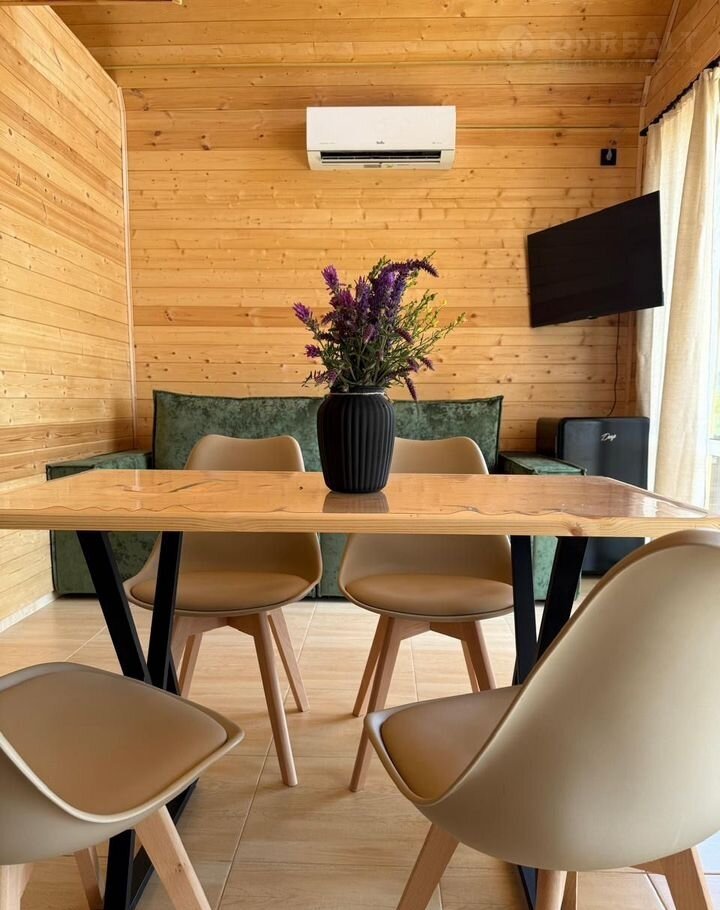 Гостиная на 1 этаже оснащена кухонной зоной, обеденным столом с удобными стульями, раскладным диваном (160х200) с постельным бельем, телевизором, холодильником, вешалкой для одежды и этажеркой для обуви.