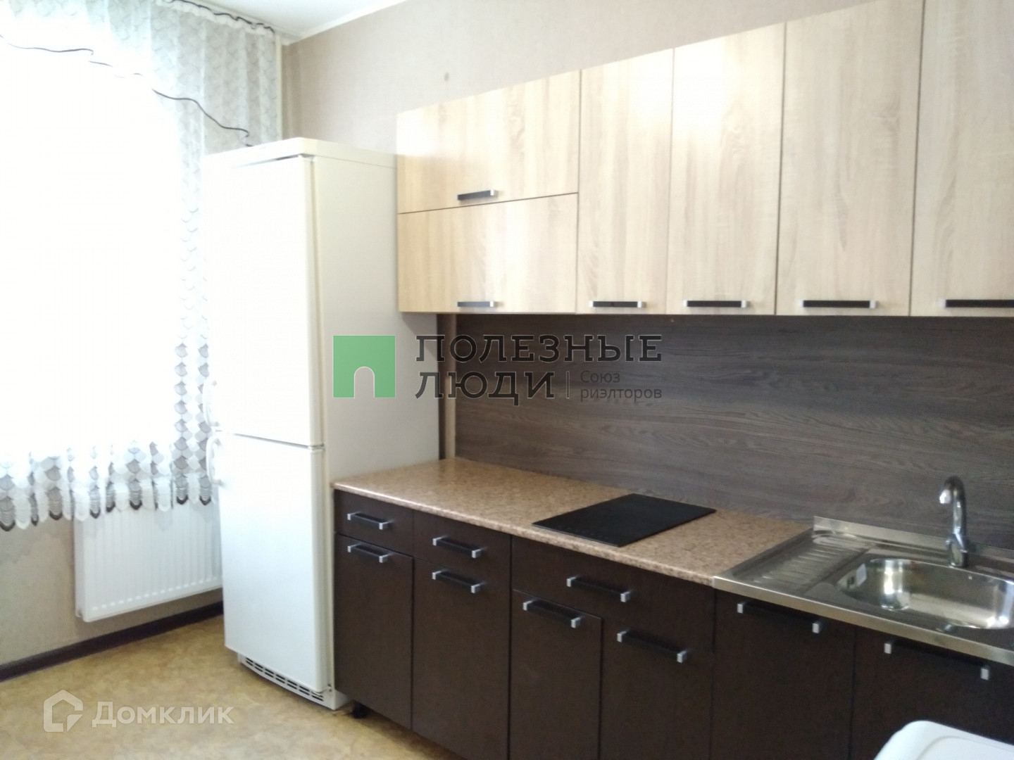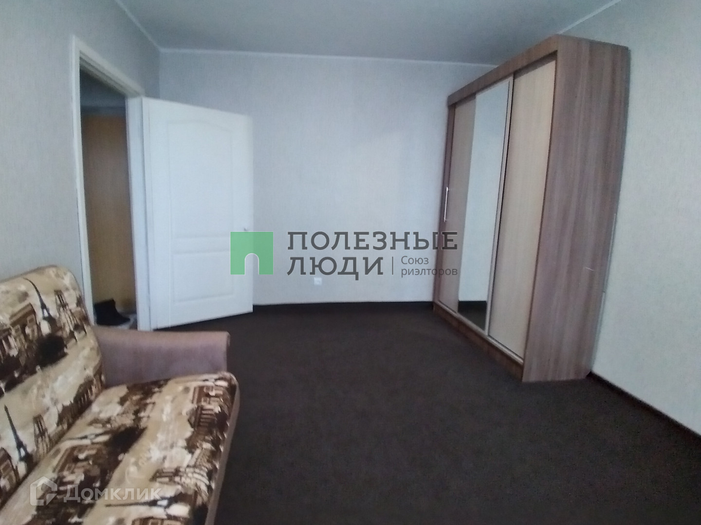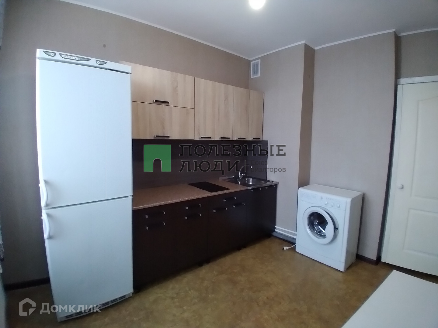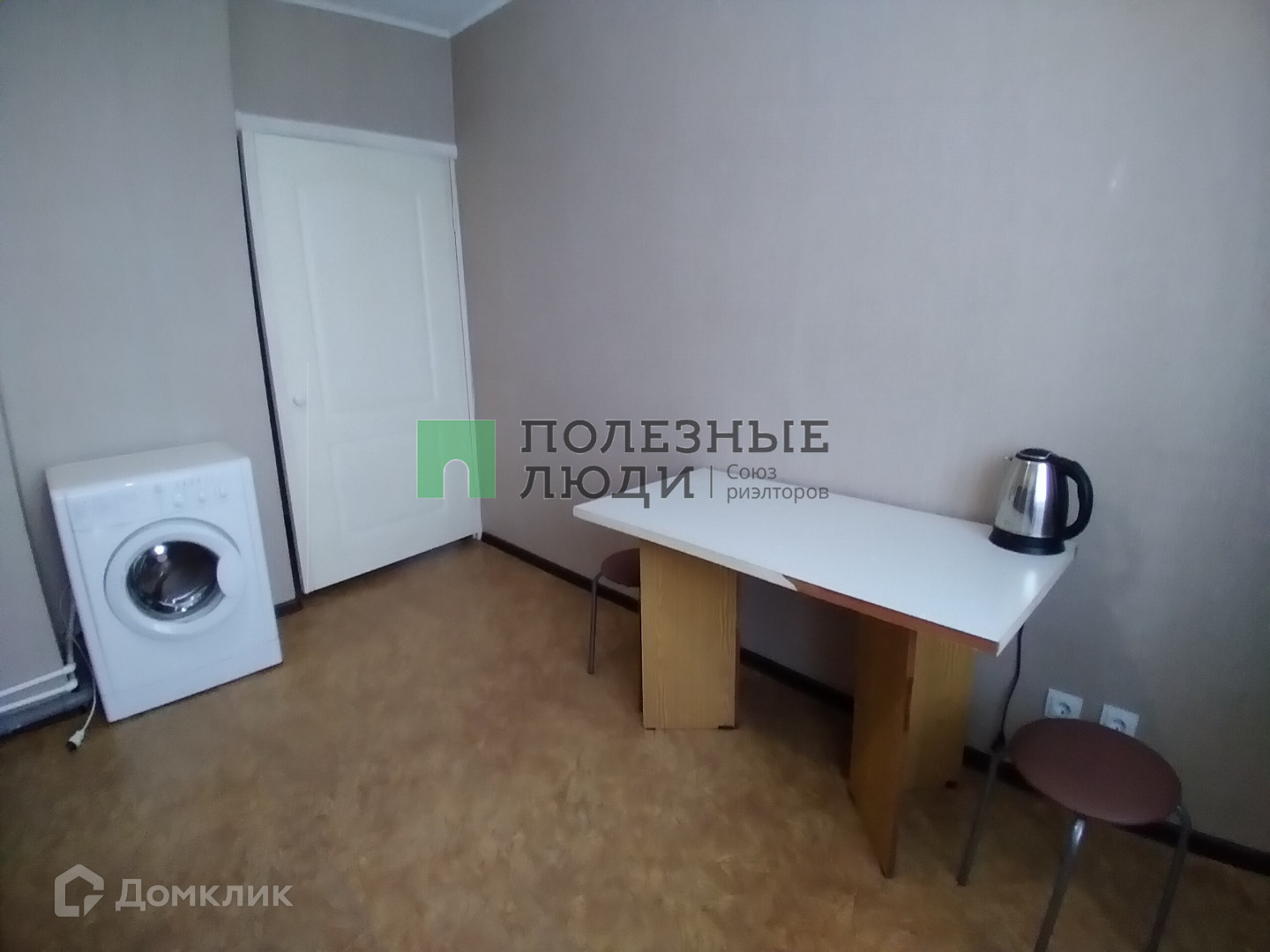 В квартире установлена кухня с электрической панелью, холодильник, стиральная машина , стол , табуреты , двухместный диван, шкаф-купе для одежды.