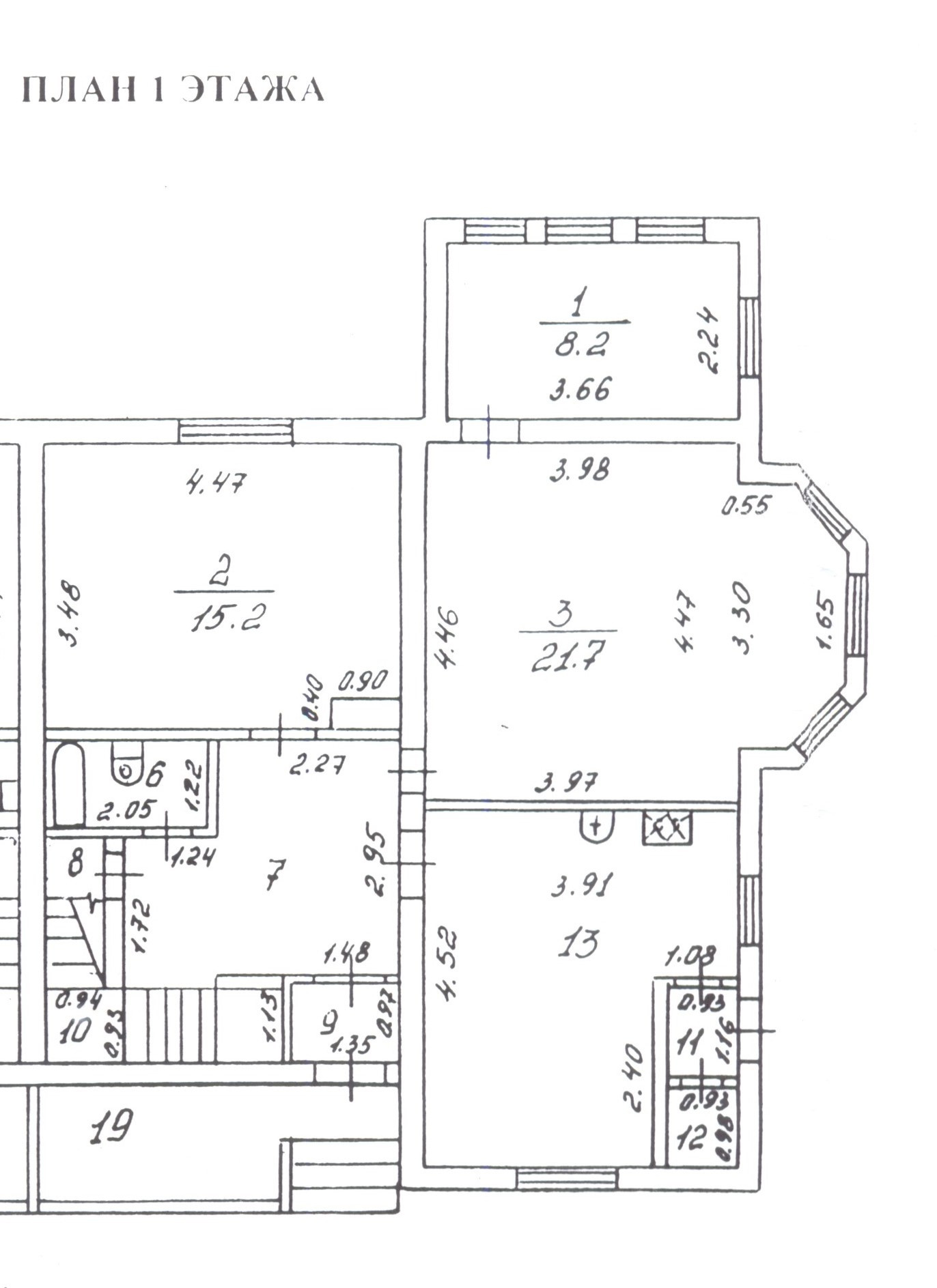 - на первом этаже: кухня 15.1 кв.м. с кладовой и дополнительным выходом в сад, три жилых комнаты (21.7, 8.2, 15.2 кв.м.), санузел 2.5 кв.м., крытое крыльцо, тамбур и дополнительная кладовая;