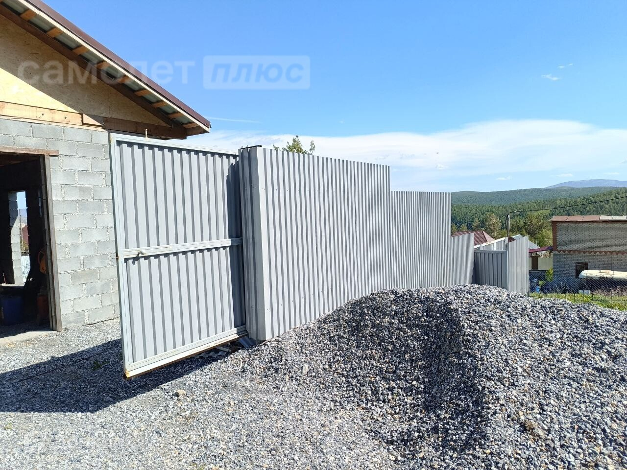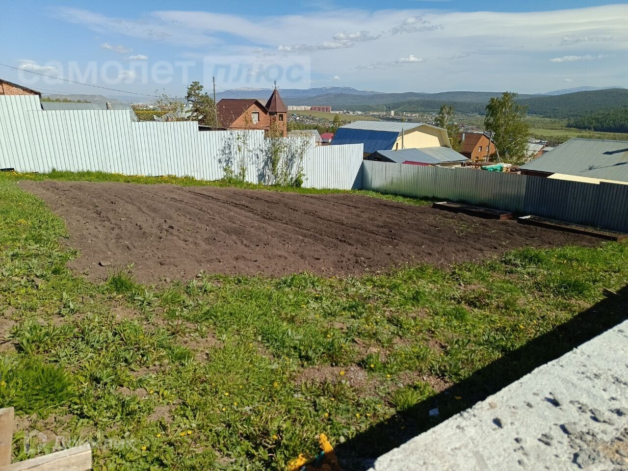 Участок полностью огорожен профнастилом, откатные ворота с возможностью подключения (автоматические), построен гараж 6х7,5 кв.м., фундамент под дом 10,5х10,5 кв.м., заведено электричество 380В, пробурена скважина, разработанная земля для огорода.