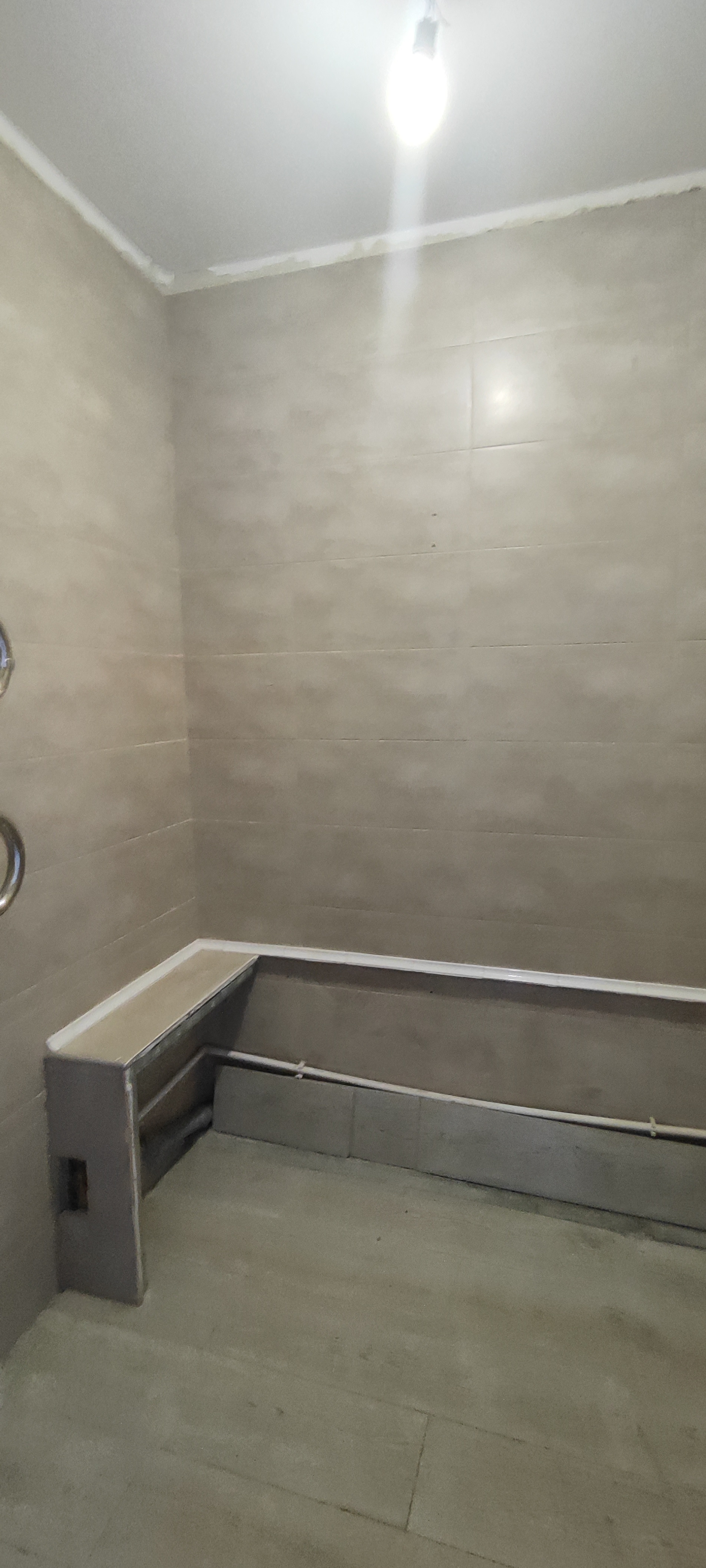 Сан узел отделан кафелем, стены и полу выровнены.