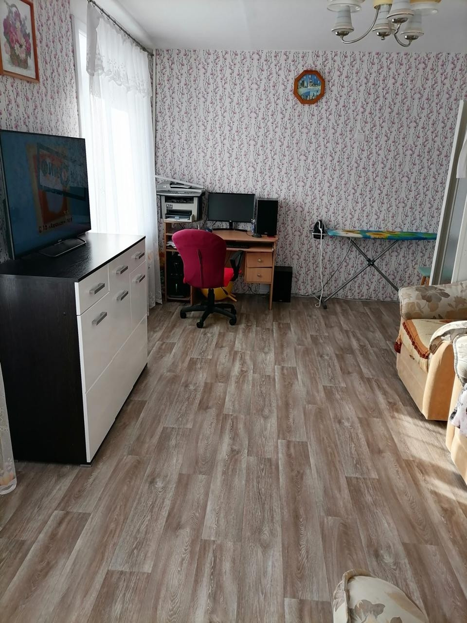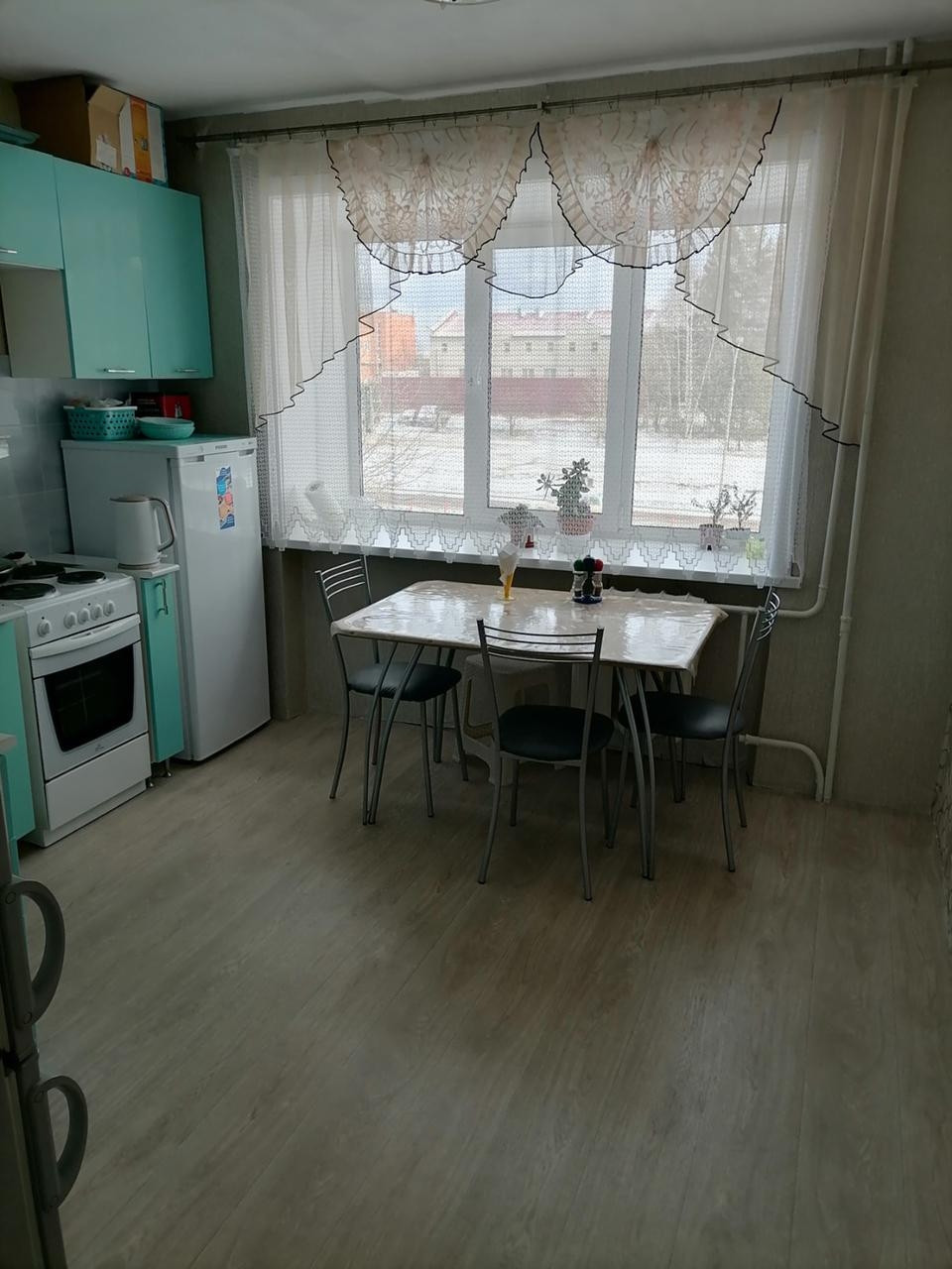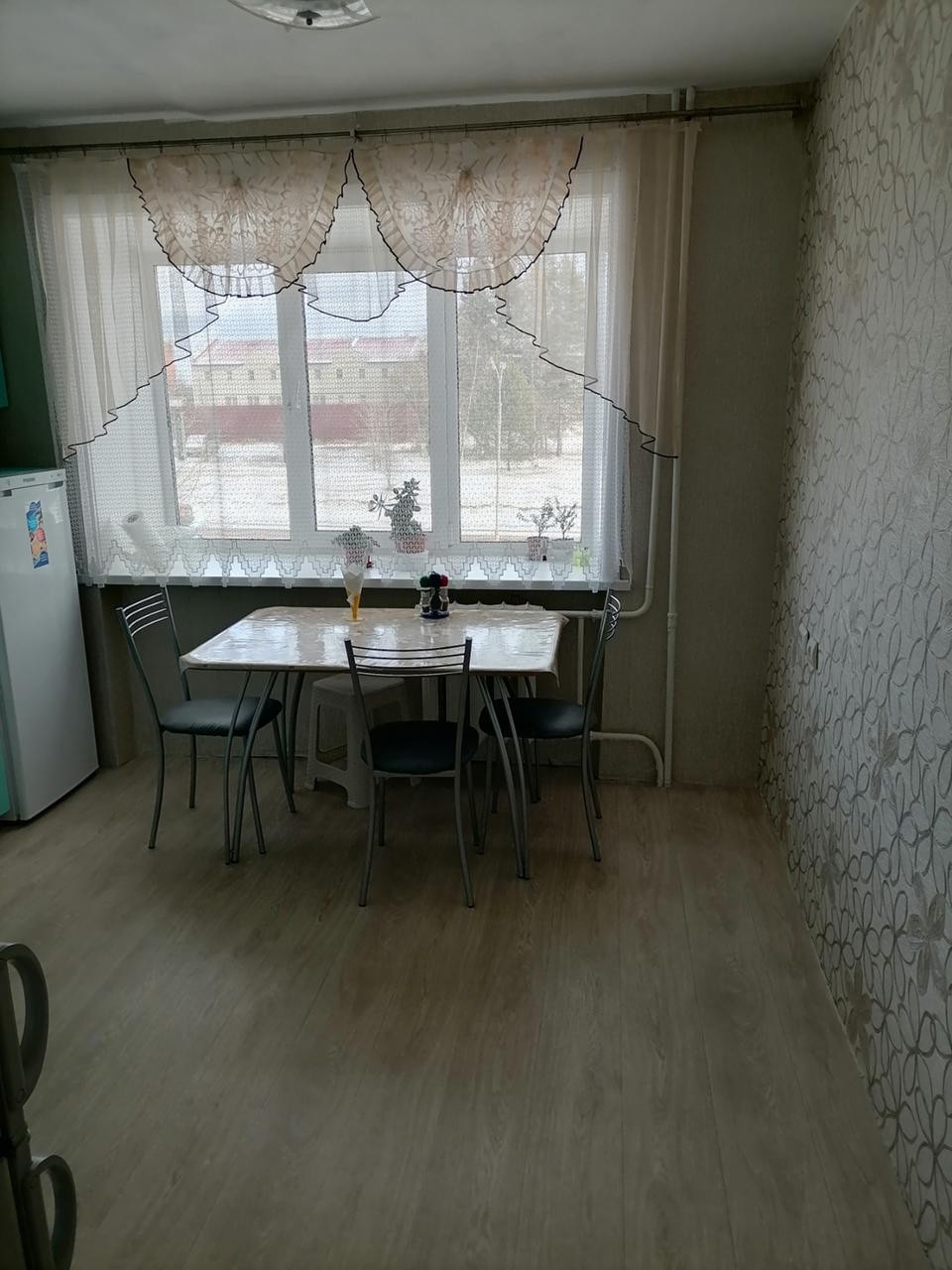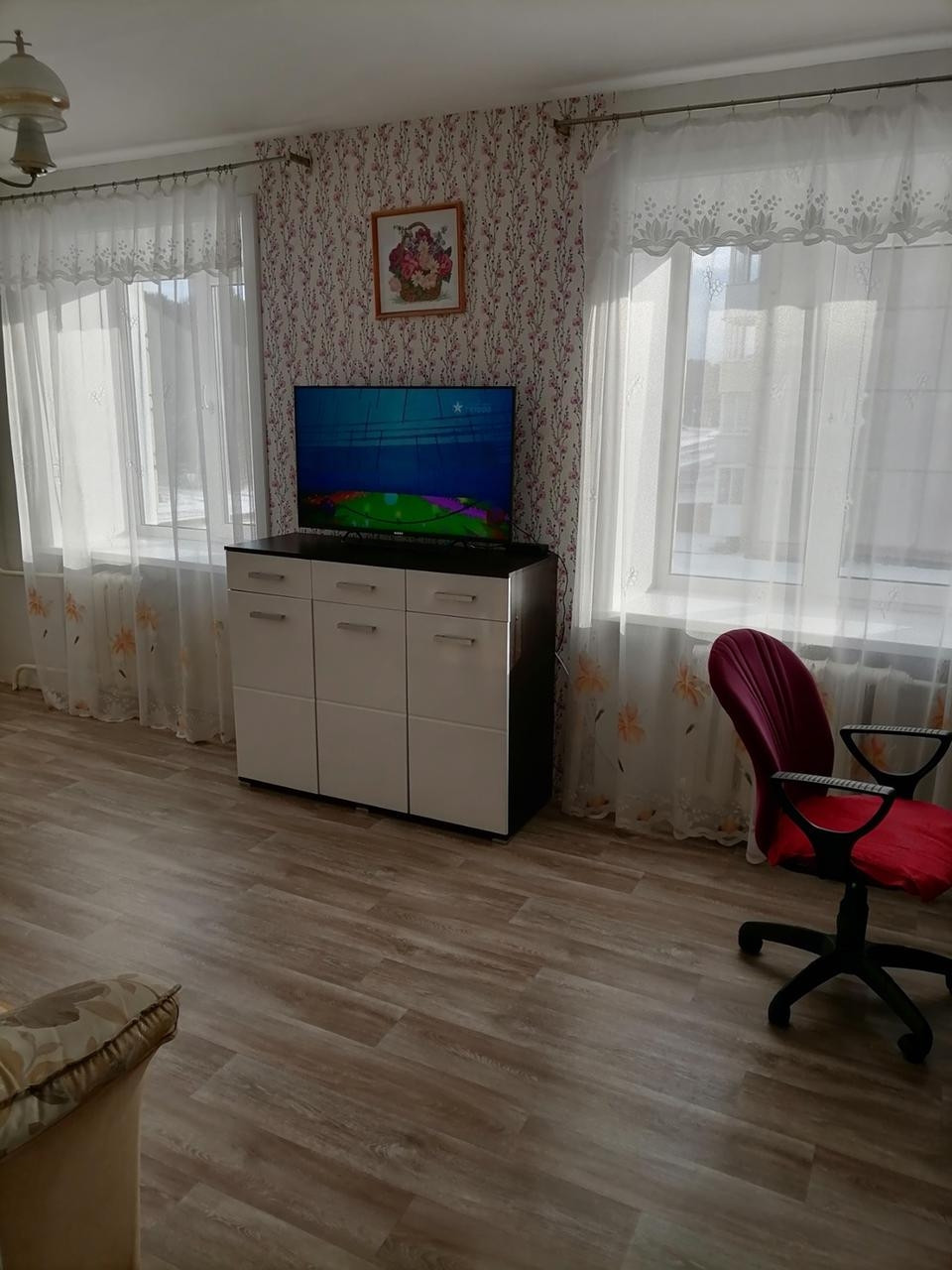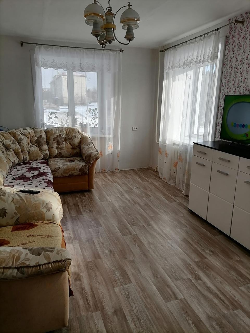 По всей квартире установлены пластиковые окна, на полу лежит ленолиум новый. Потолки побелка.
