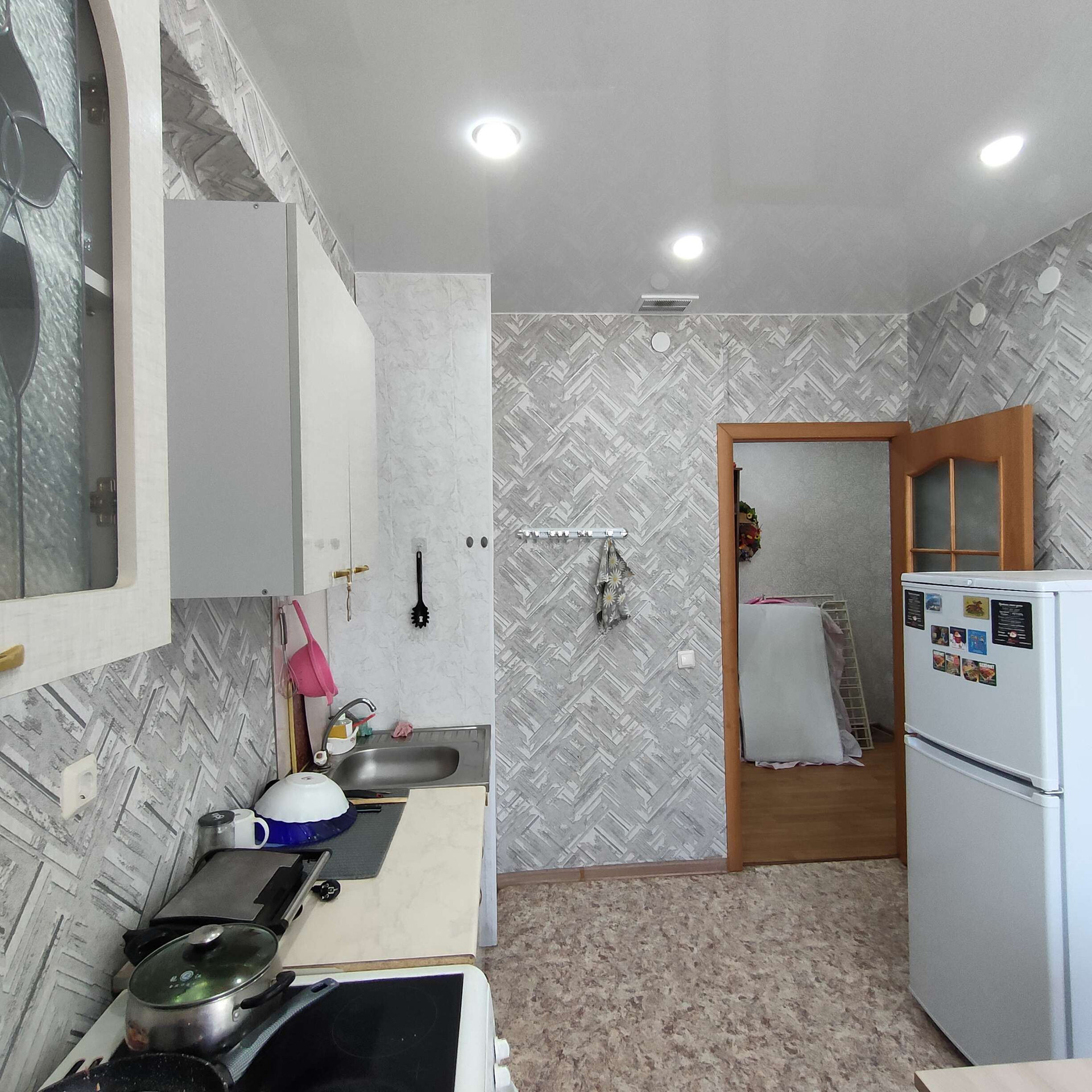 По всей квариинре натяжные потолки, окна пластиковые, межкомнатные двери среднего образца, на пооу лежит ленолиум, туалет и впнна совместный- ремонта нет, но само ромещение очень большое.