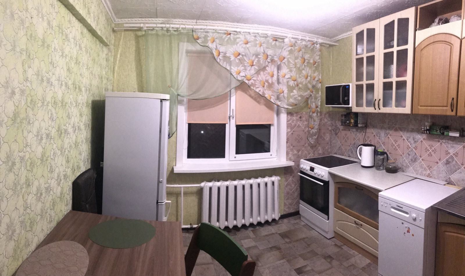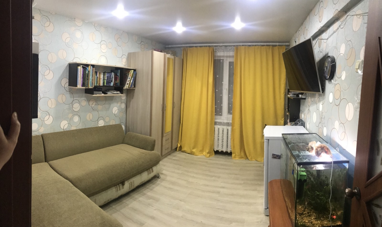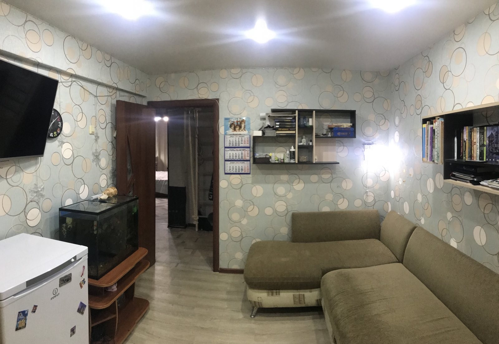 Окна евро, пол линолеум, 1 натяжной потолок в зале, м/двери нового образца, ванная комната стеновые панели.