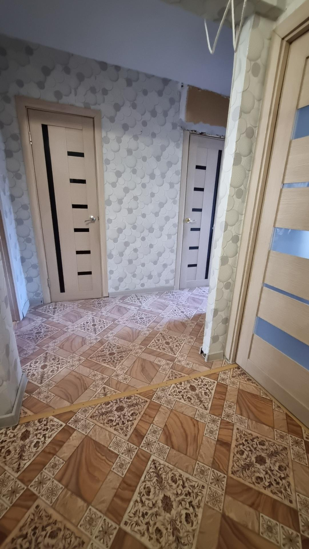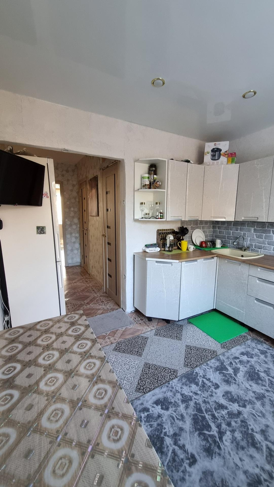 Натяжной потолок на кухни, в комнатах выровнен идеально. Межкомнатные двери нового образца,евро.