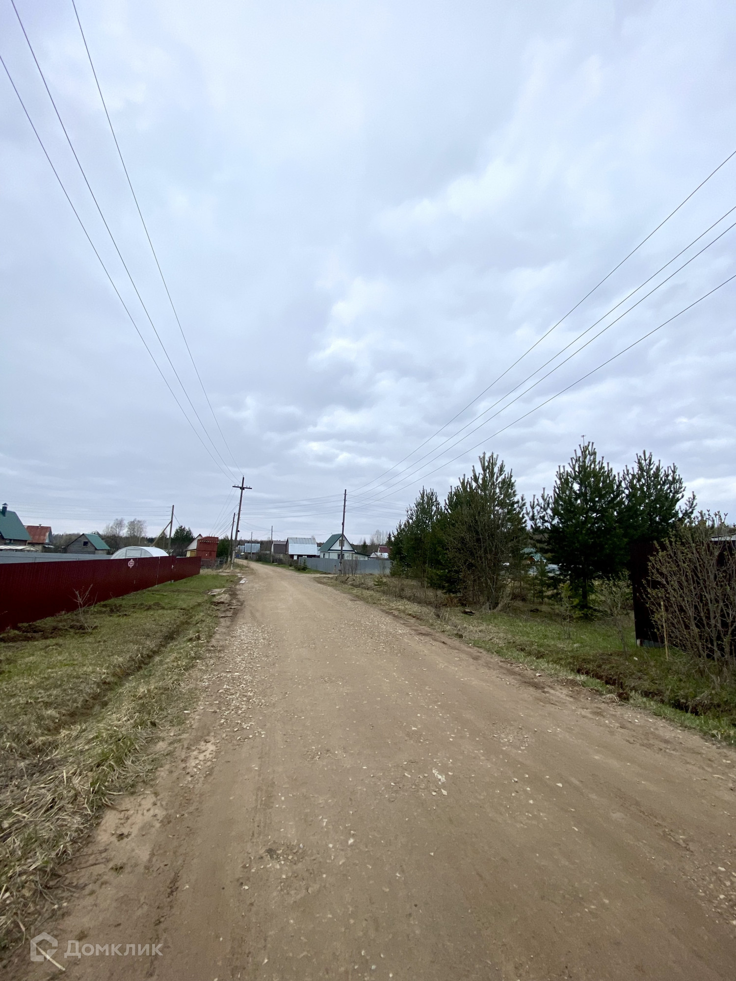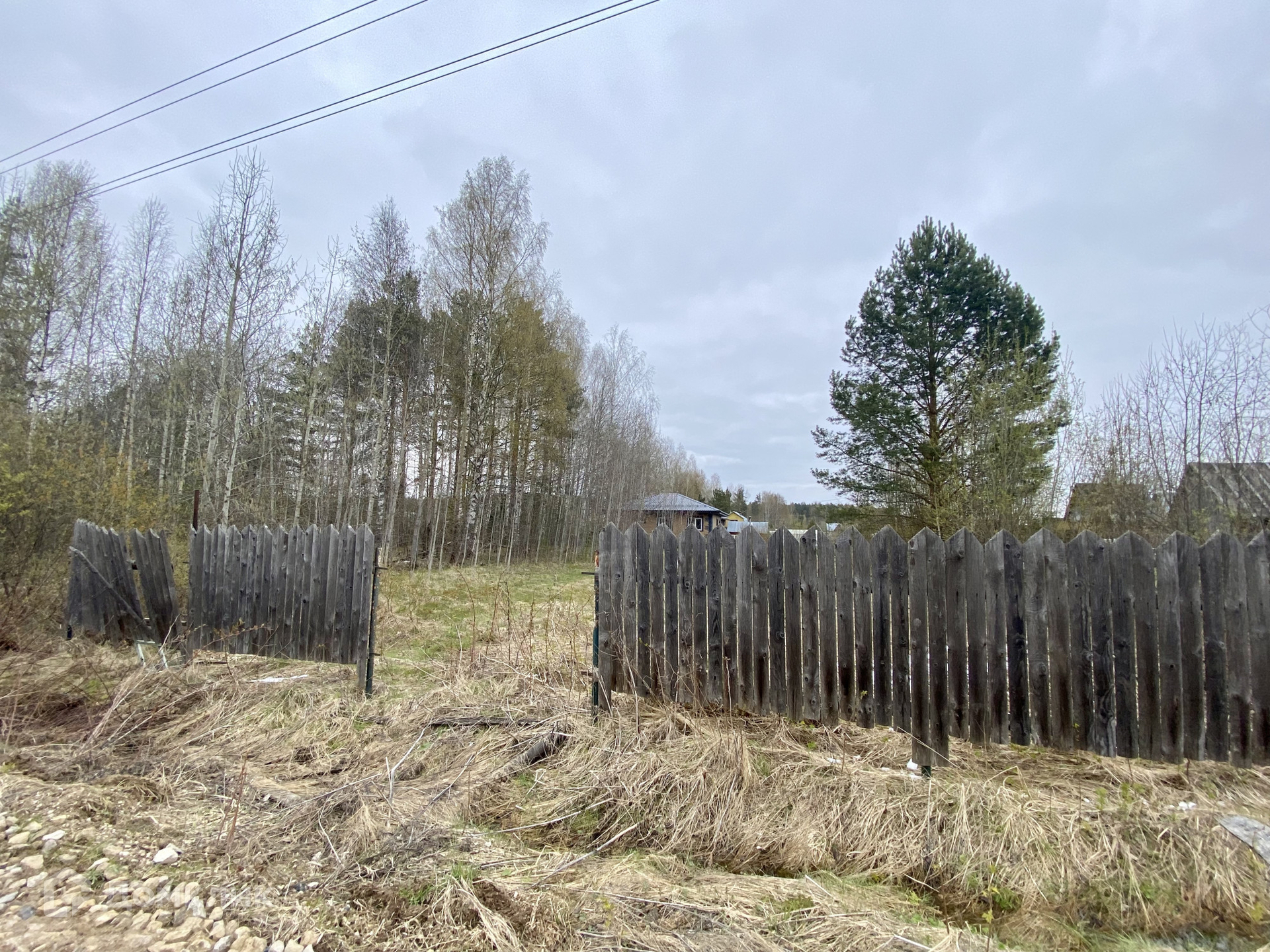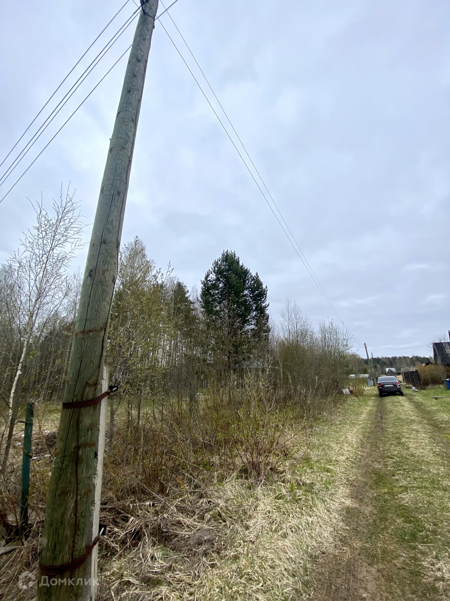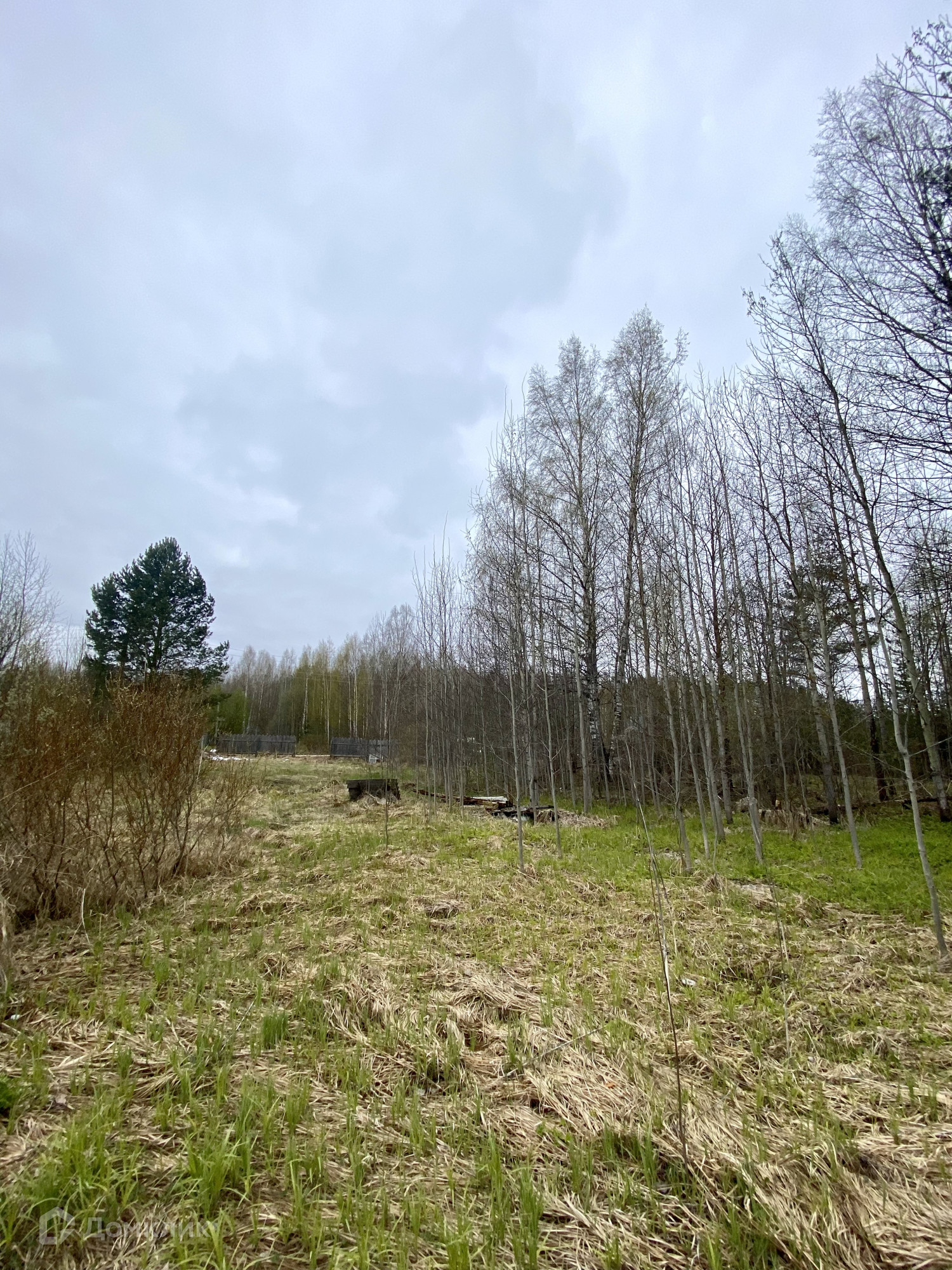 Участок правильной формы и на возвышенности, на котором выкопано место для  фундамента дома 6х6 и имеются блоки для цоколя и скважина глубиной 25 метров, деревья - сосны, берёзки, между которыми можно поставить дом, на участке есть эл столб.