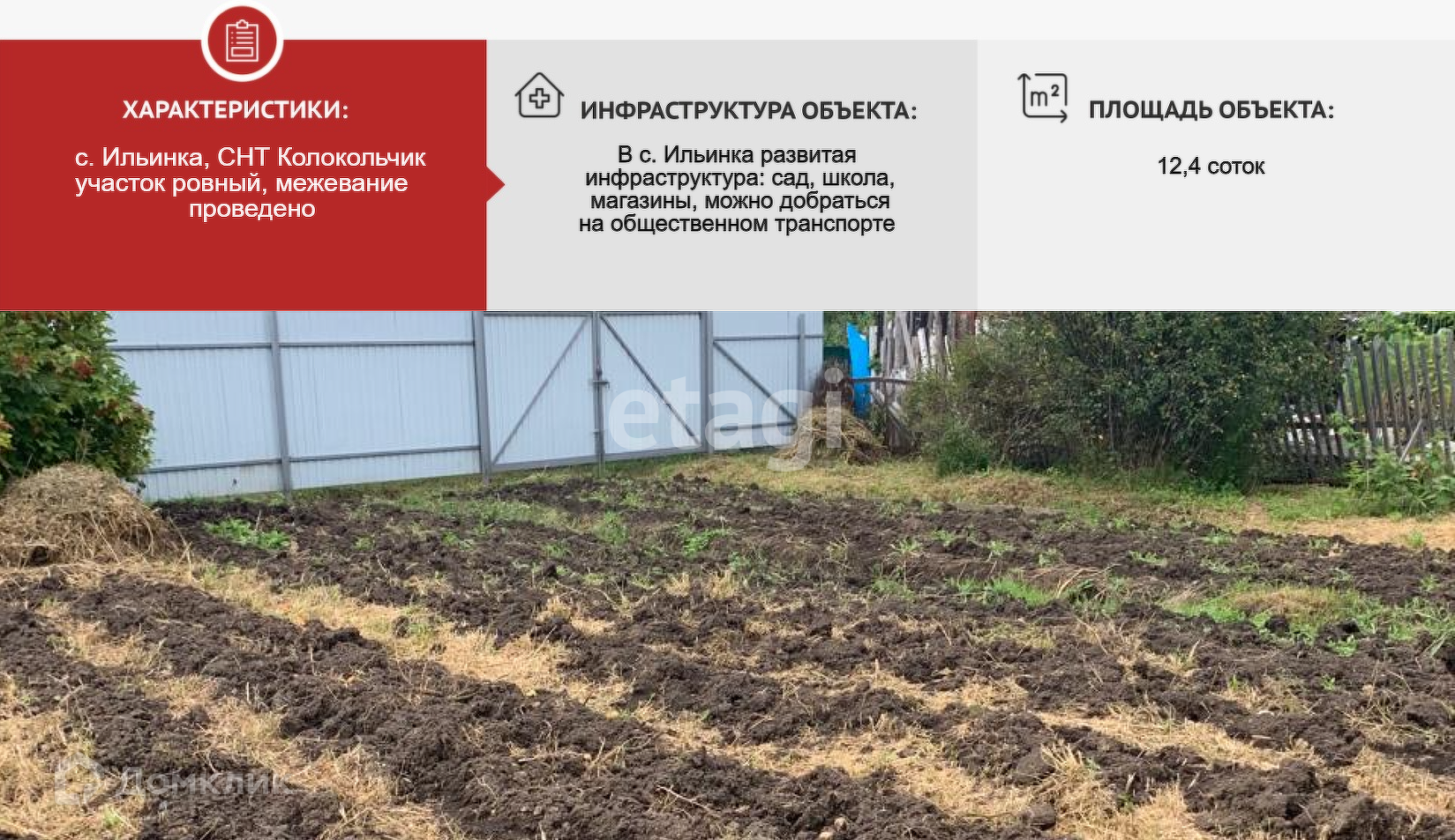Продается земельный участок площадью 12,4 соток в с. Ильинка, сдт. Колокольчик. Межевание проведено, участок ровный, огражден со стороны улицы новым забором, имеются подъездные пути, проведено электричество, столб рядом с участком. На участке имеется недостроенный двухэтажный дом 48 кв.м. (возможно строительство другого дома), теплица, очень много насаждений: малина, белая и черная смородина, яблоня, вишня, облепиха, жимолость, калина. Рядом в с. Ильинка вся инфраструктура: школа, детский сад, магазины. Можно добраться на общественном транспорте. Один собственник. Поможем с оформлением ипотеки. Номер в базе: 10786283. Район: Колокольчик СДТ