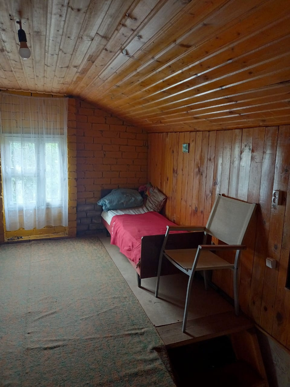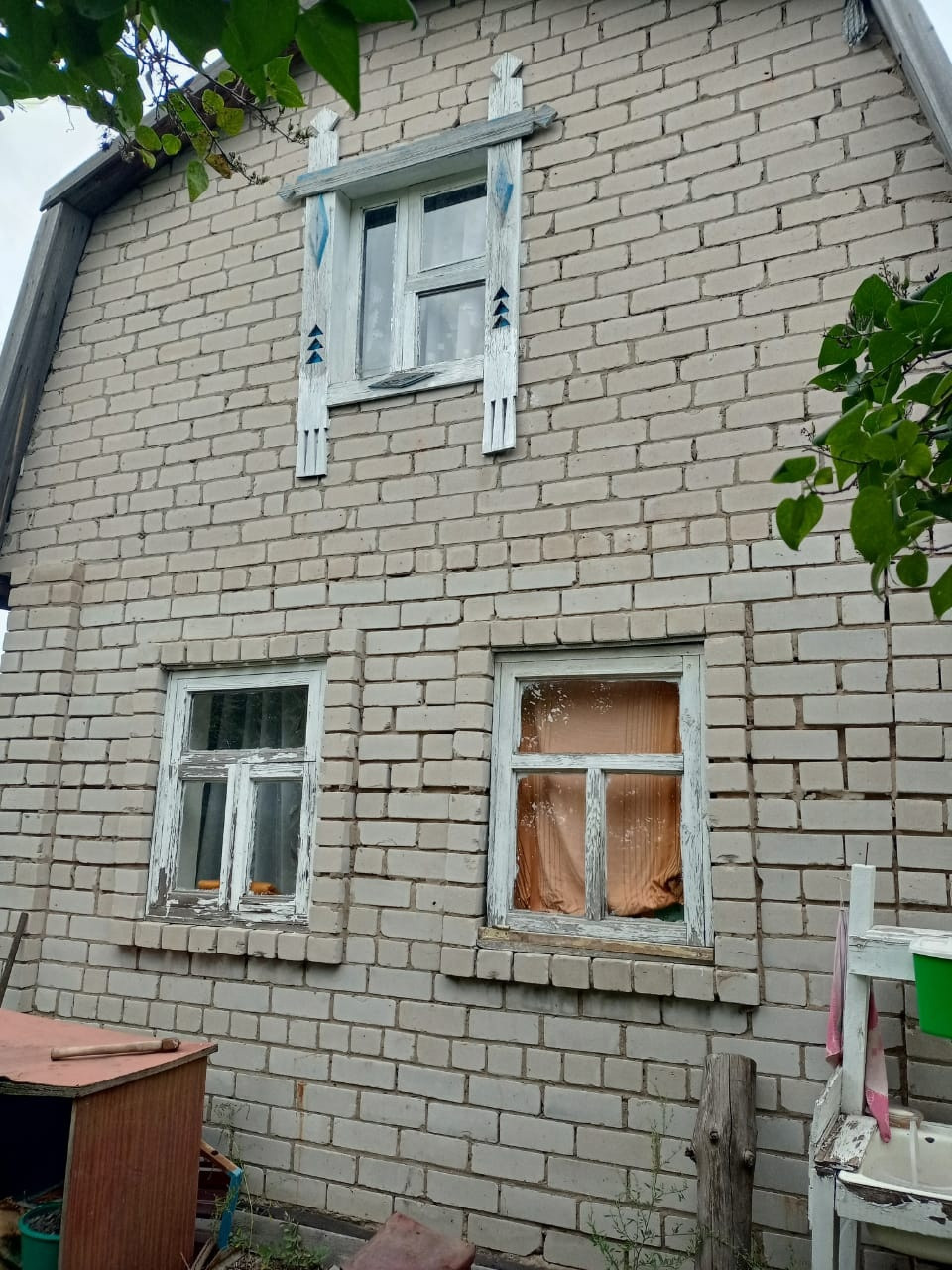 На участке двухэтажный садовый дом S = 40 кв.м из кирпича, пеноблоков и дерева. На первом этаже кухня и комната, на втором – комната.