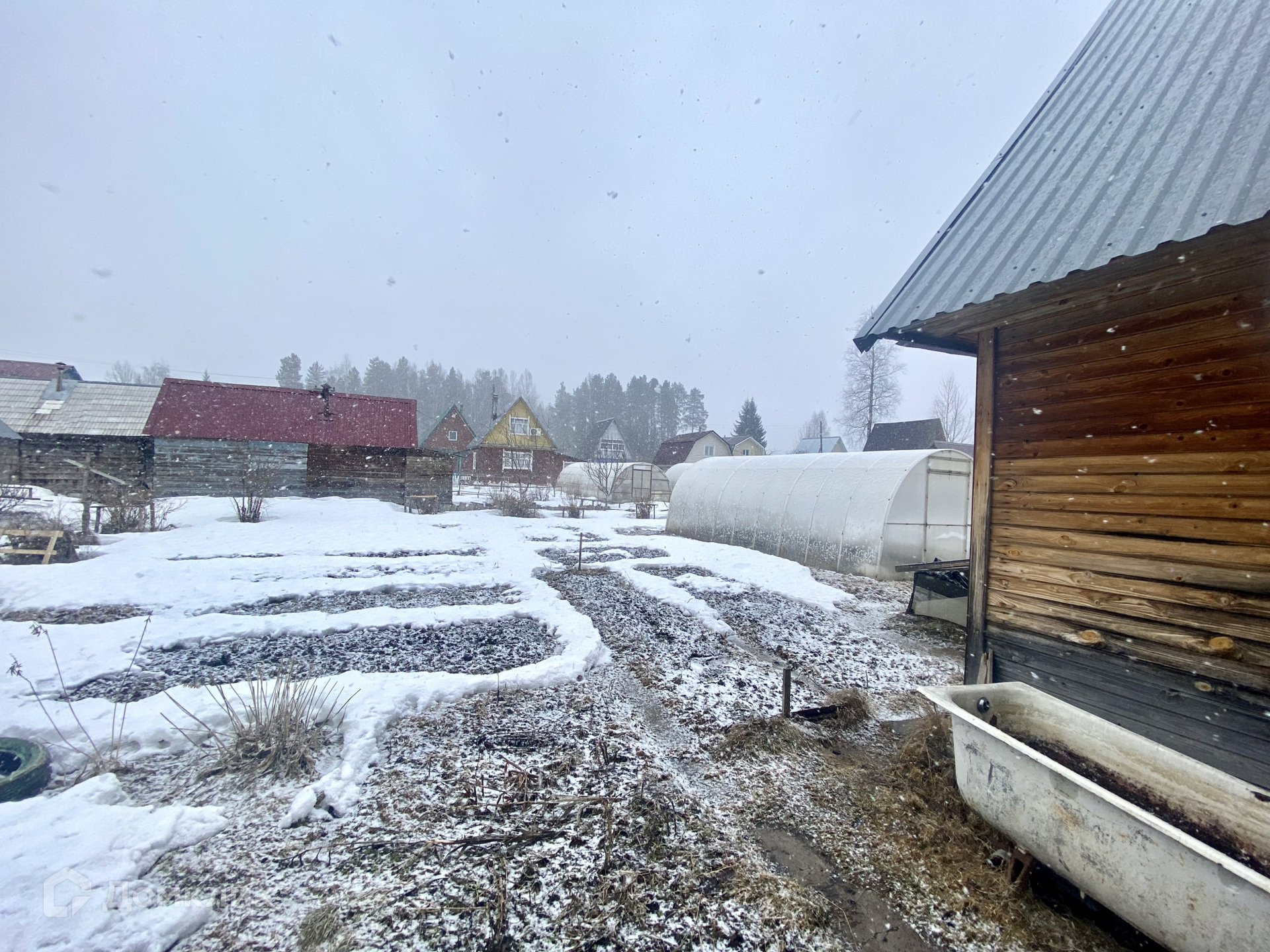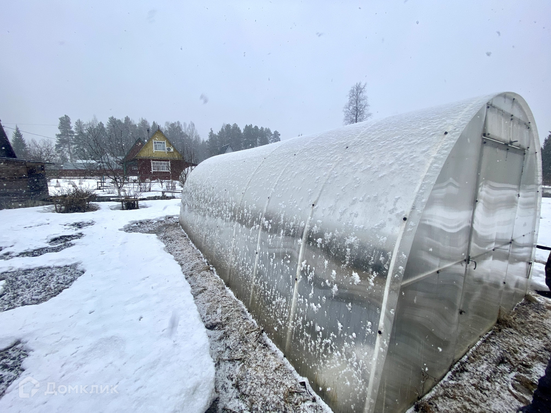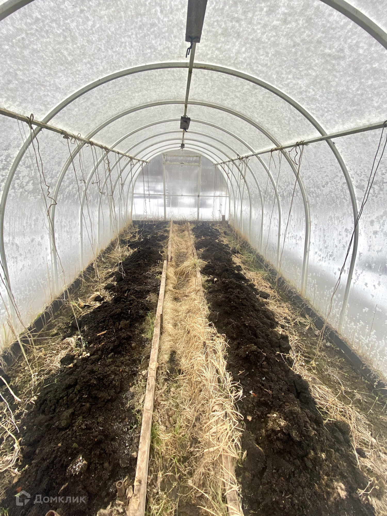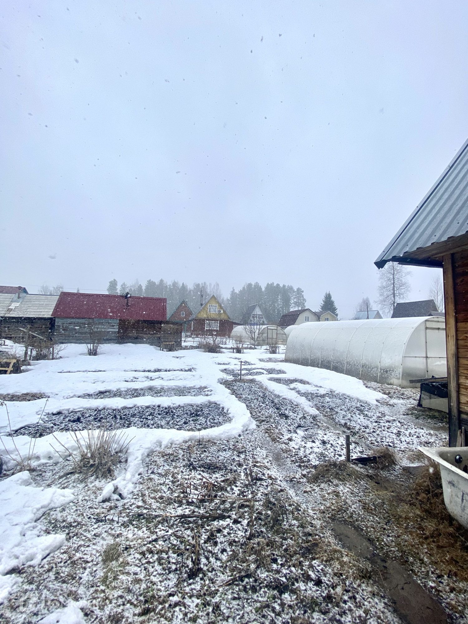 на территории поставлена теплица из поликарбоната 3х8 - земля вся удобрена, привезён опил+песок+торф, парники под плёнку, 2 большие бочки для полива.