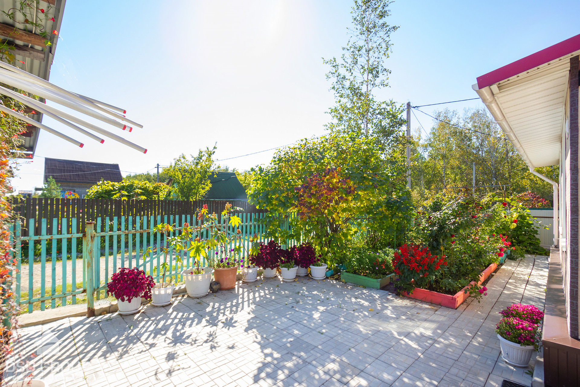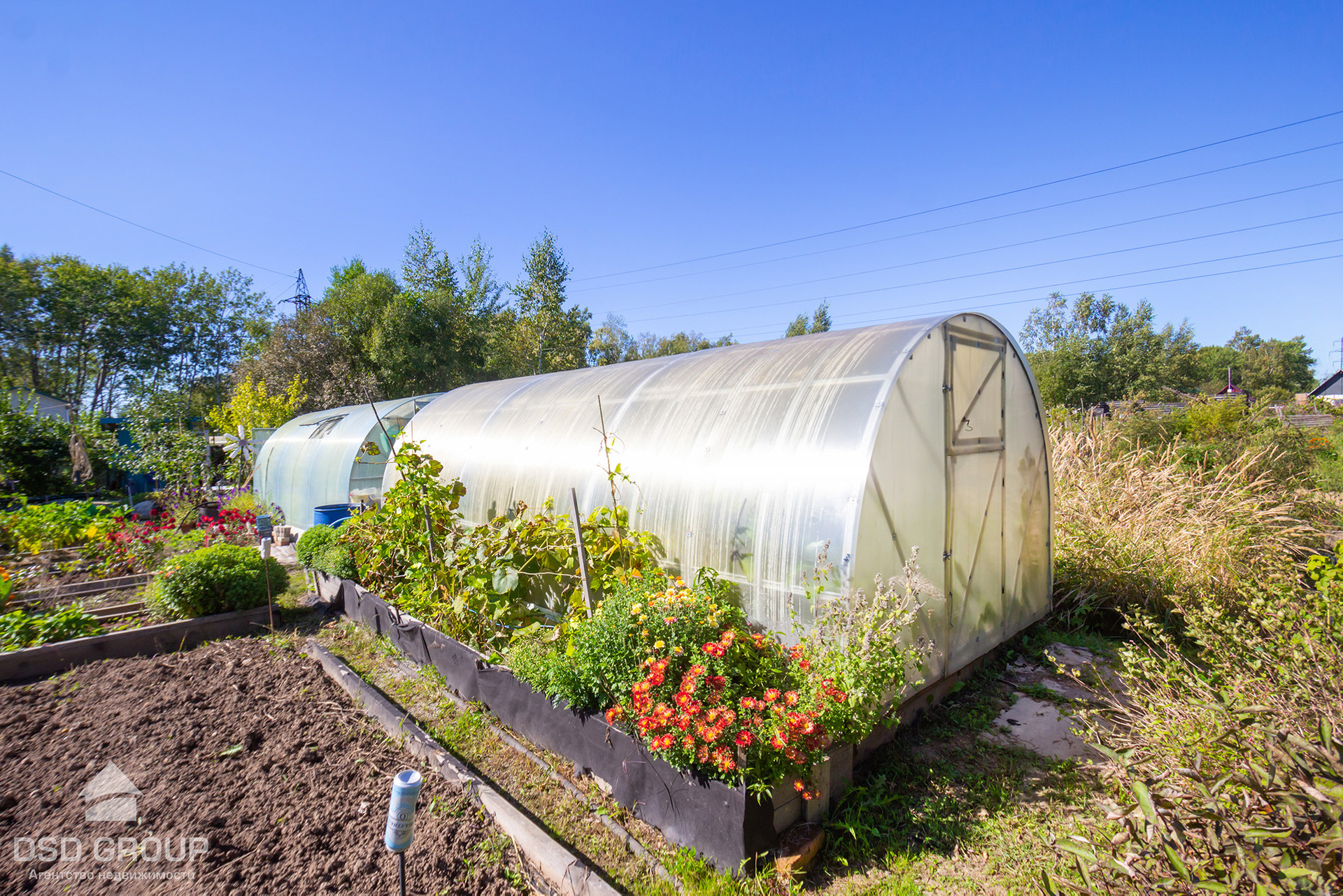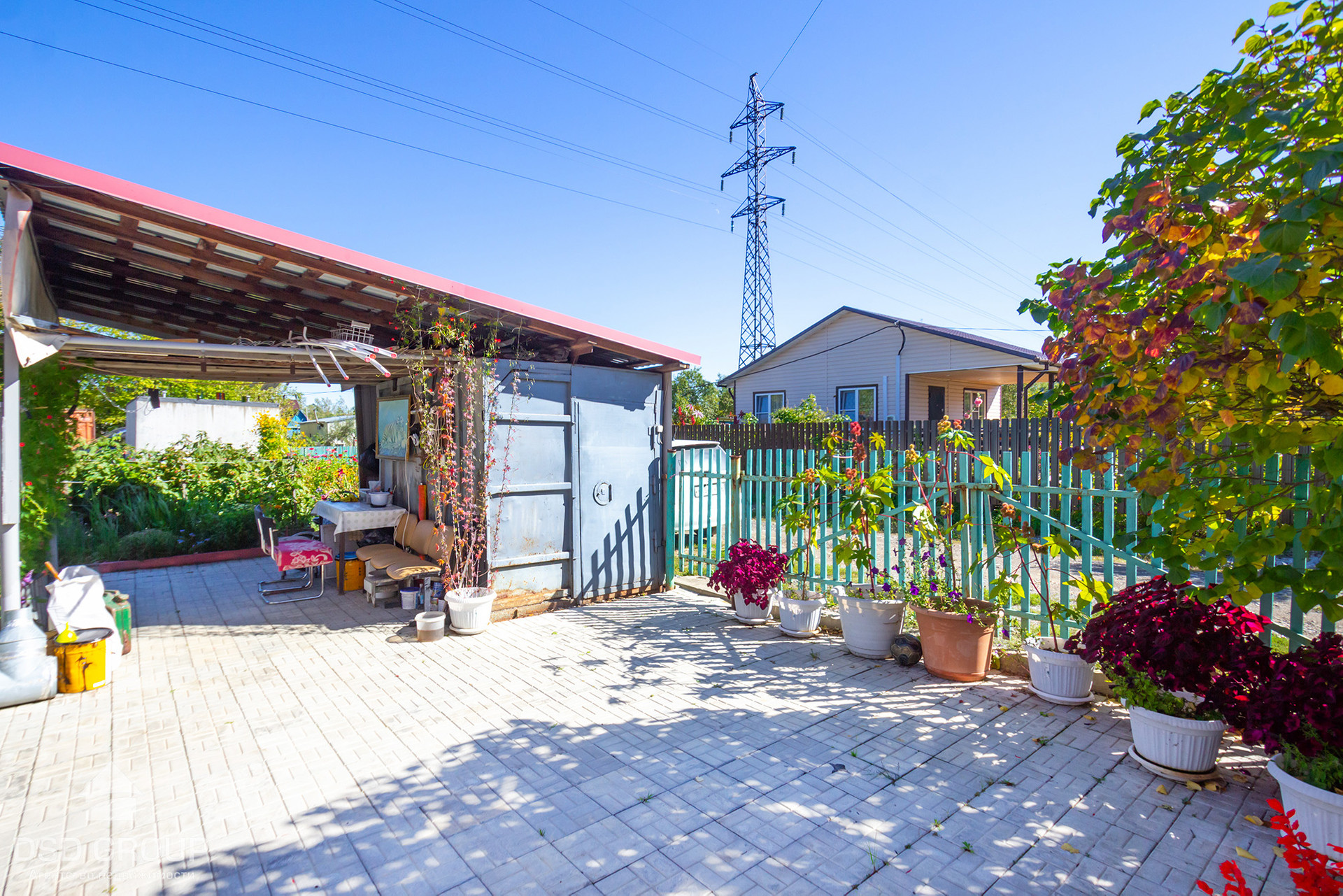 -Придомовая территория и зона барбекю выложена брусчаткой. Есть контейнер для хранения хоз.инвентаря, гараж , две большие теплицы.