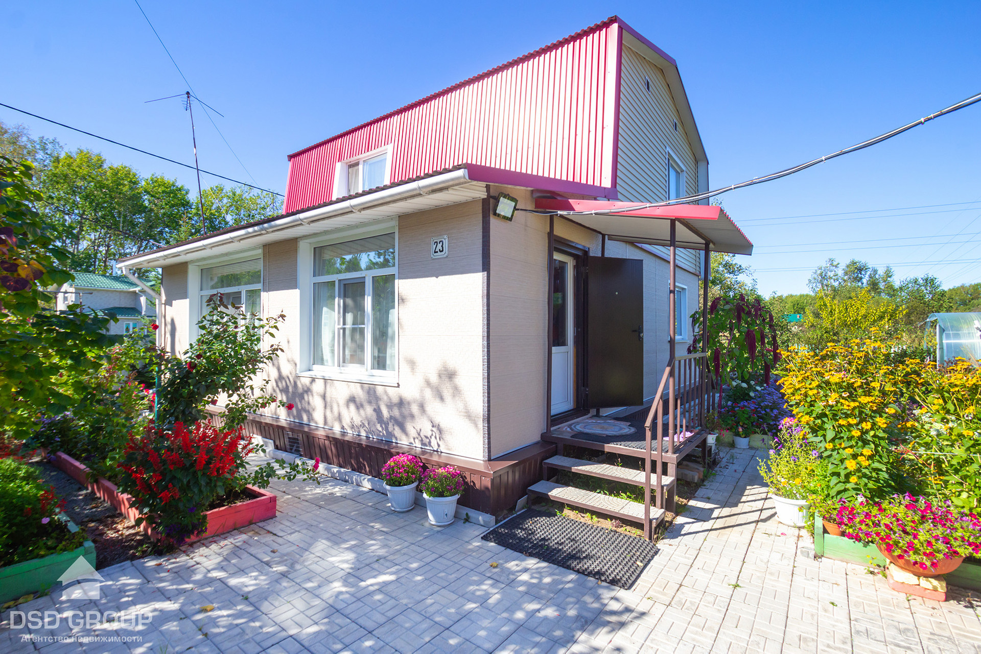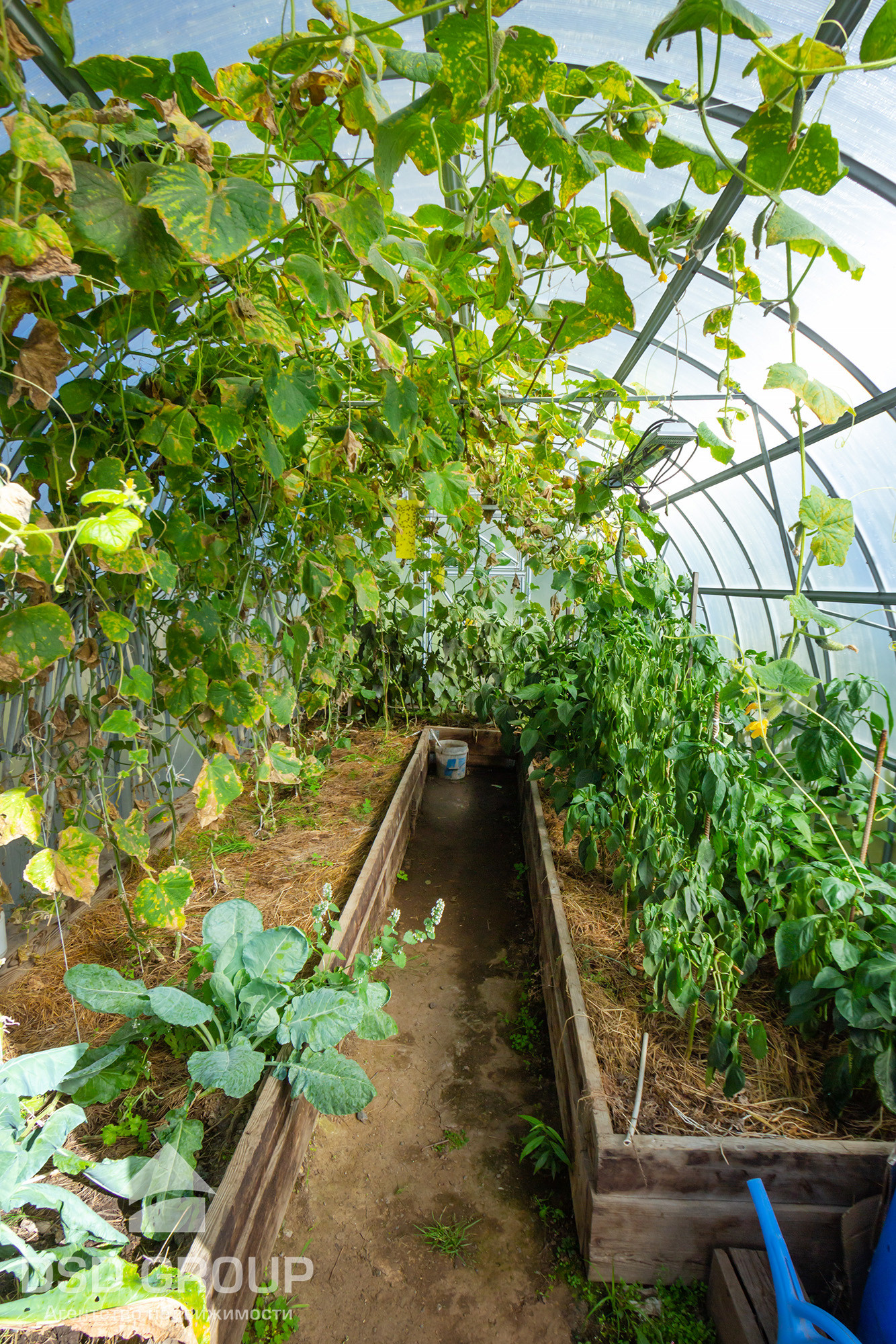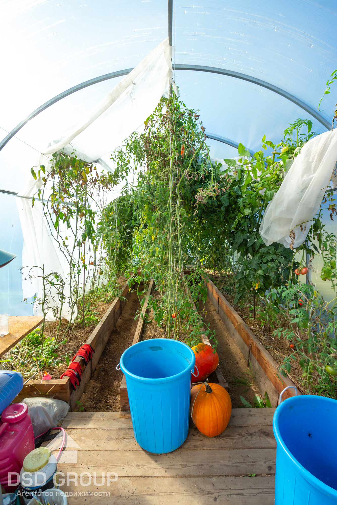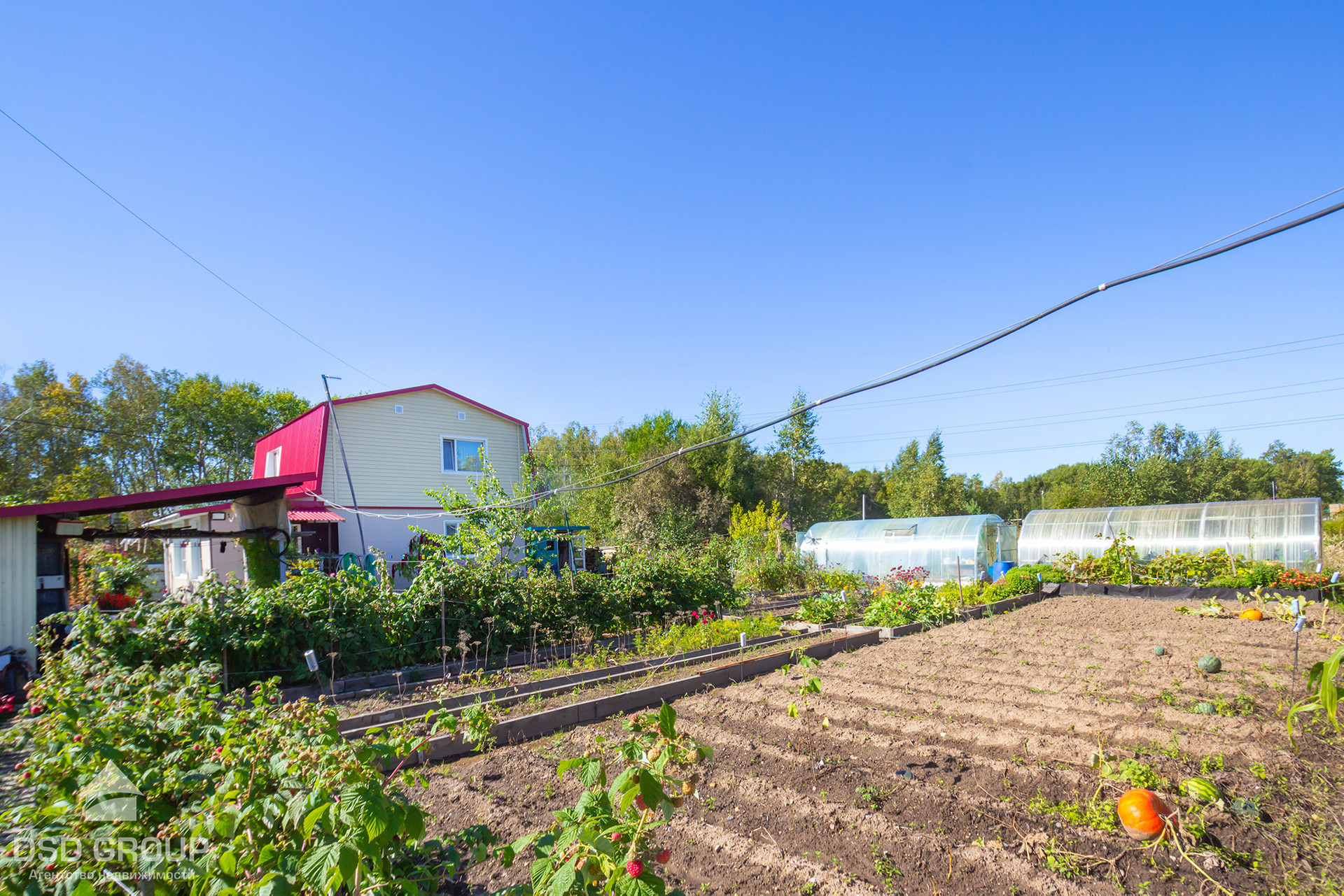 -Придомовая территория и зона барбекю выложена брусчаткой. Есть контейнер для хранения хоз.инвентаря, гараж , две большие теплицы.