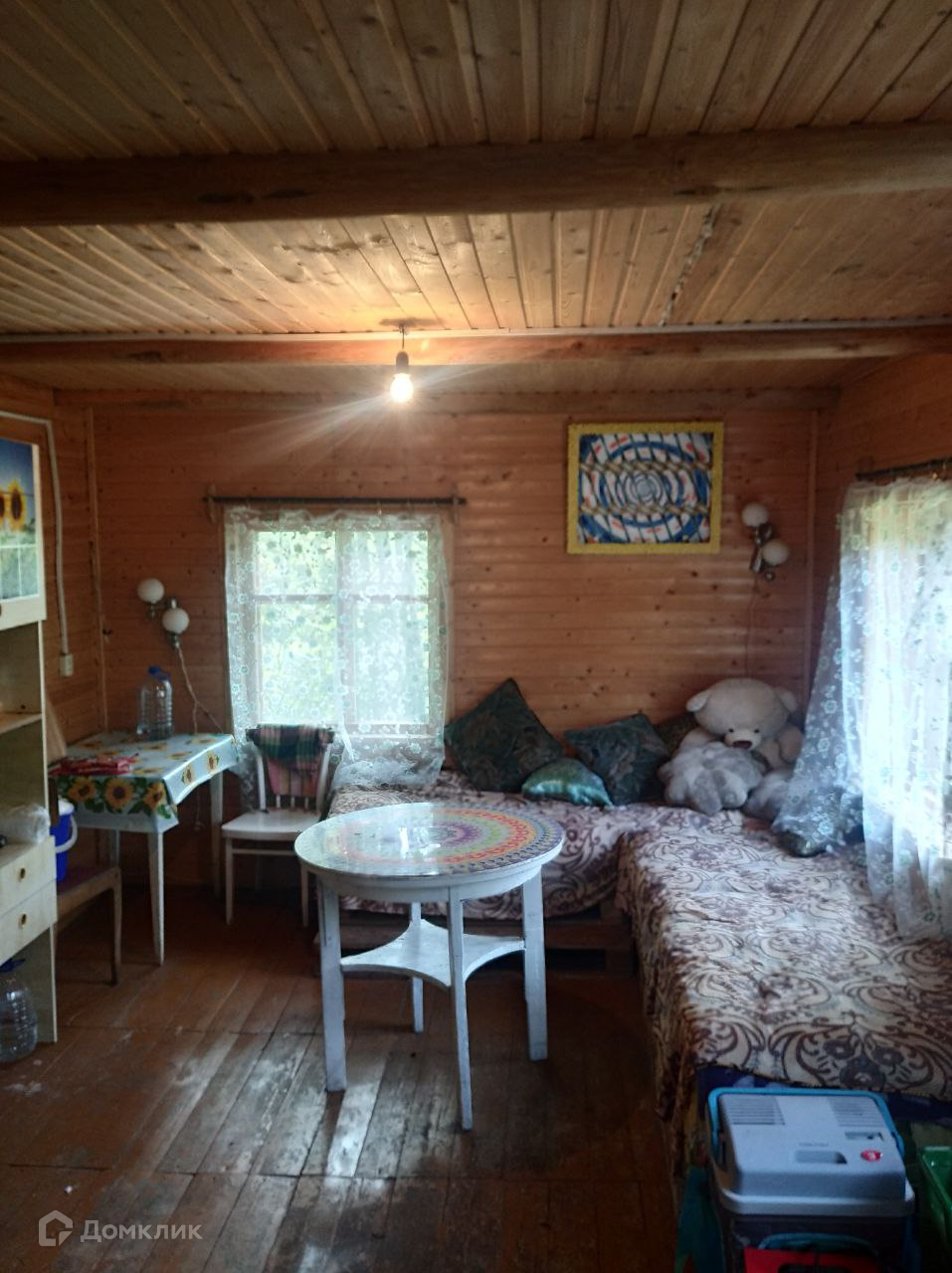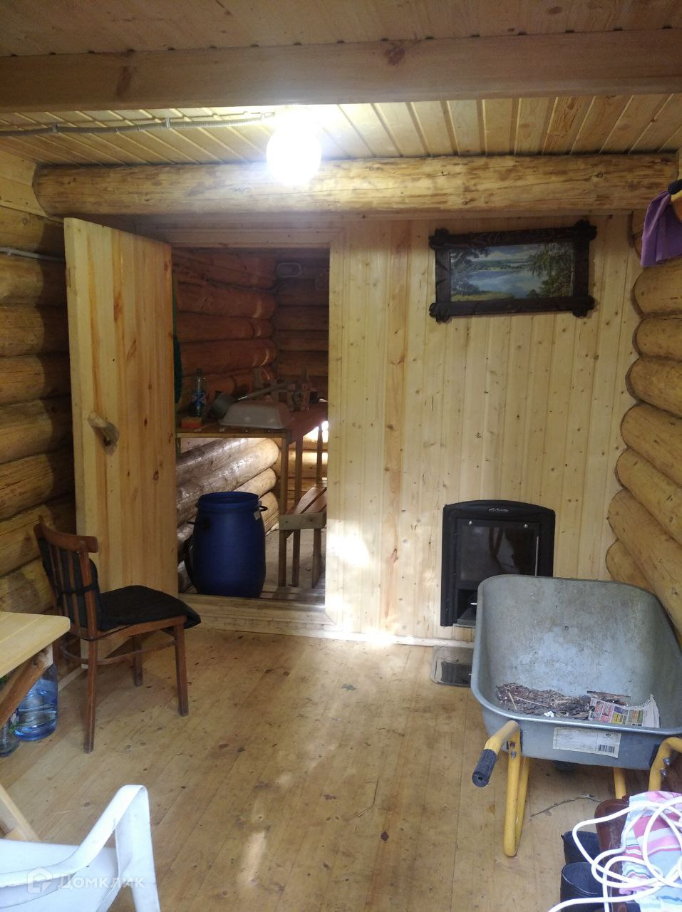 В дом проведено электричество, на втором этаже есть комфортная терраса для отдыха и спальные комнаты. Отопление печь и камин. Бревенчатые стены.