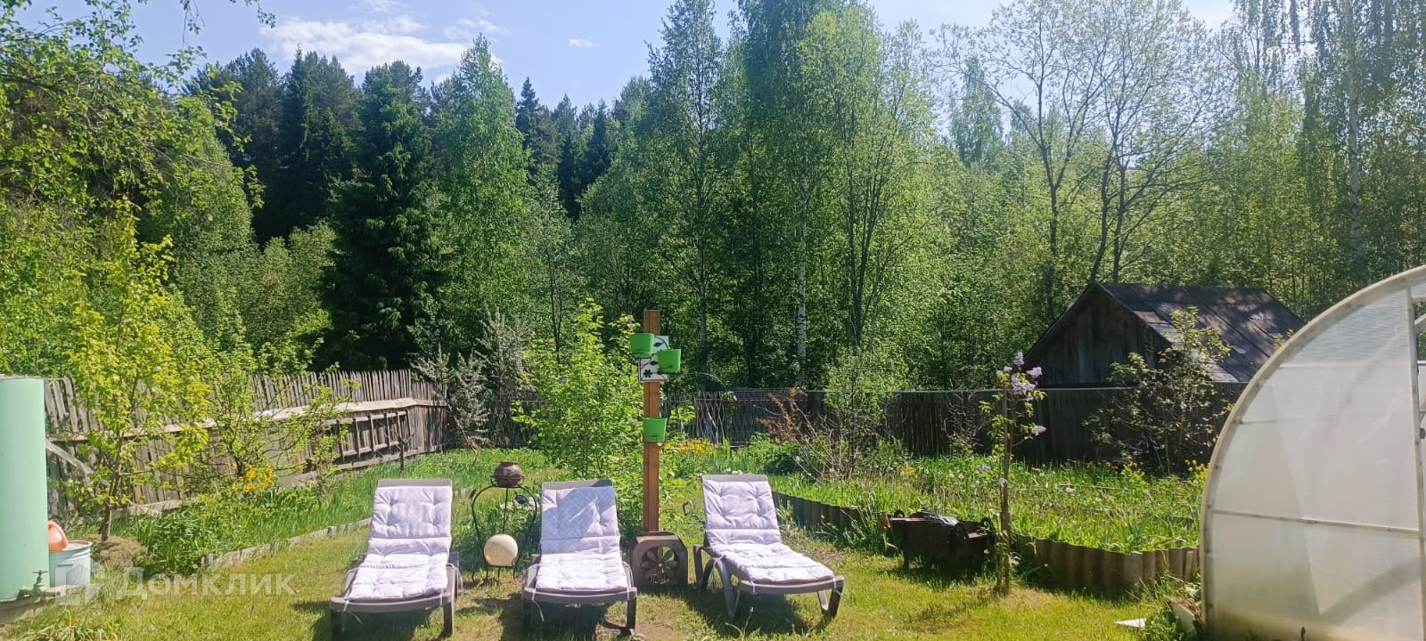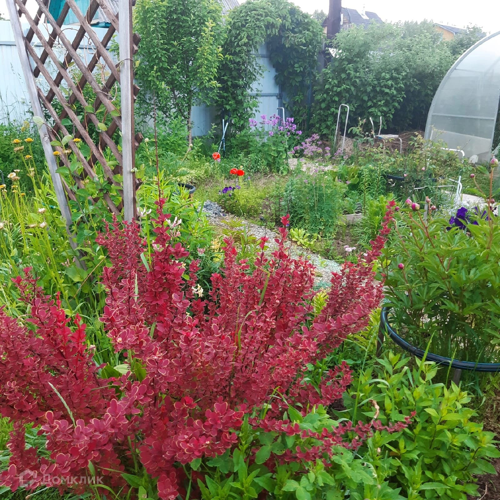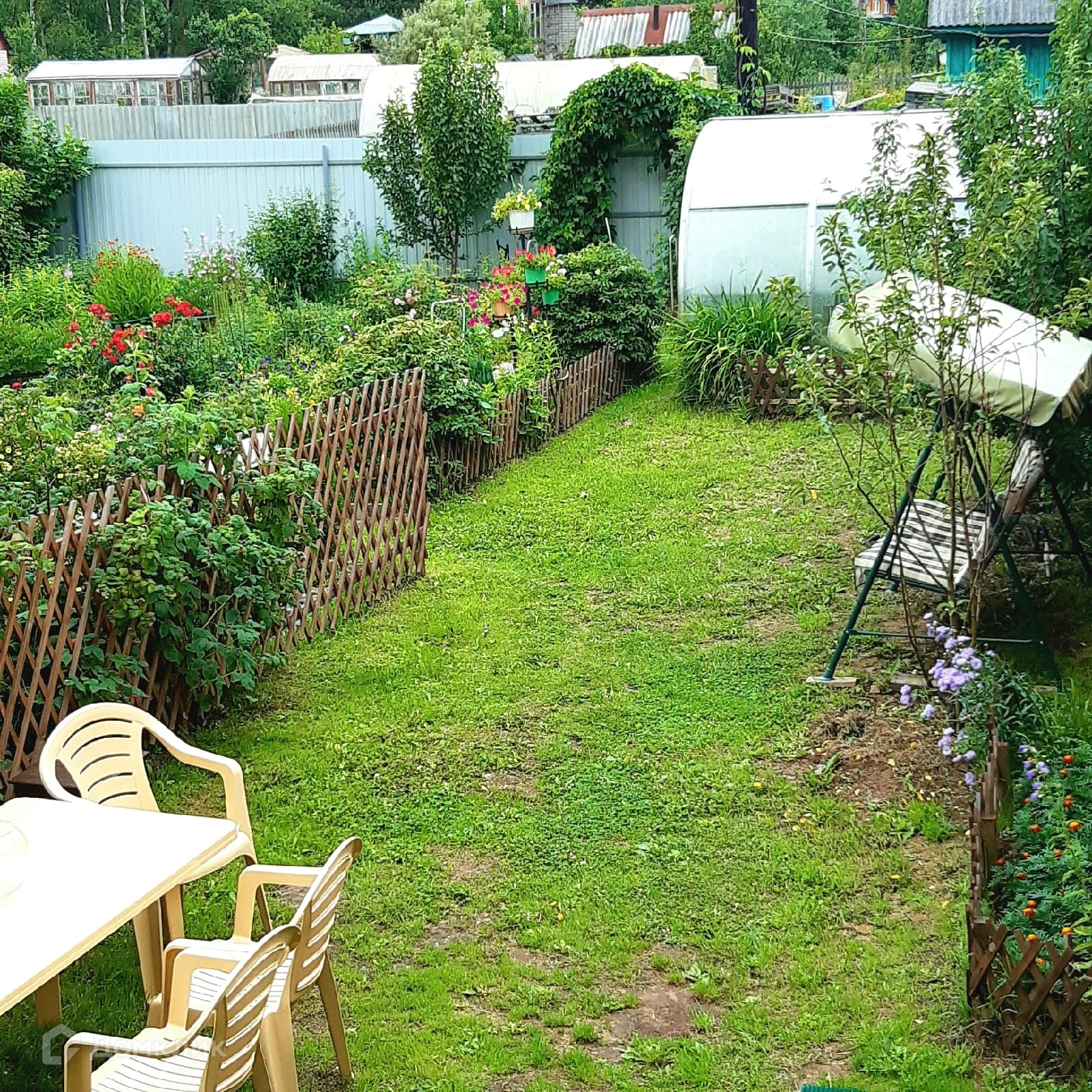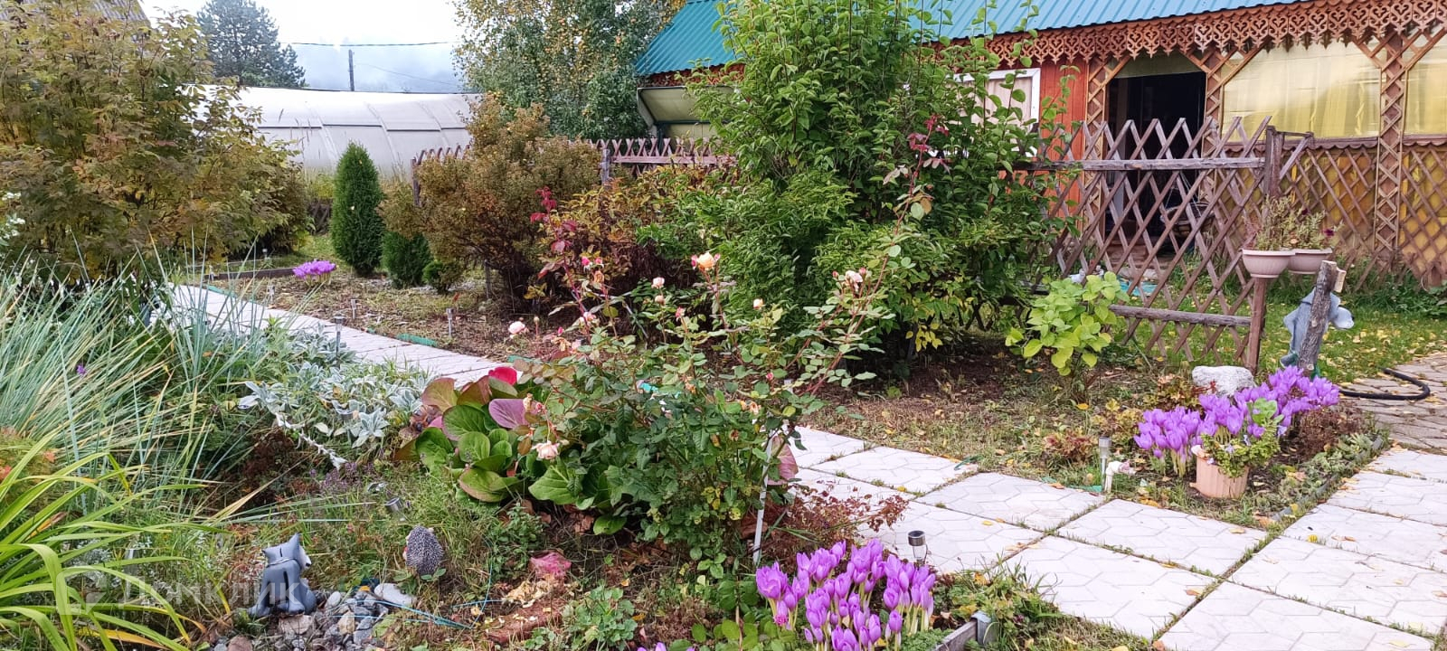Теплицы, которые не требуется очищать в зимнее время, есть хоз.постройки: туалет и душевой отсек, дровеник, очень много различных цветов.