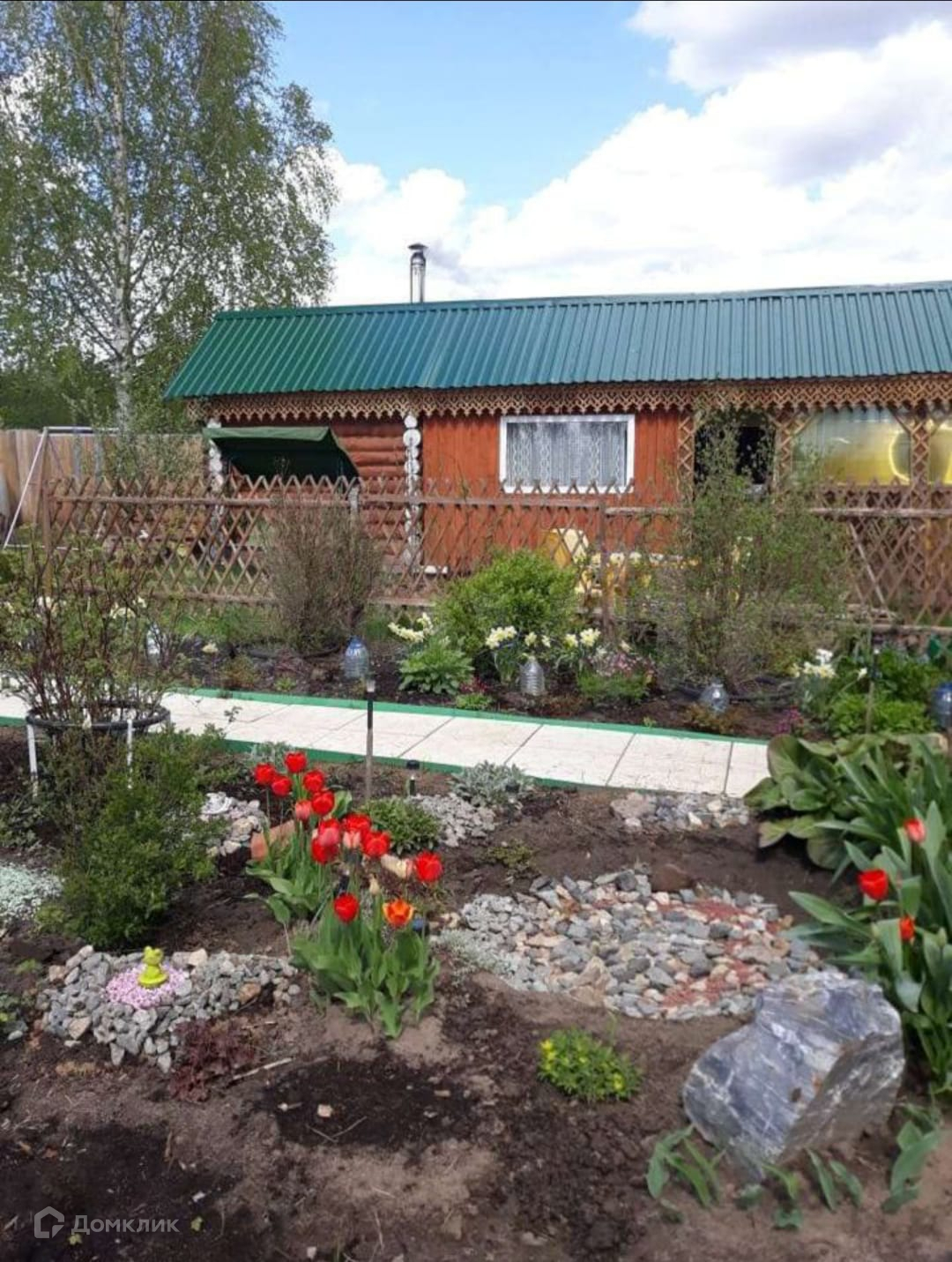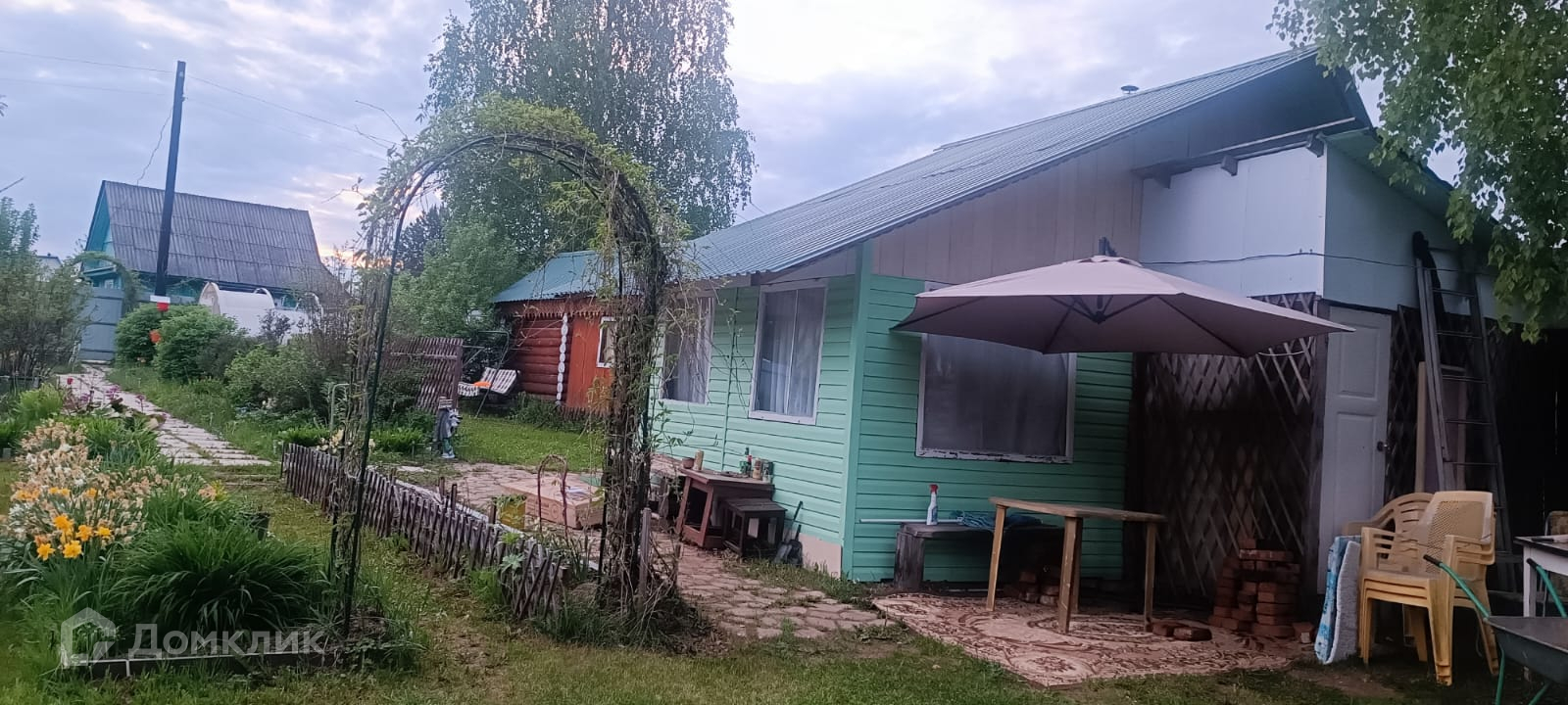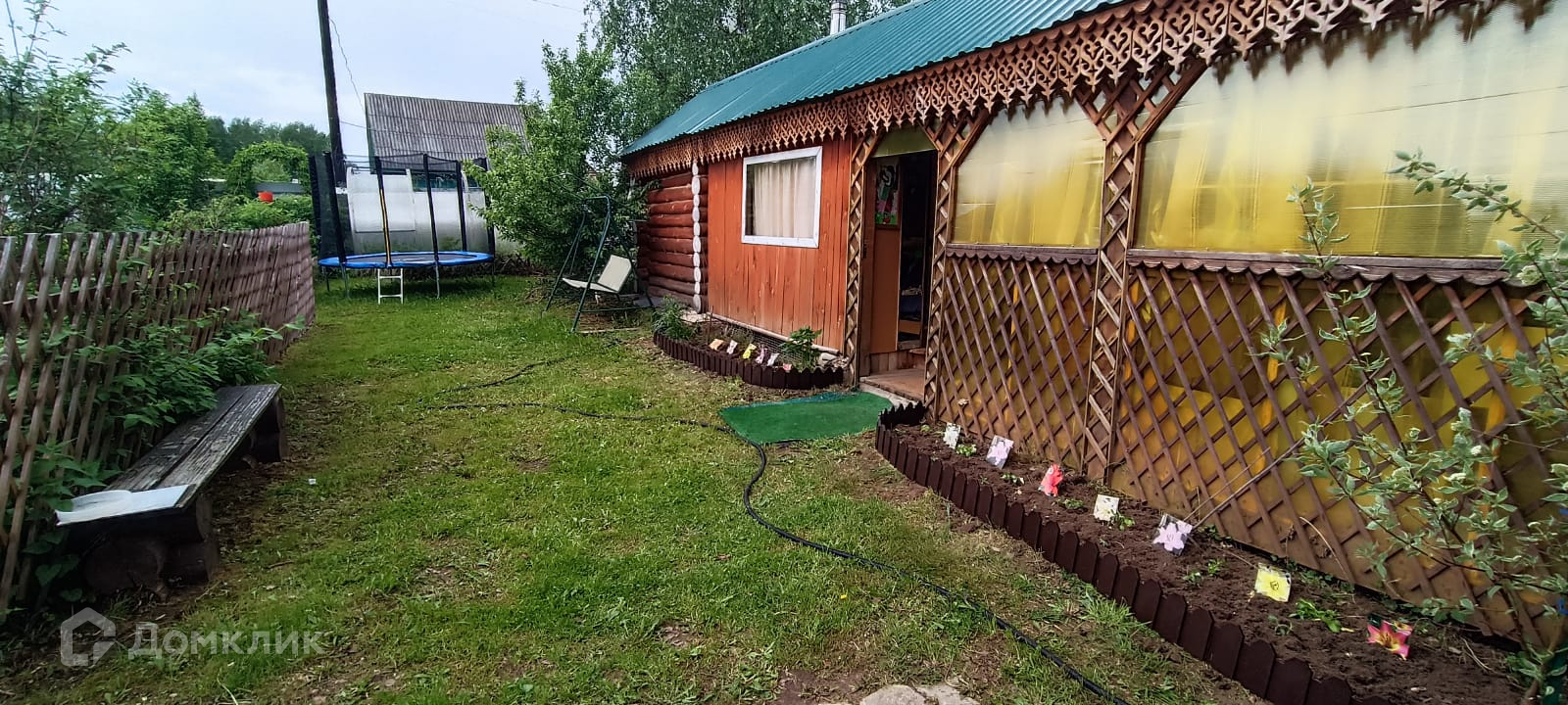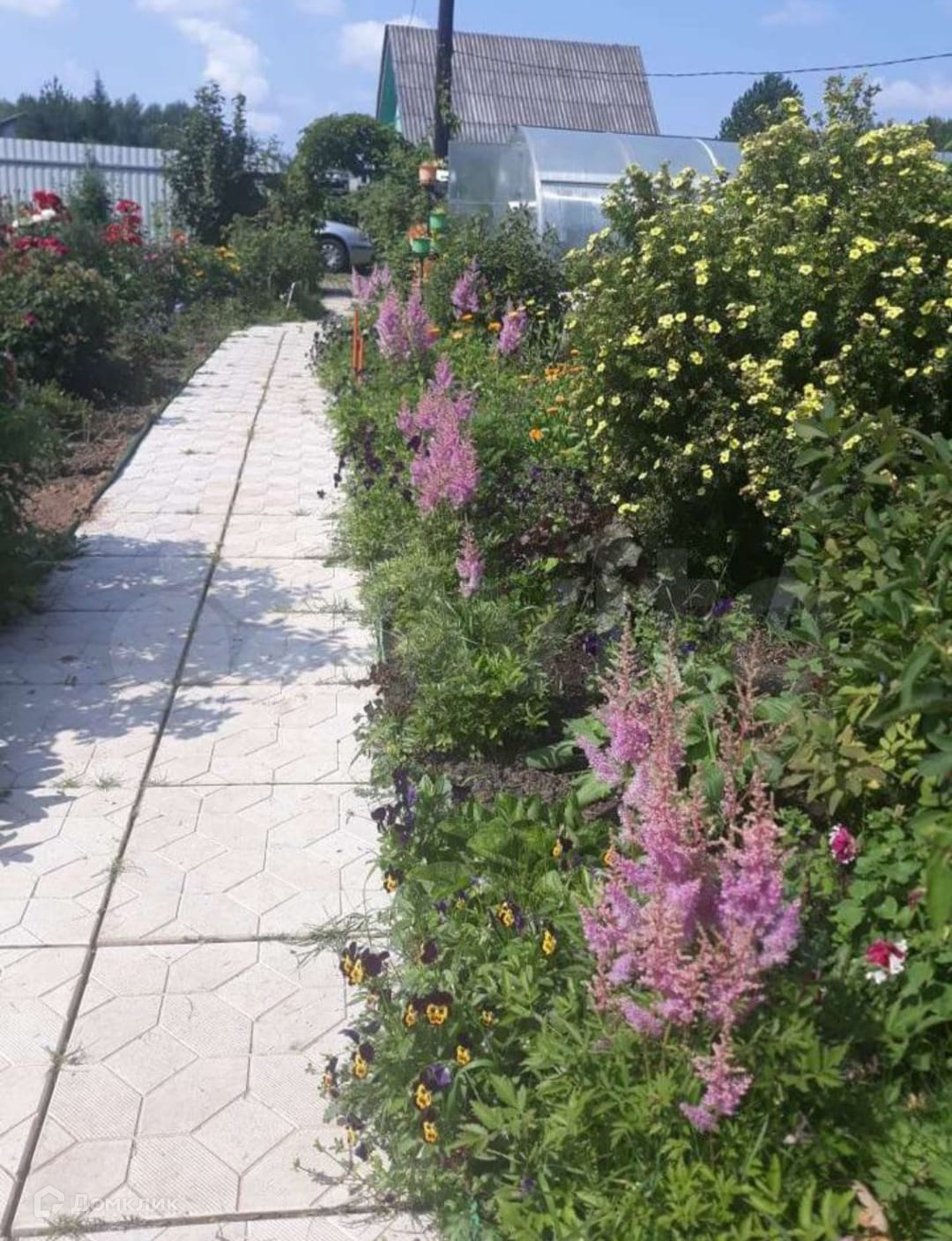 Теплицы, которые не требуется очищать в зимнее время, есть хоз.постройки: туалет и душевой отсек, дровеник, очень много различных цветов.