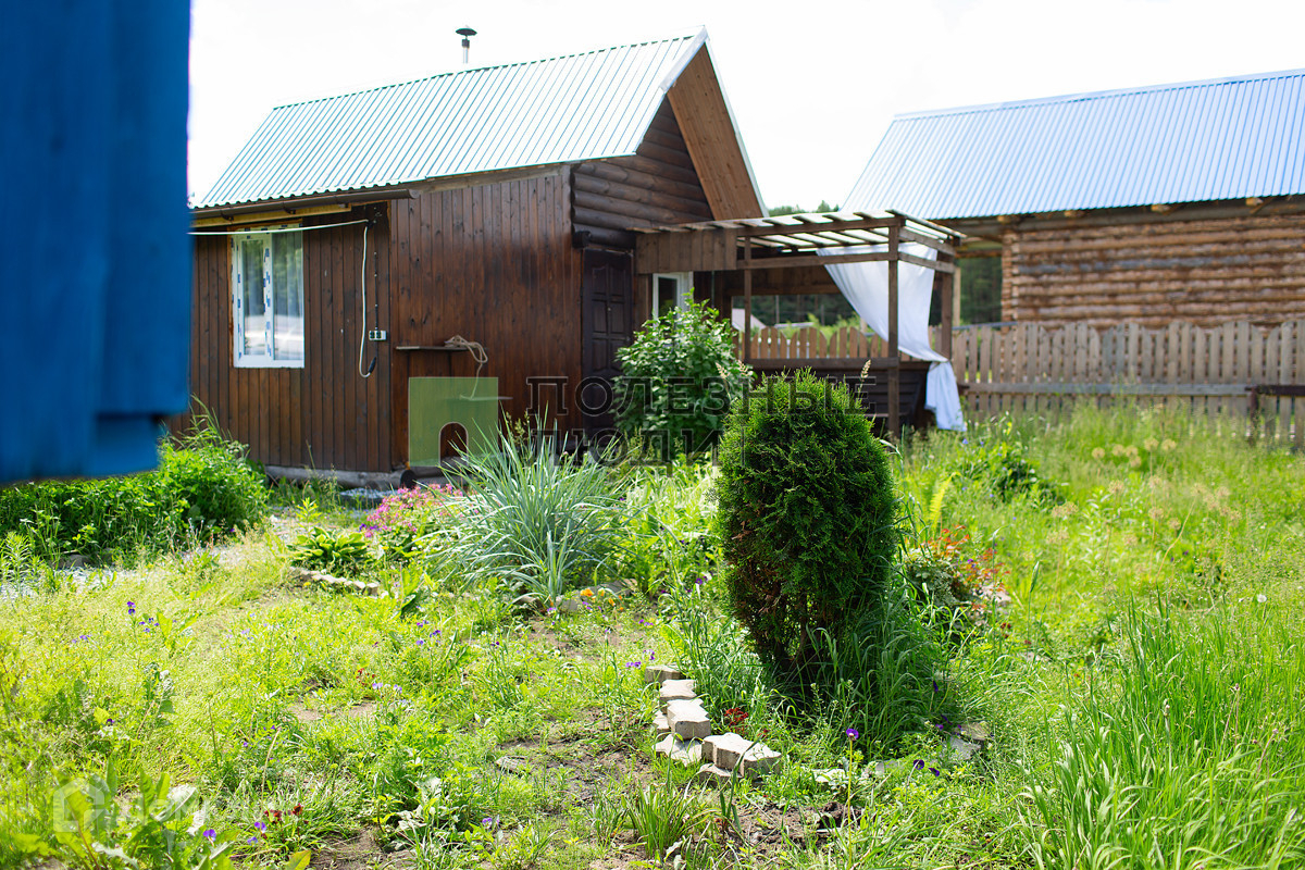 На участке взрослые яблони, крыжовник, смородина, малина, клубника. Есть туи, цветочная клумба.