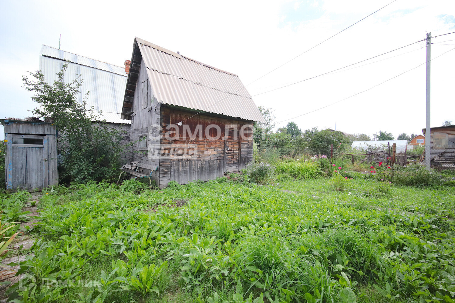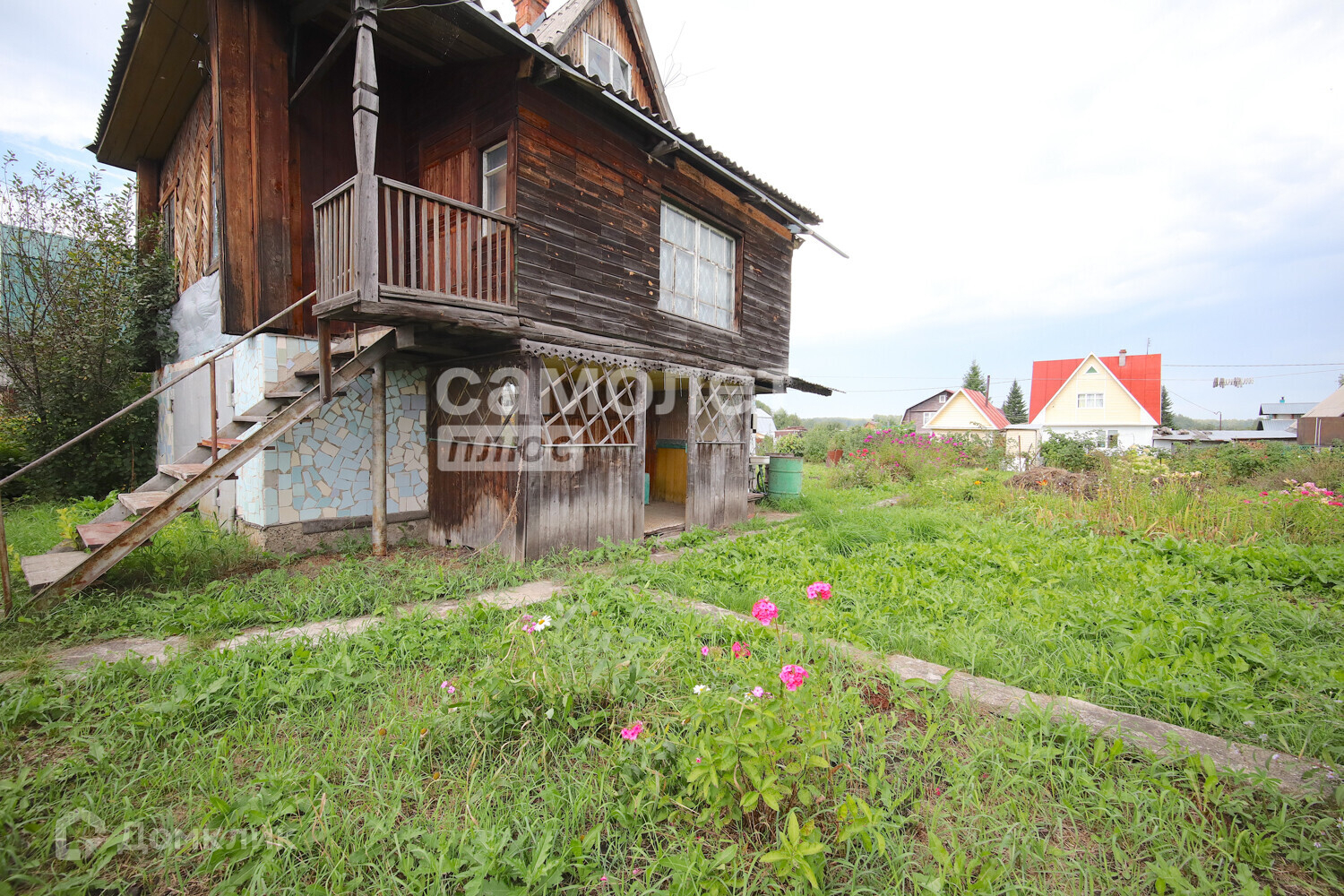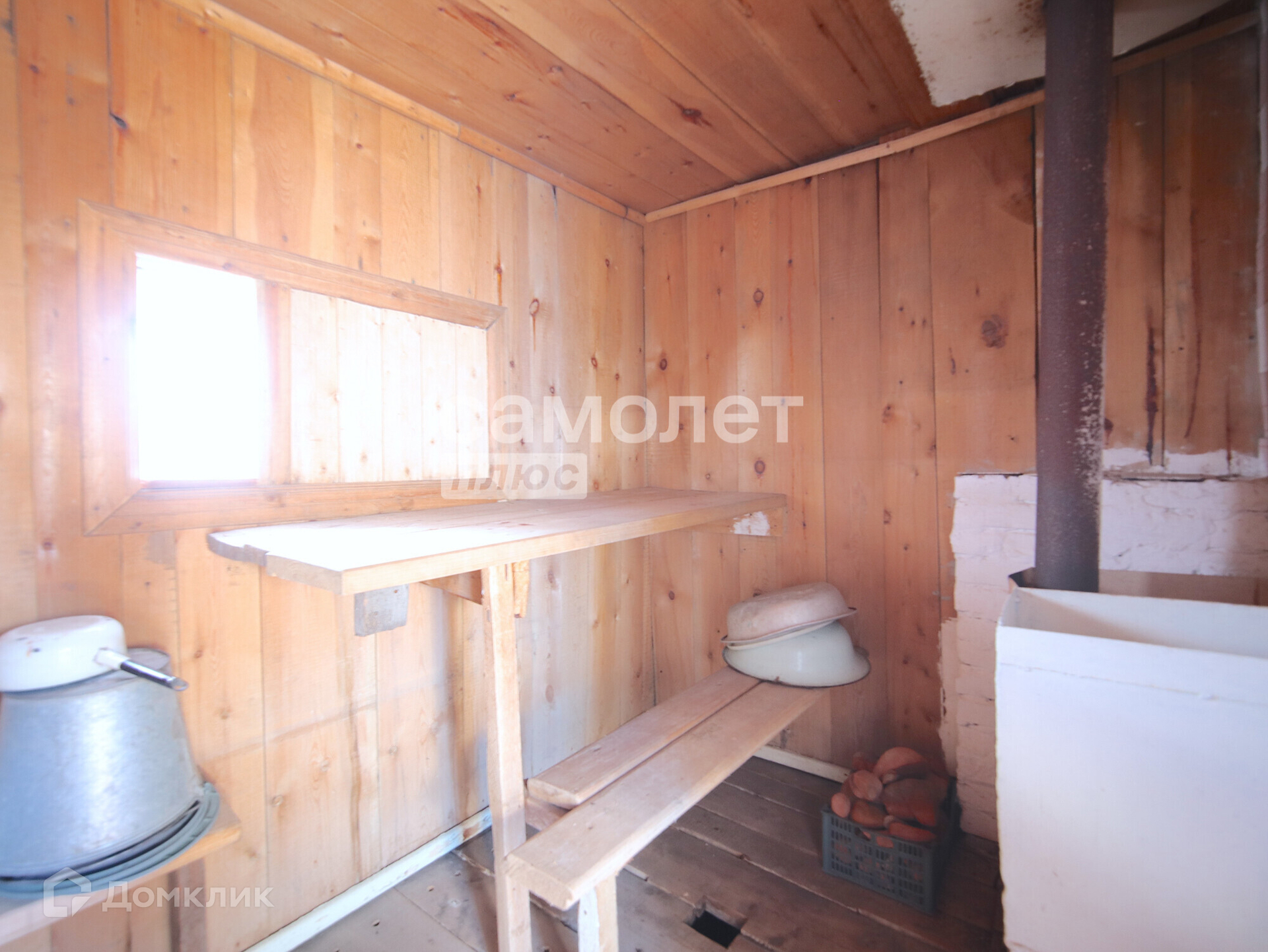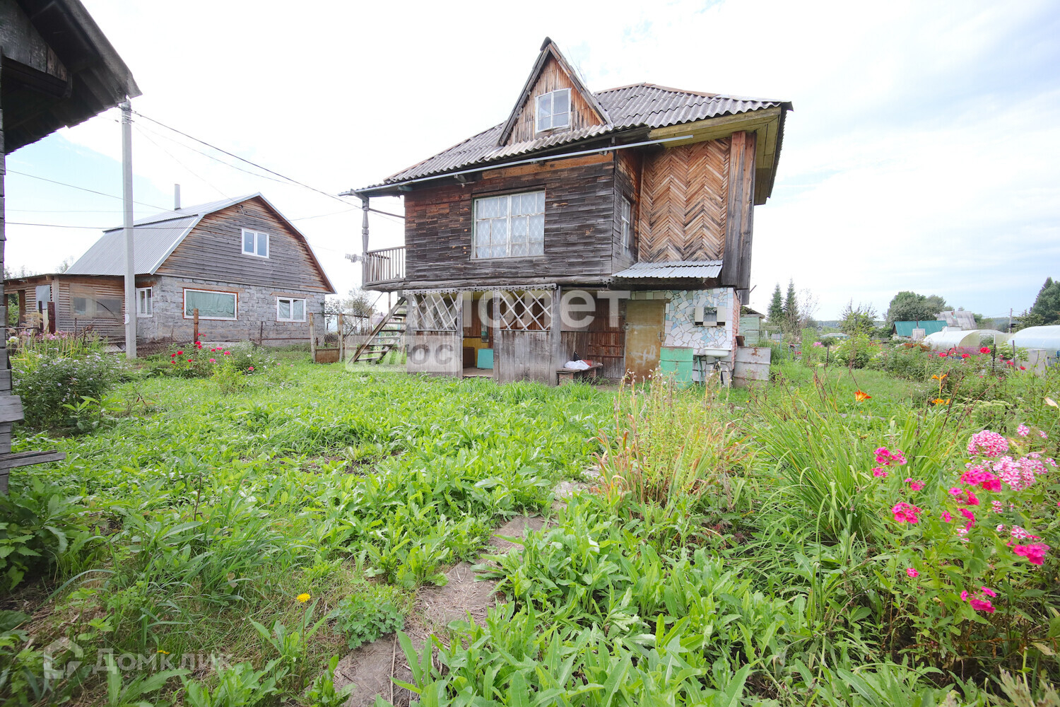 Дом деревянный (материал – лиственница, комфортно и экологично для сна) . Первый этаж занимает гараж, который сейчас используется под инвентарь. Второй этаж состоит из веранды, кухни-зала и спального места, имеется печь, отапливаемая углем. К дому пристроена беседка для отдыха на свежем воздухе. Туалет располагается на улице. Между домом и баней высажен газон, в утренние часы можно загорать и проводить время на улице. Имеются дорожки из бетона. Площадь дома около 35 м2.