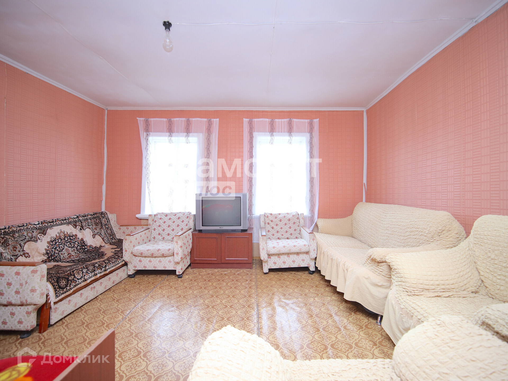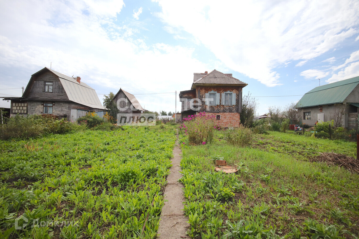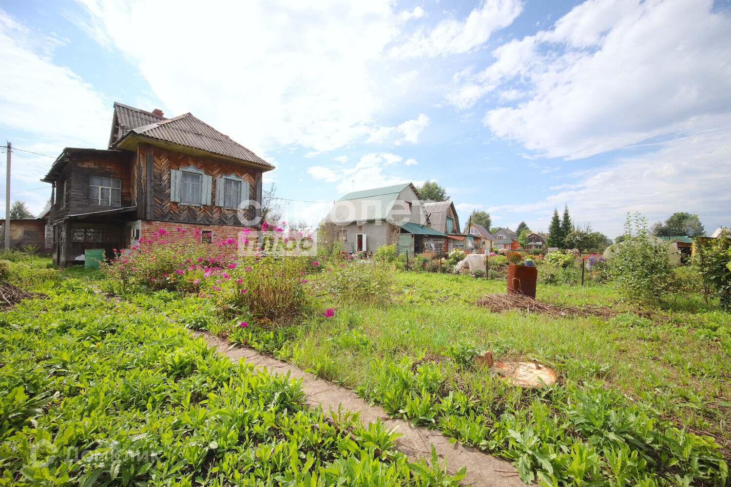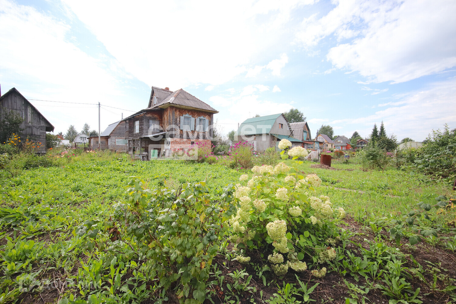 Дом деревянный (материал – лиственница, комфортно и экологично для сна) . Первый этаж занимает гараж, который сейчас используется под инвентарь. Второй этаж состоит из веранды, кухни-зала и спального места, имеется печь, отапливаемая углем. К дому пристроена беседка для отдыха на свежем воздухе. Туалет располагается на улице. Между домом и баней высажен газон, в утренние часы можно загорать и проводить время на улице. Имеются дорожки из бетона. Площадь дома около 35 м2.