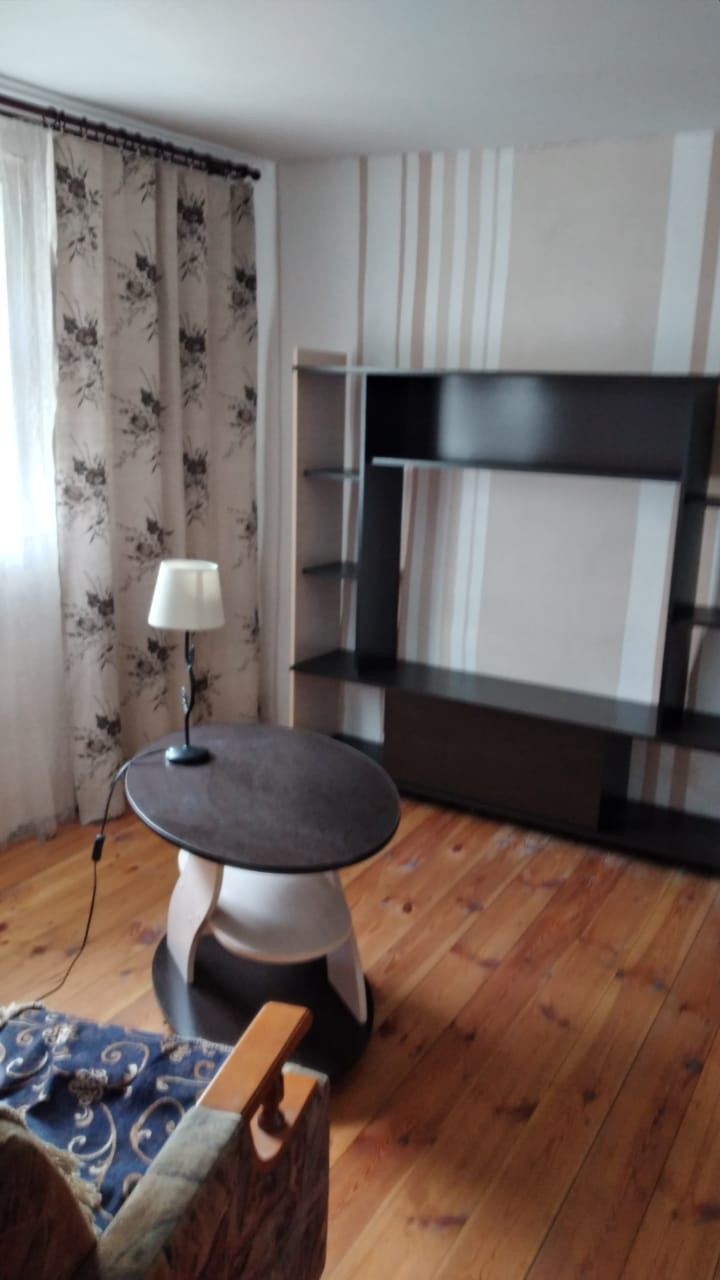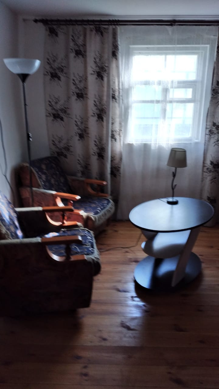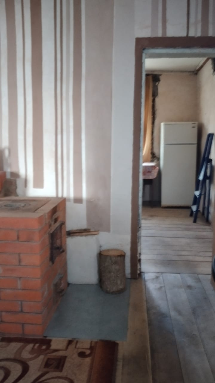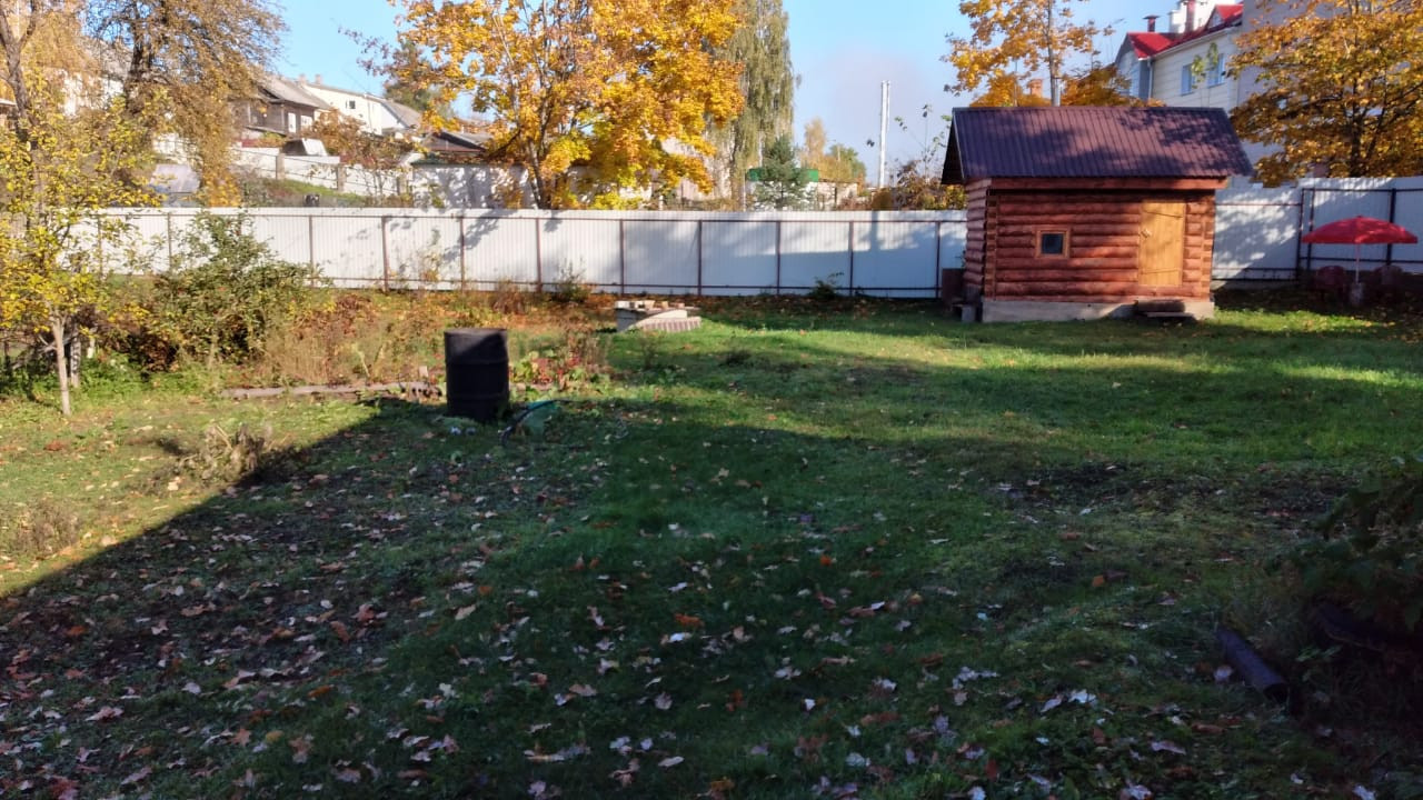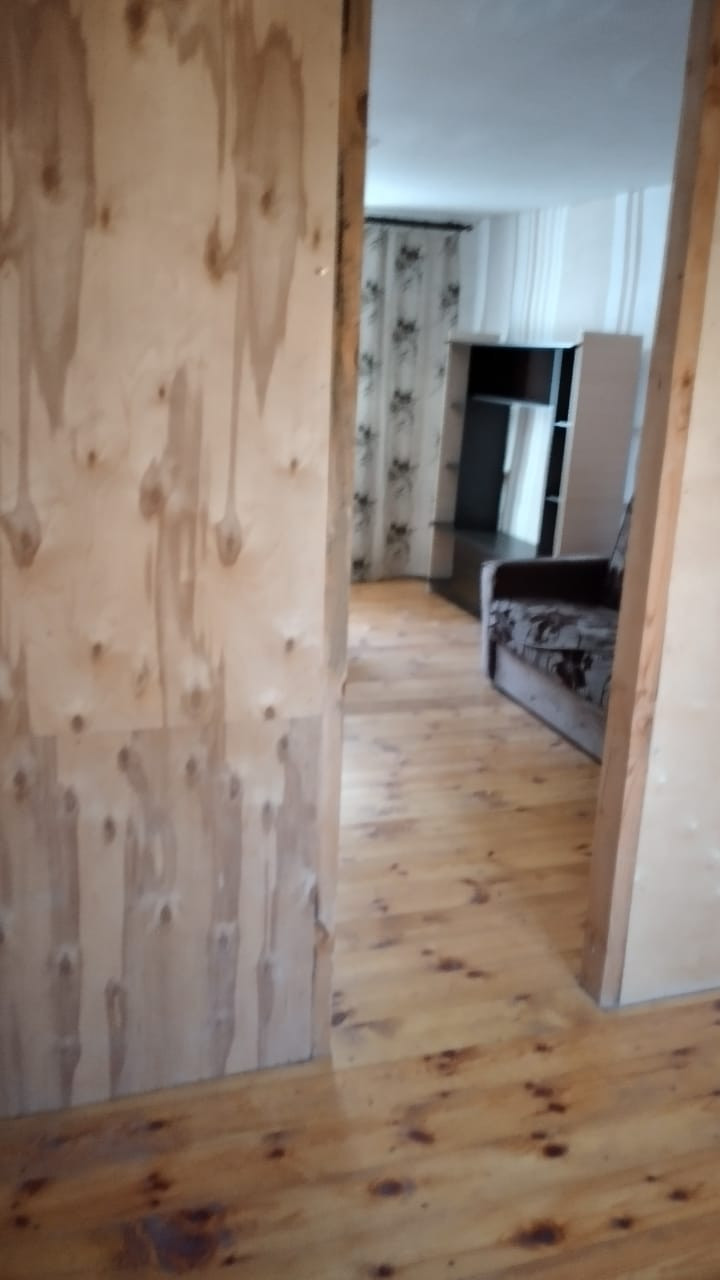 Прочный деревянный дом с двумя входами, в настоящее время распланированный под две квартиры с отдельными кухнями, санузлами. Половина дома обложена кирпичом. Прекрасный ровный участок с насаждениями, дровником, мастерской.