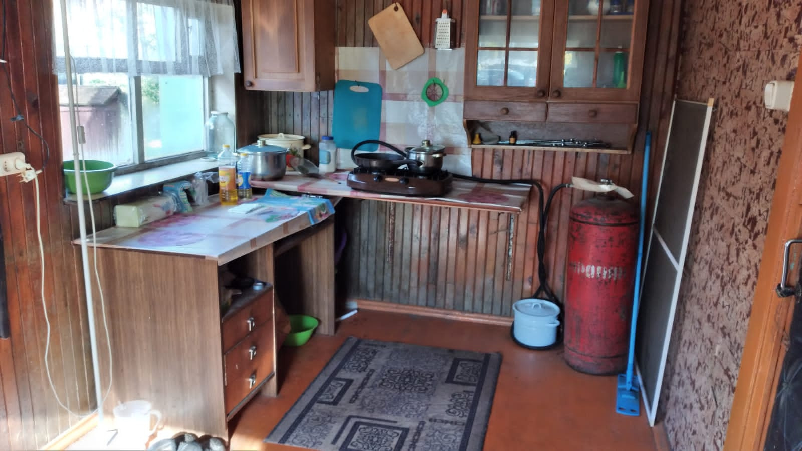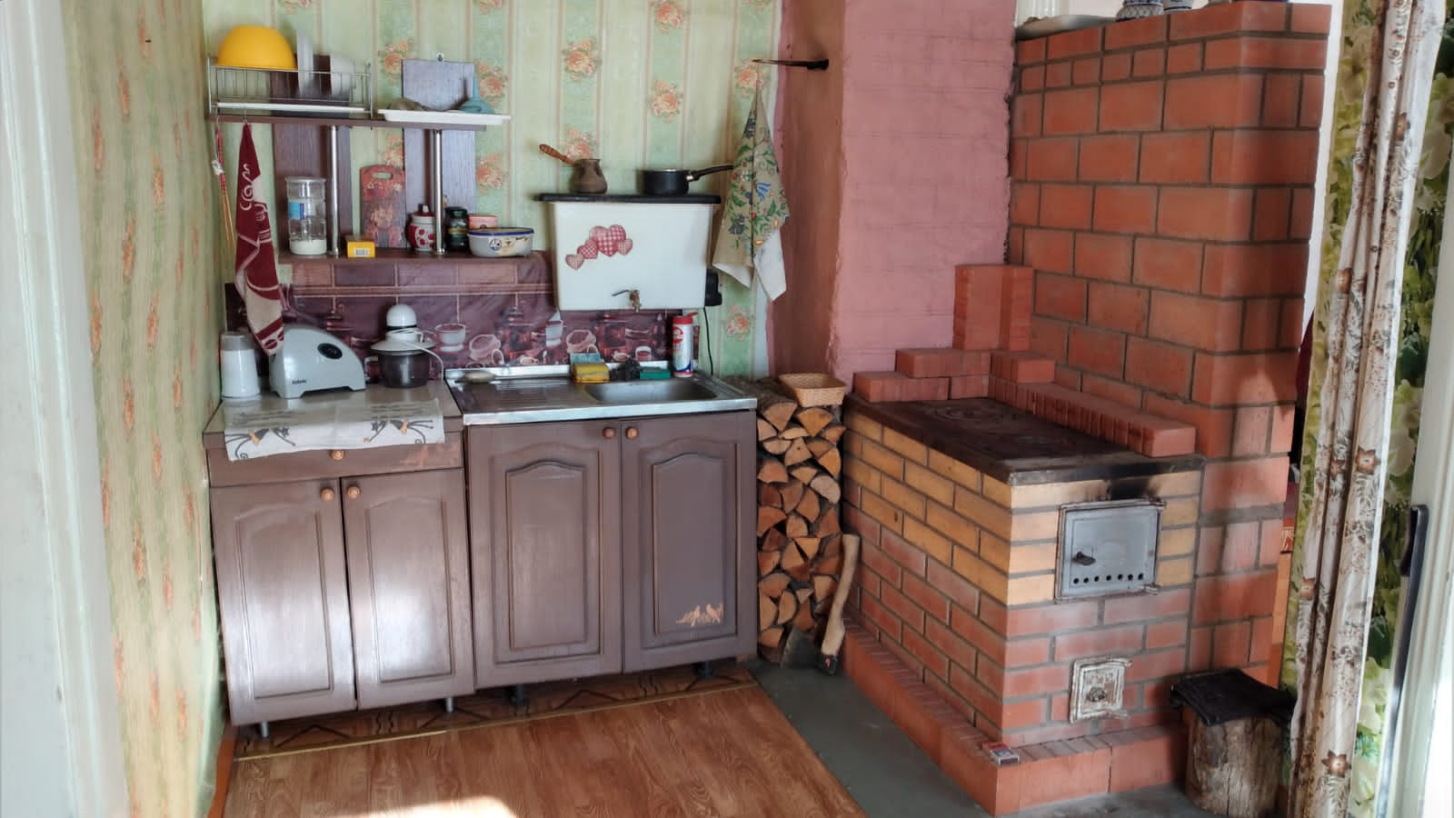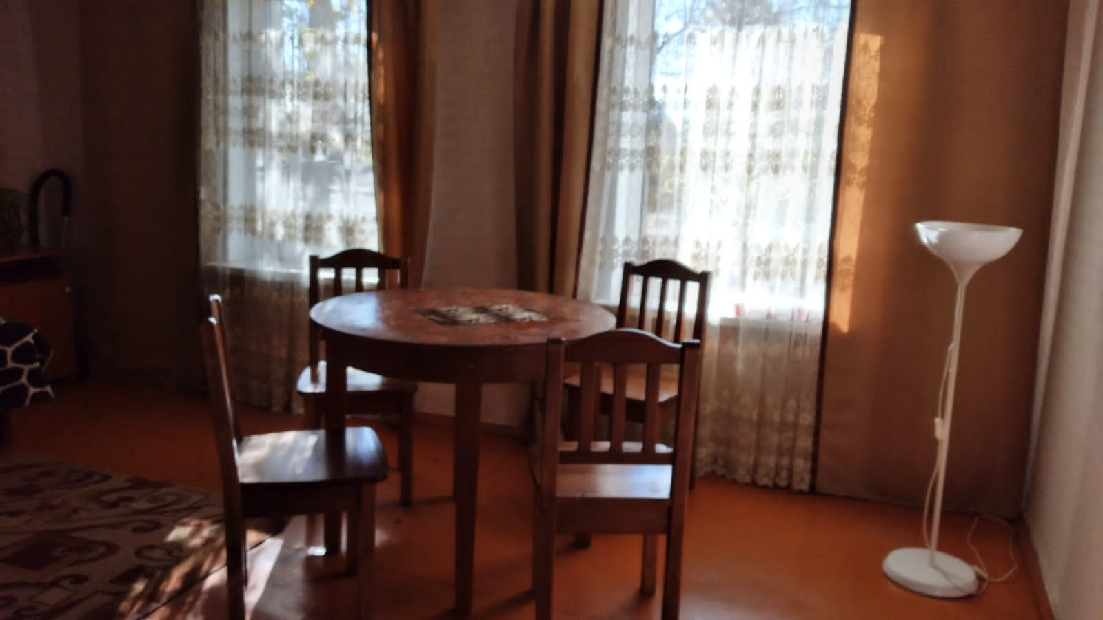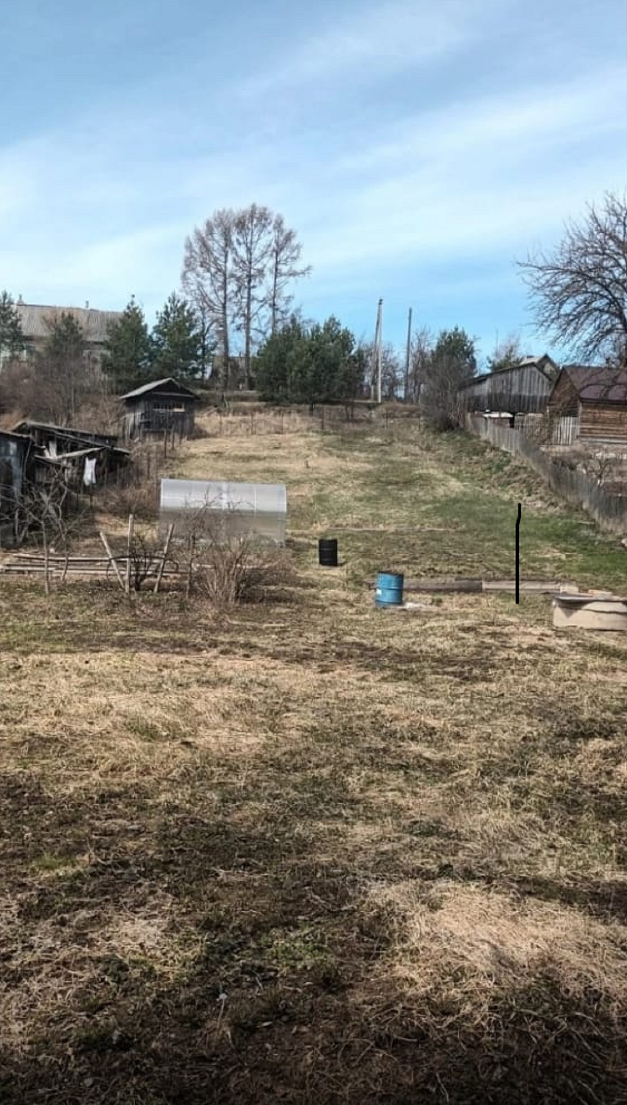 Прочный деревянный дом с двумя входами, в настоящее время распланированный под две квартиры с отдельными кухнями, санузлами. Половина дома обложена кирпичом. Прекрасный ровный участок с насаждениями, дровником, мастерской.
