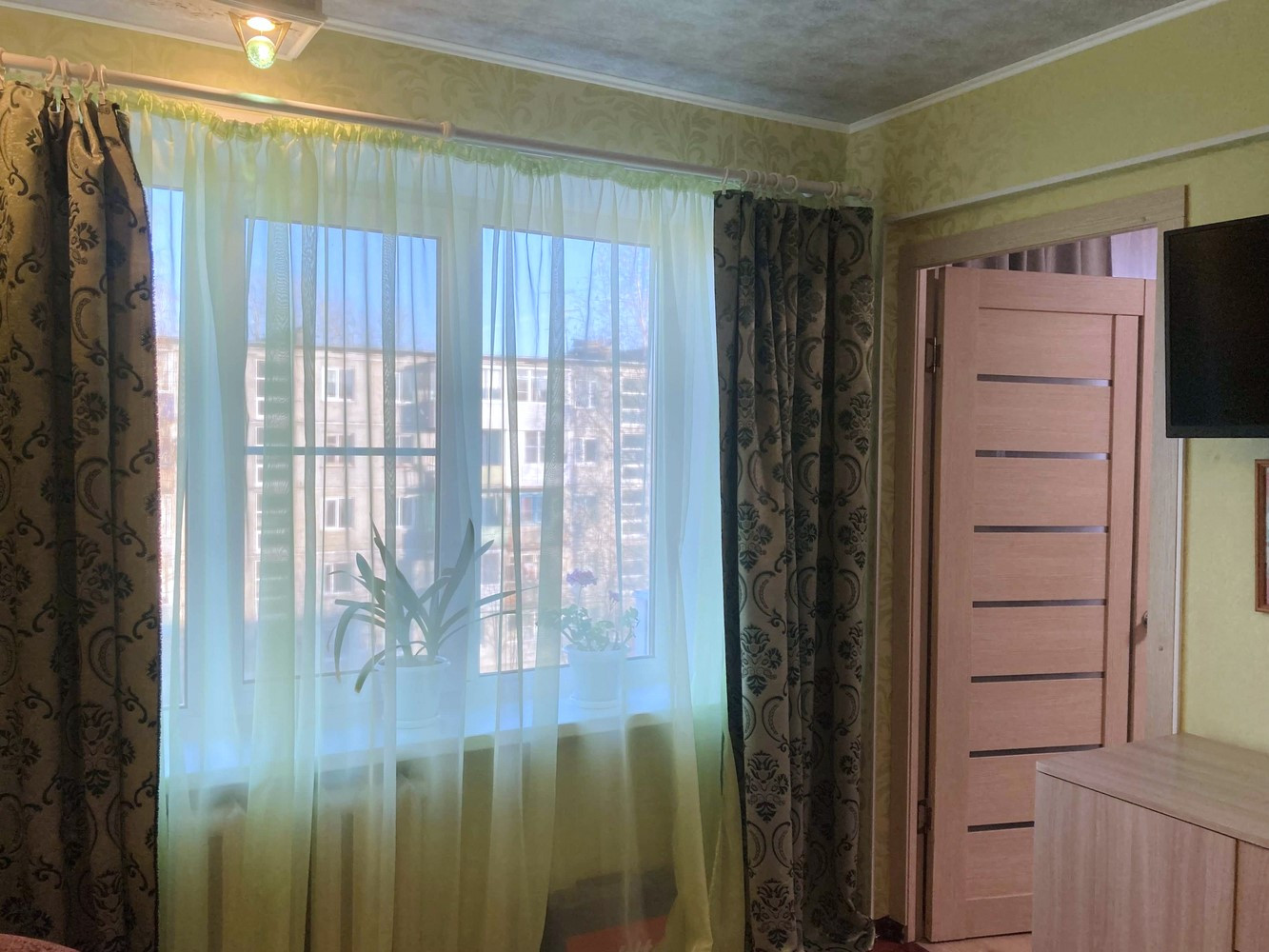 Потолки: натяжные/панели на кухне/ обои в одной комнате;
