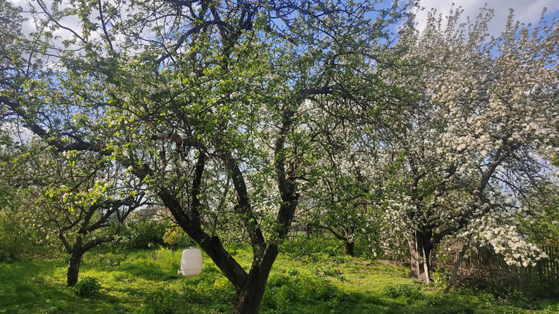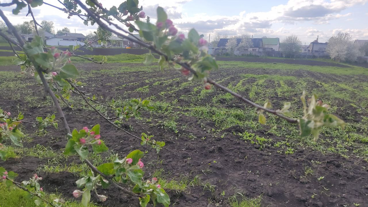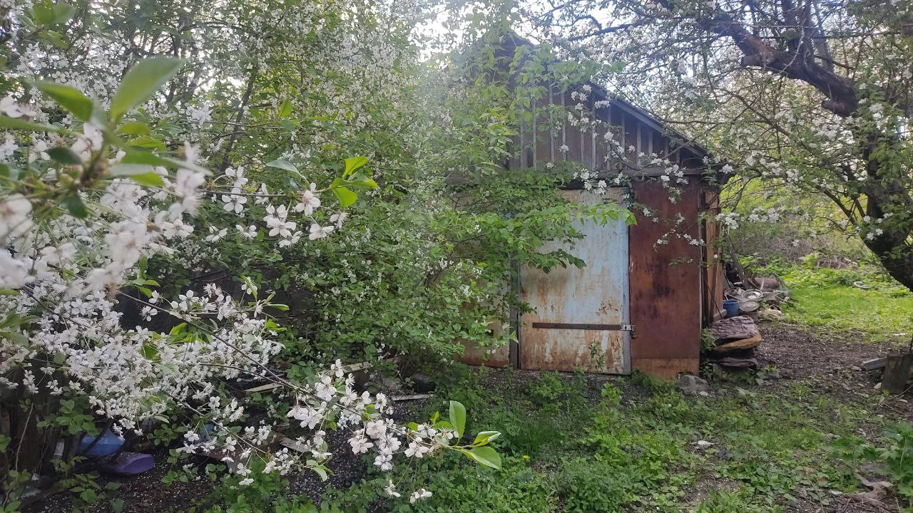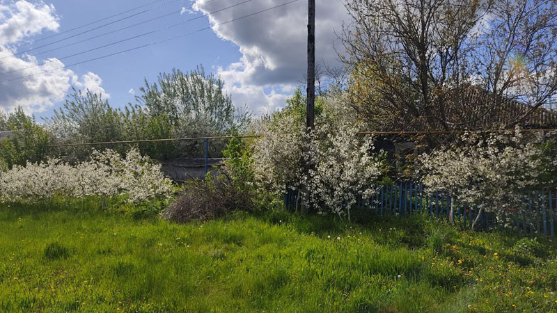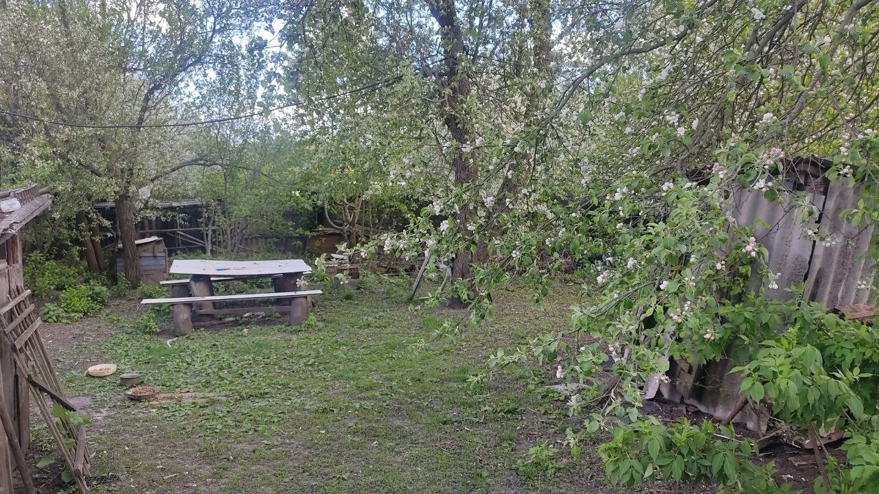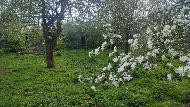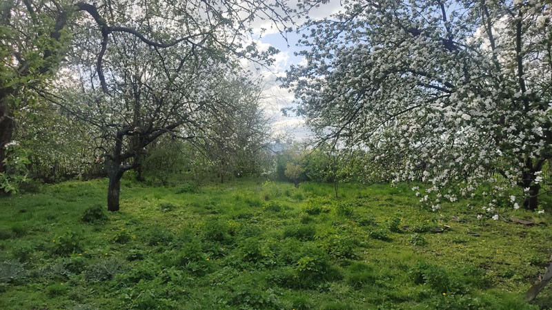 Сад 8 соток: 14 яблонь, две груши, абрикосы, вишня, черешня, слива, смородина, виноград, ежевика, малина, боярышник. Сад огорожен для пасеки и птицы.