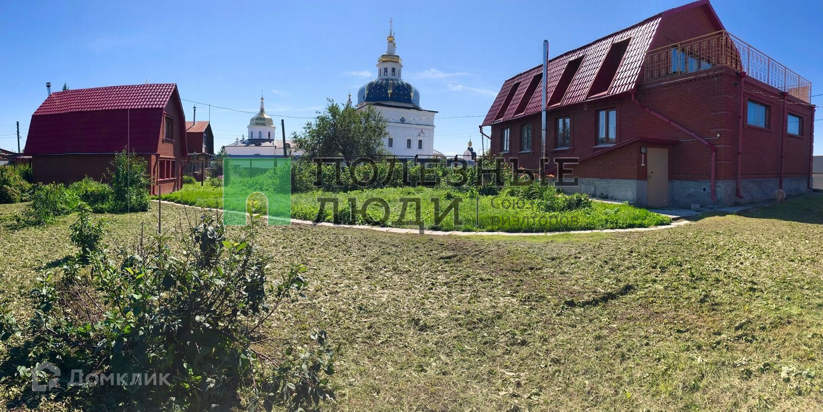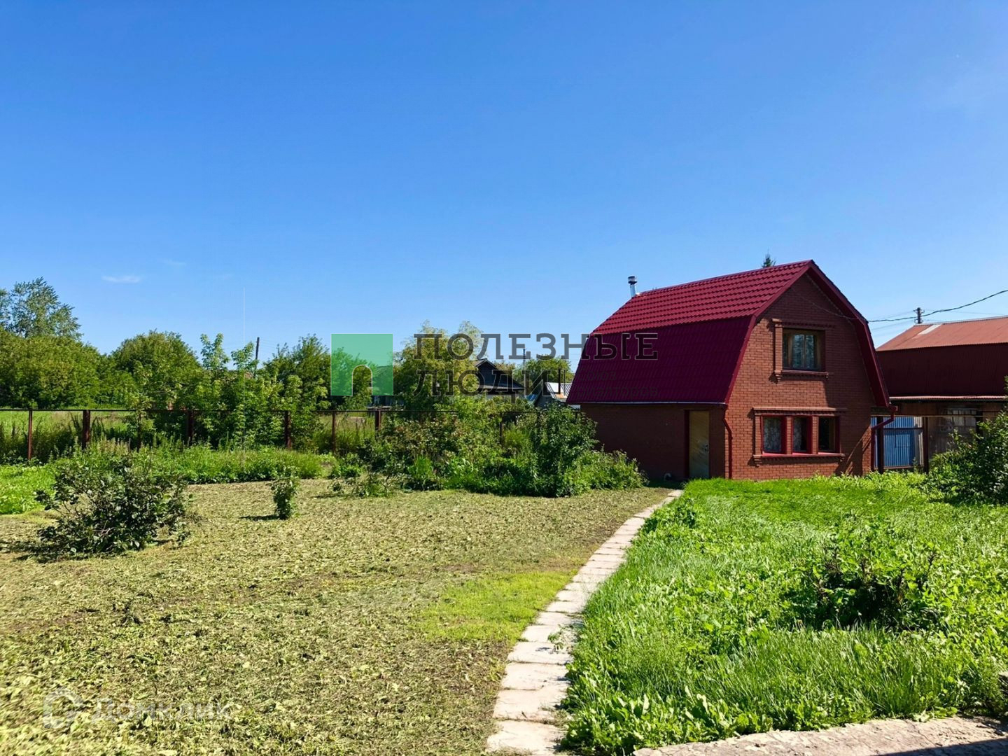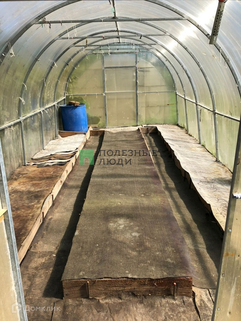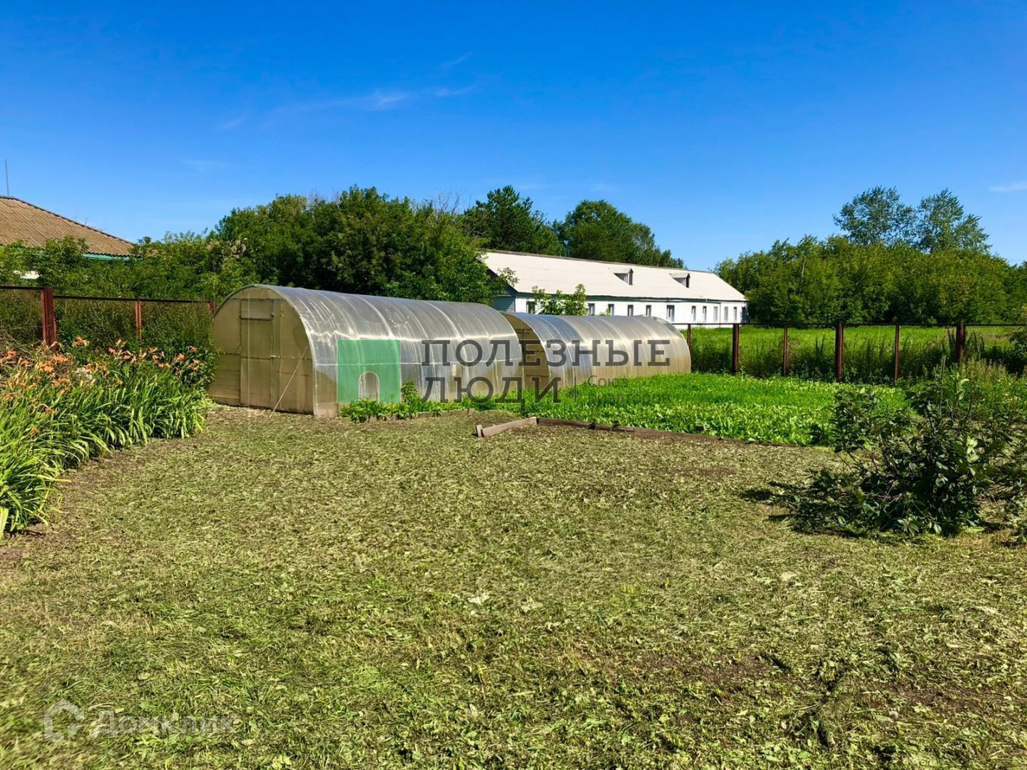 Участок разработан: имеются две теплицы и плодоносящий сад (ягодные кустарники, яблони, вишни), цветочные деревья и клумбы.