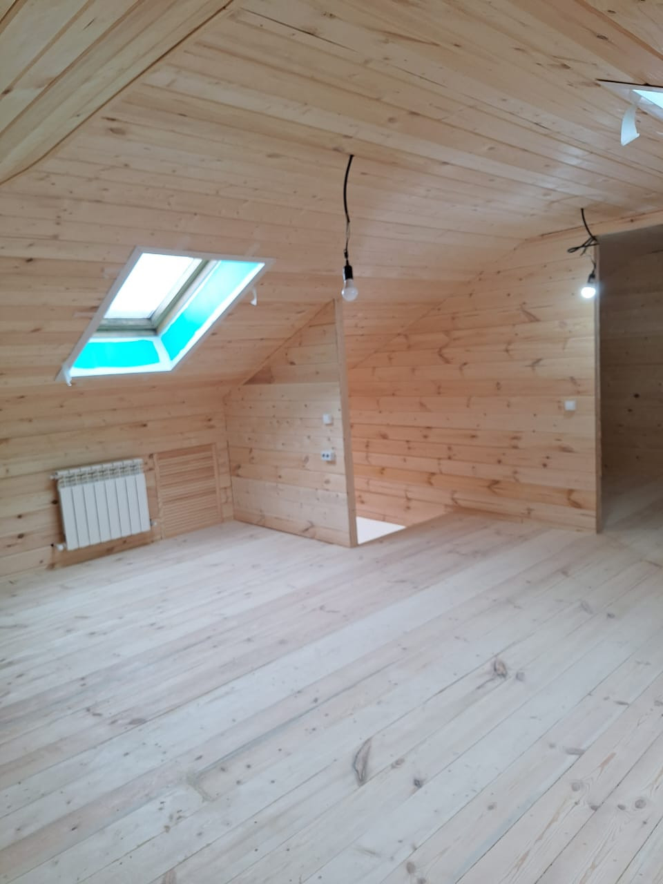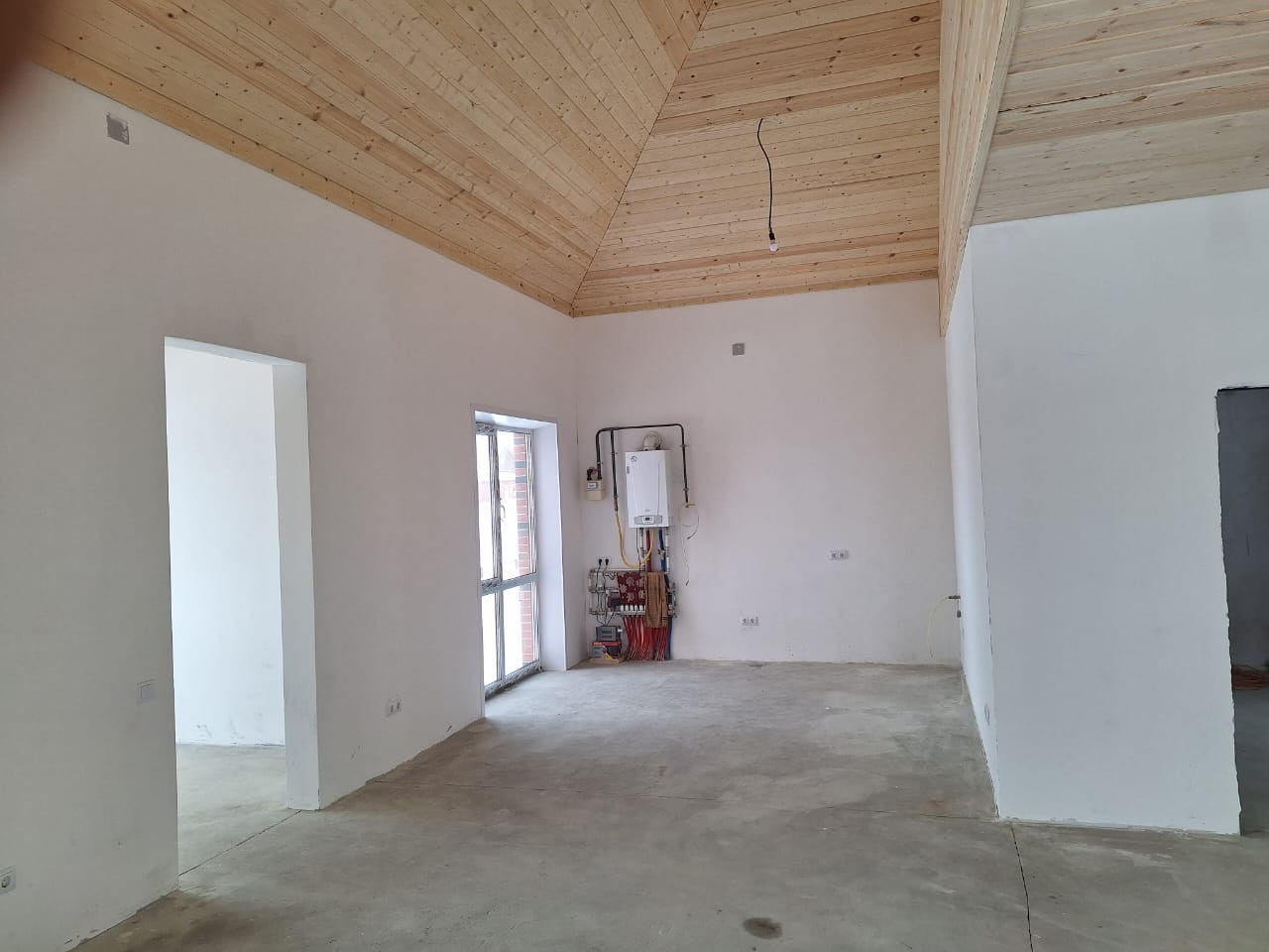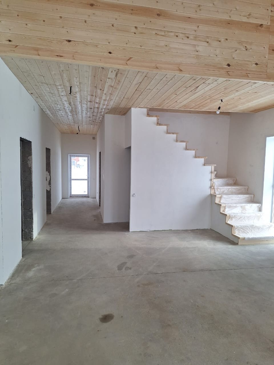 Продуманная планировка дома: на 1 этаже - 2 спальни, санузел, прихожая, кухня гостиная, зальная комната; на 2 этаже - санузел и комната свободной планировки. На 1 этаже - теплый пол по всей площади. Имеется подвал, 2 этаж - полумансарда. Дом полностью готов к финишному ремонту. Потолок - вагонка с имитацией бруса.