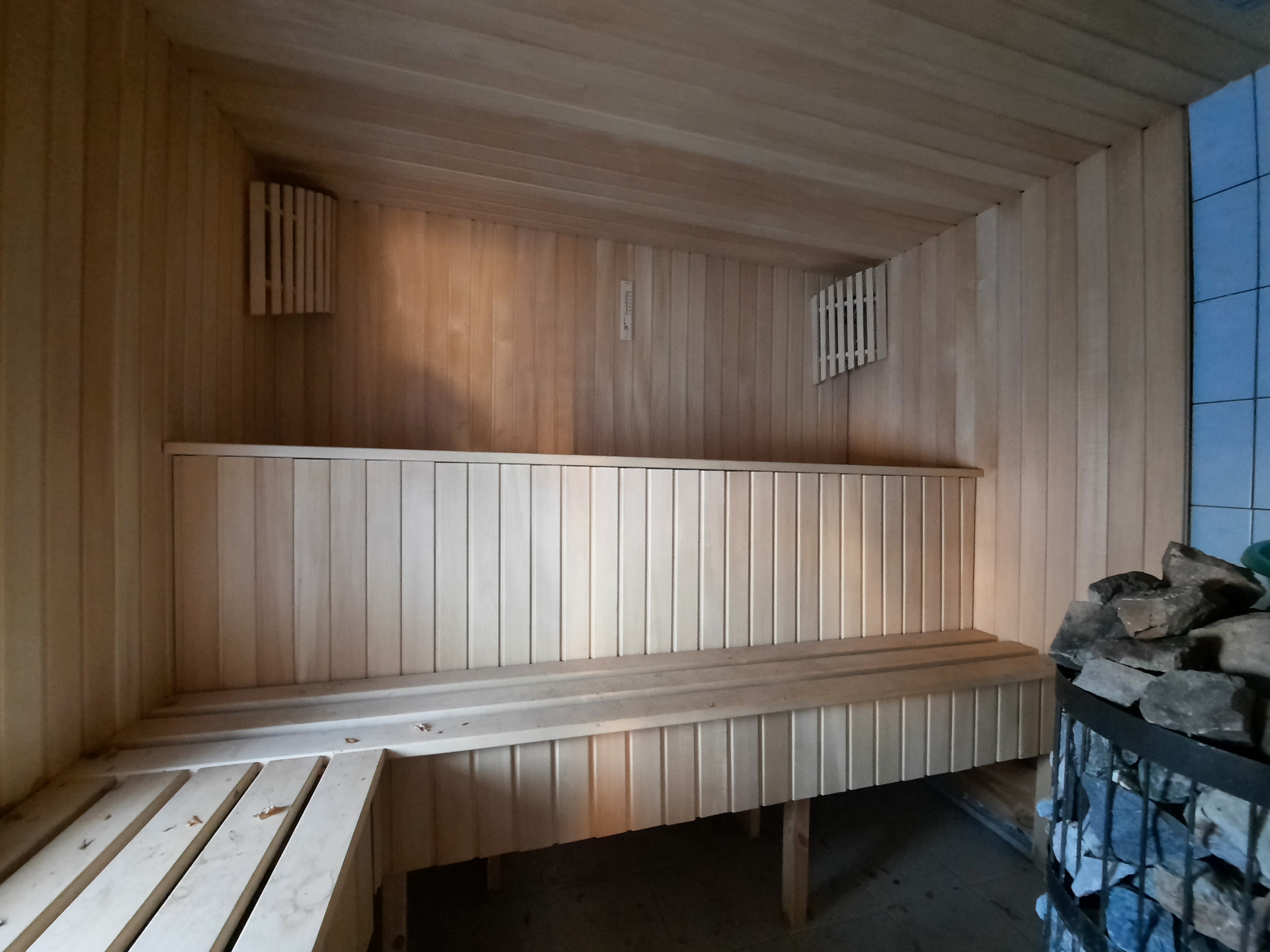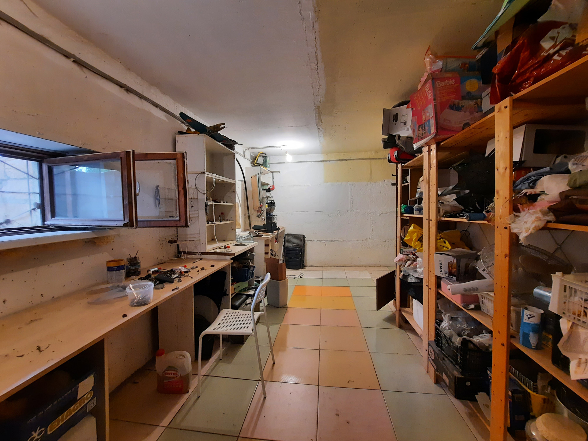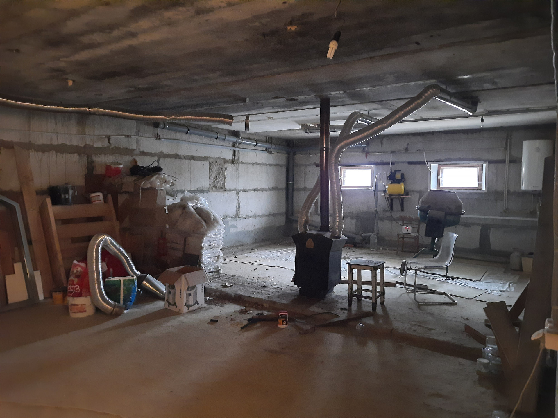 В цокольном этаже площадью 70 кв.м. расположены мастерская со стеллажами и зала с печкой Бутакова с воздуховодами и разводкой по всему дому.
