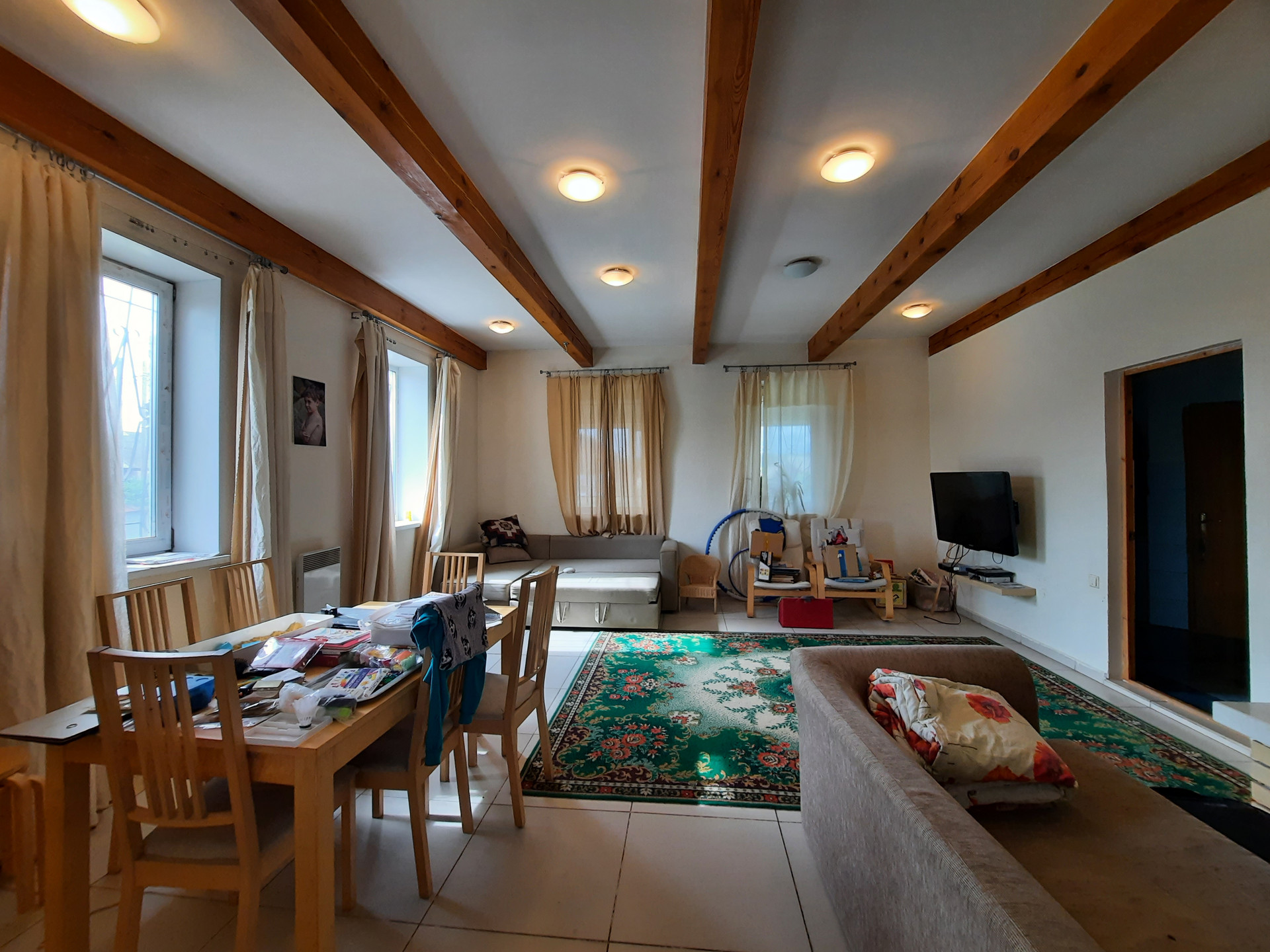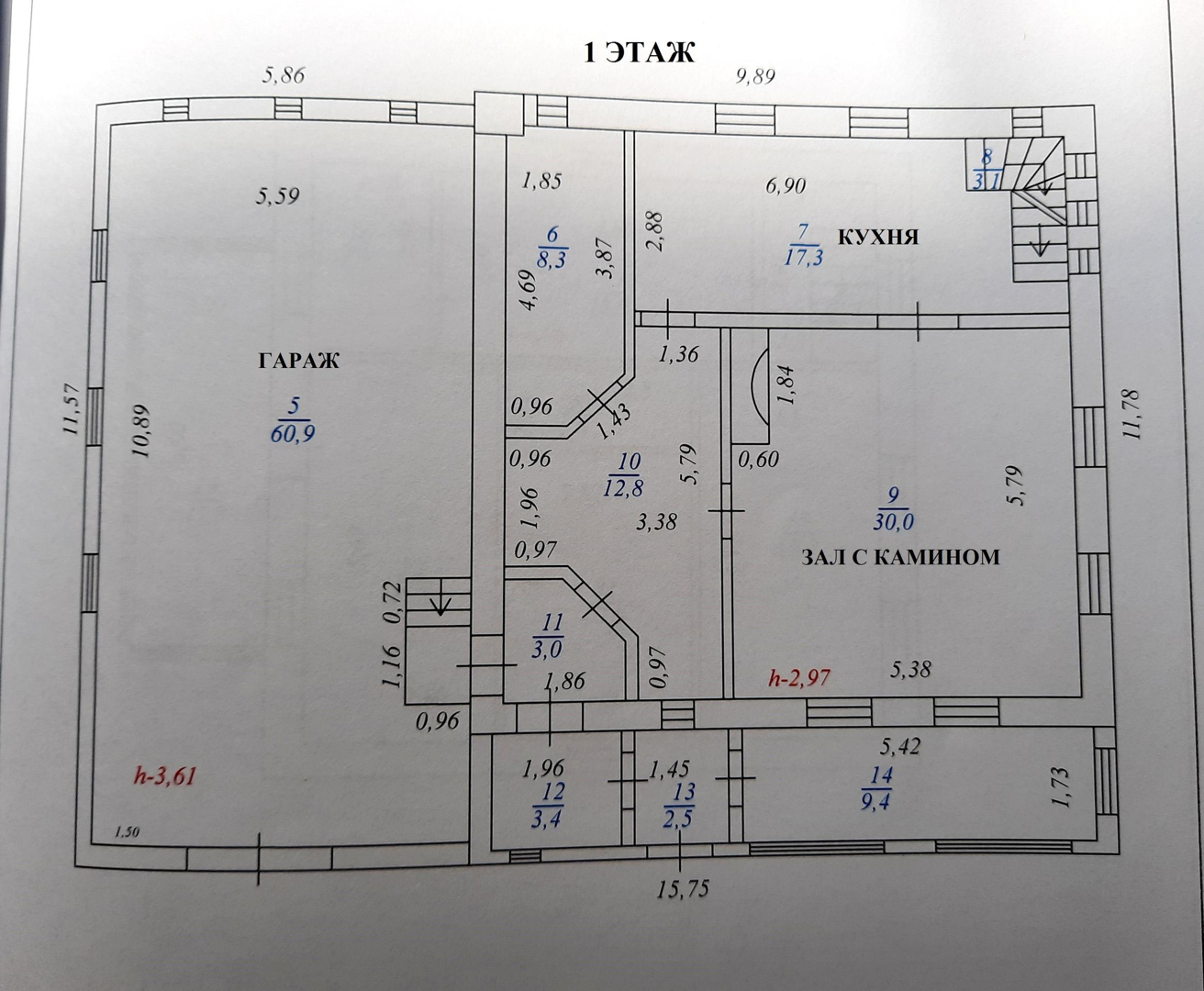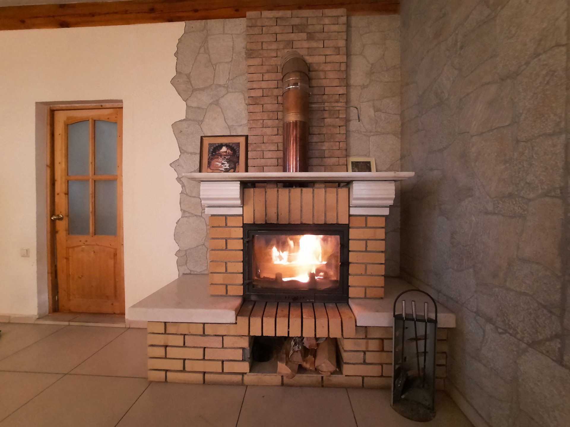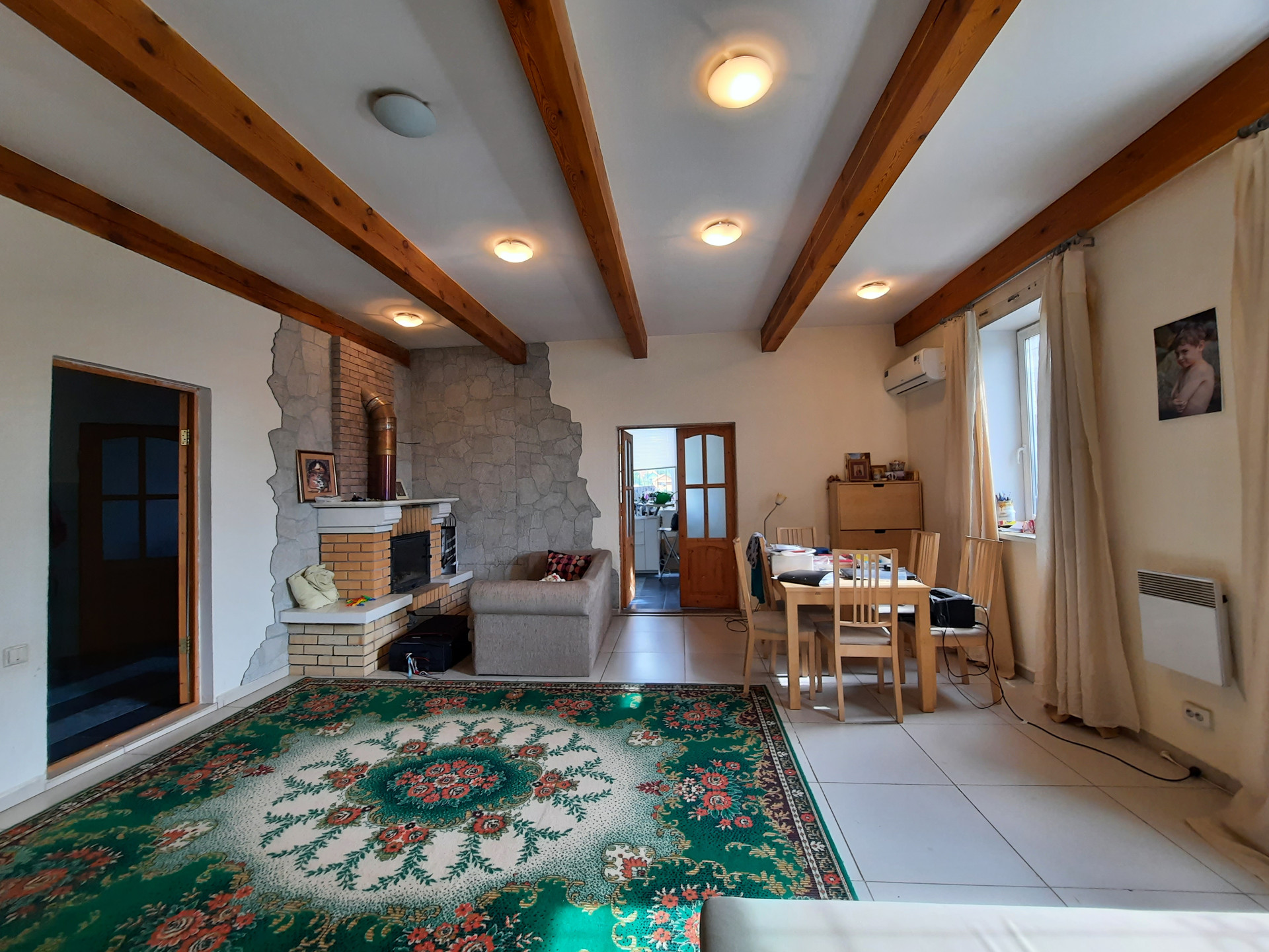На 1 этаже расположены зала с камином (на дровах), кухня со встроенной техникой (17 кв.м.), санузел с ванной, коридор с гардеробной, веранда. Пол на всём 1 этаже отделан кафелем. В коридоре и на кухне – тёплый пол. Потолок высотой 3 метра с фактурными балками.