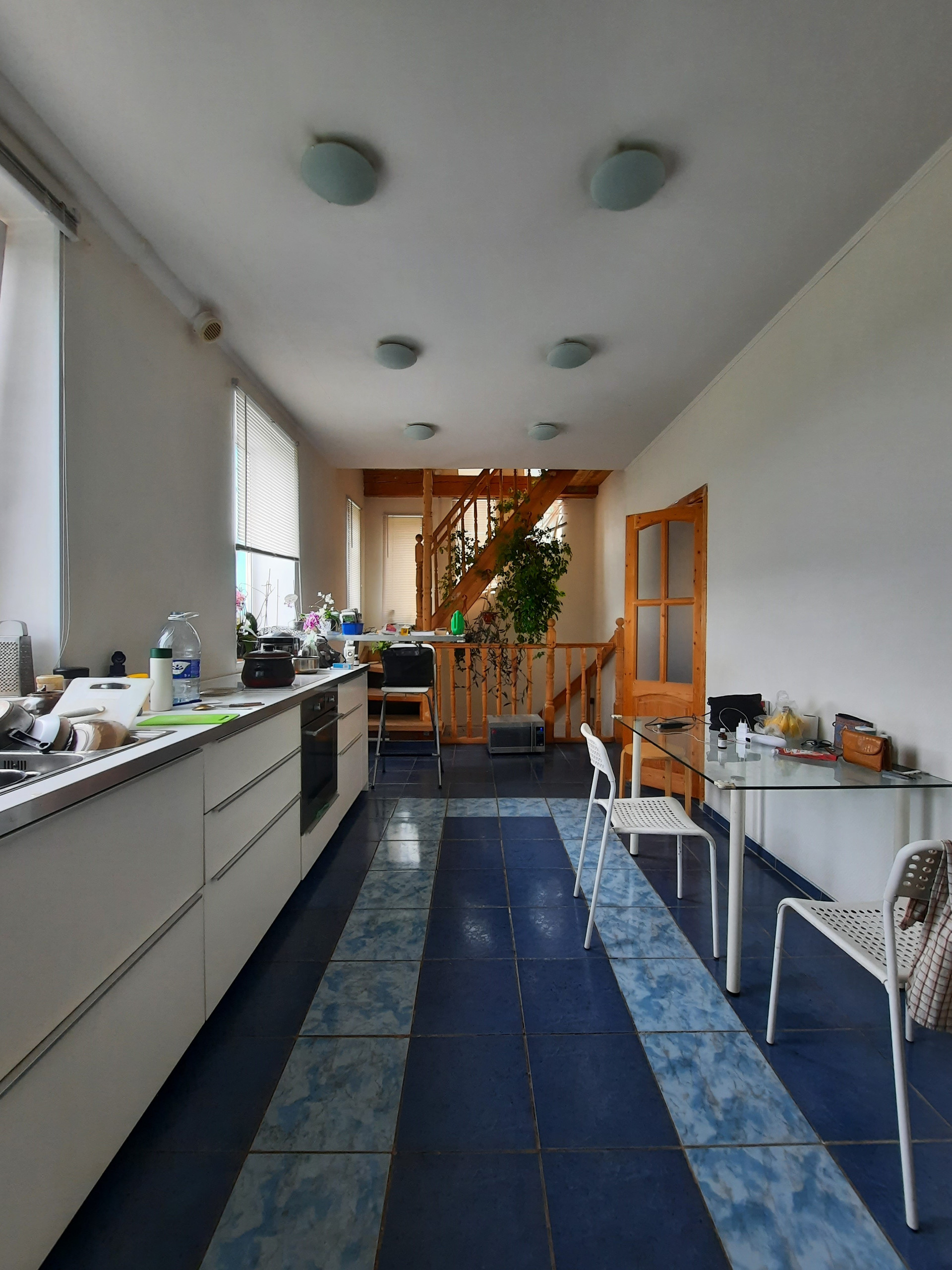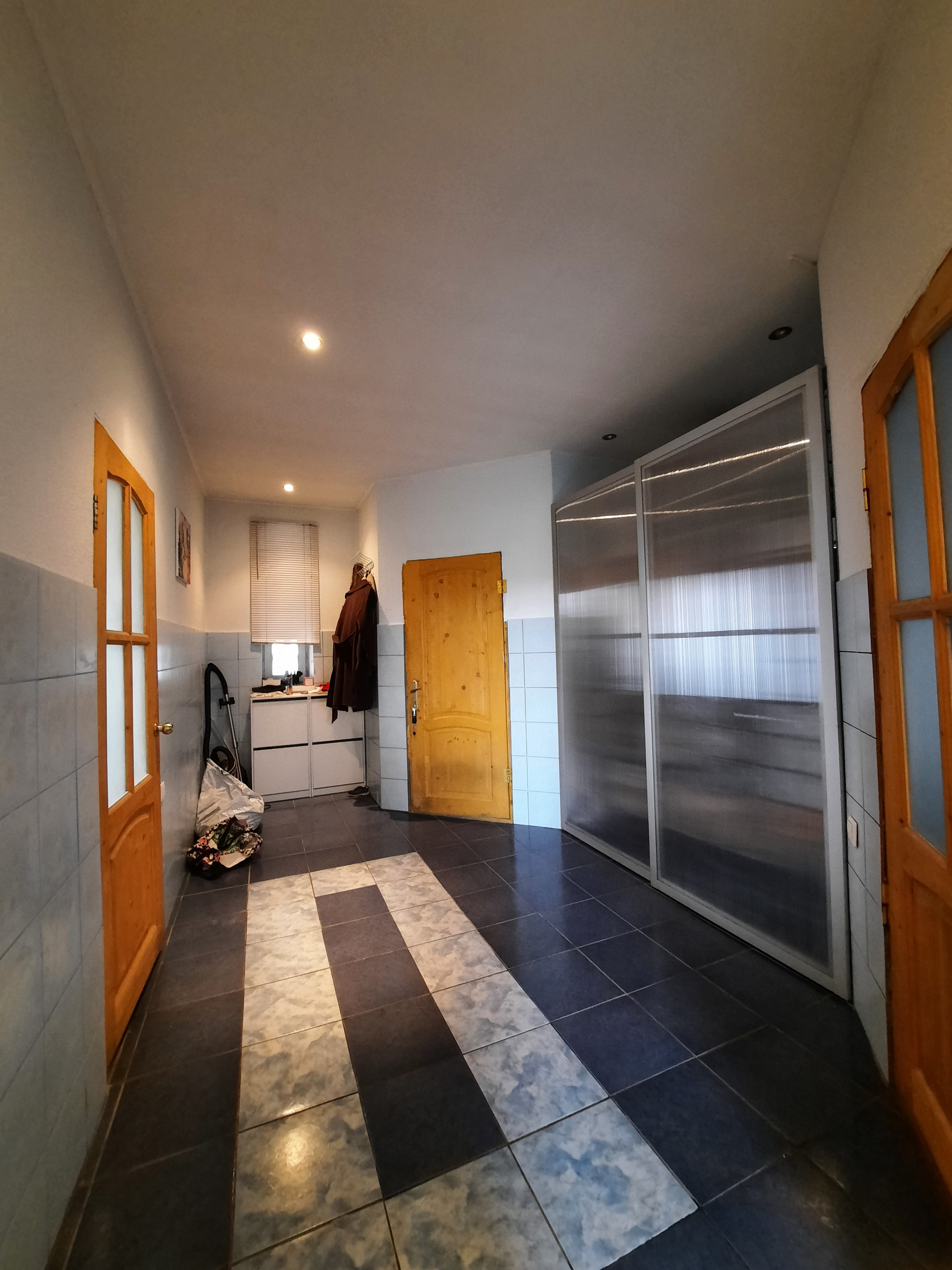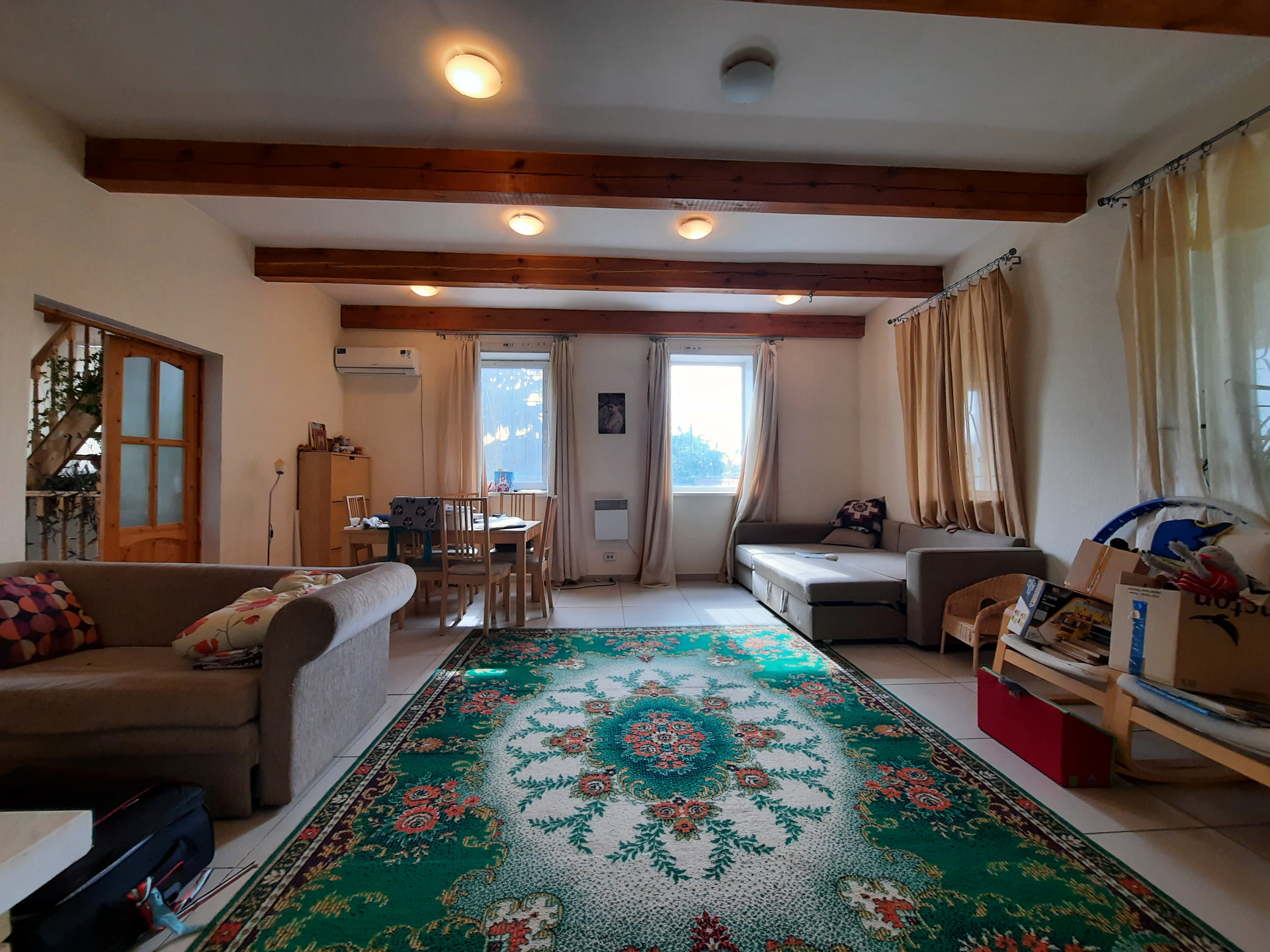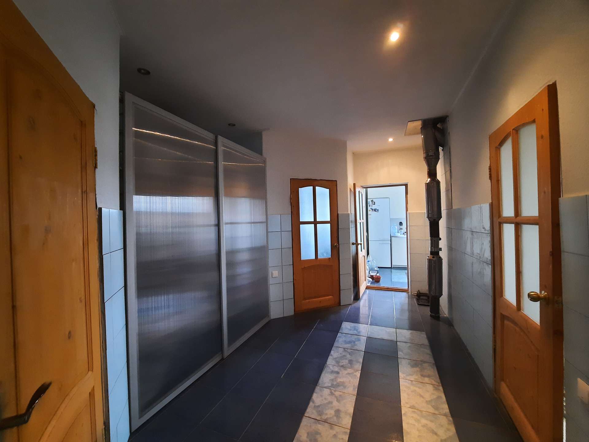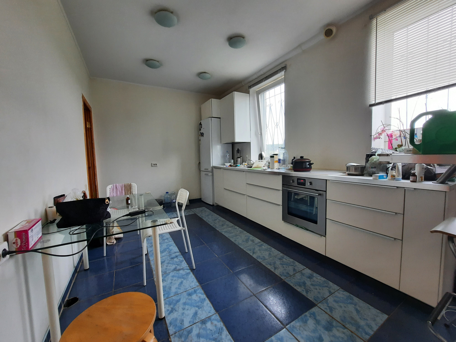 На 1 этаже расположены зала с камином (на дровах), кухня со встроенной техникой (17 кв.м.), санузел с ванной, коридор с гардеробной, веранда. Пол на всём 1 этаже отделан кафелем. В коридоре и на кухне – тёплый пол. Потолок высотой 3 метра с фактурными балками.