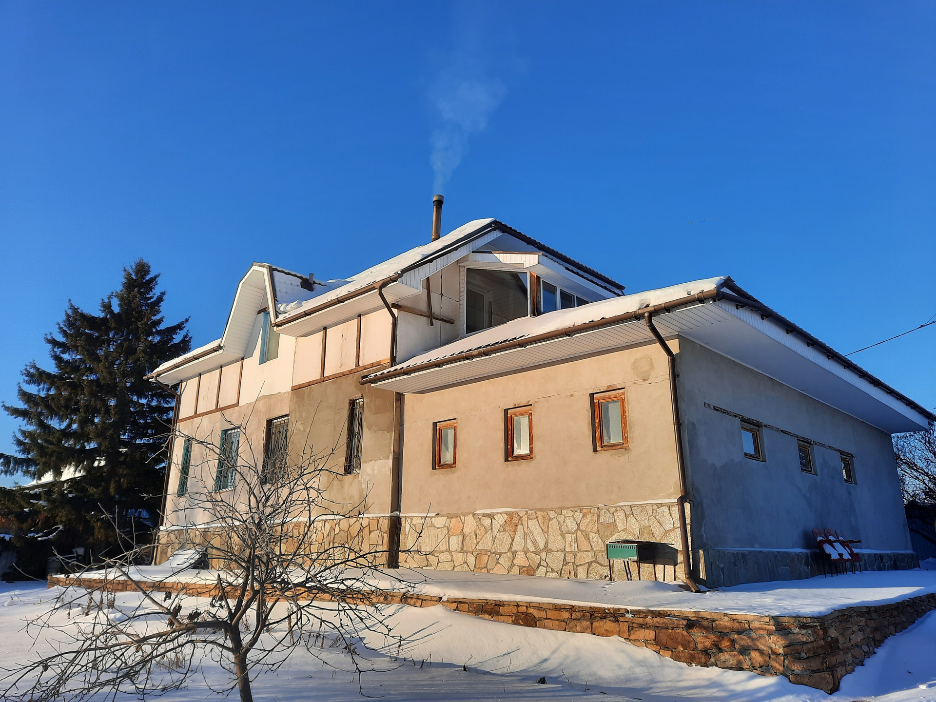 Построен из пеноблоков (завод ЖБИ), утеплённых с 2х сторон. Фундамент из блоков (60 см), пол 1 этажа – плиты перекрытия. Крыша – металлочерепица. Окна пластиковые стеклопакеты. Строительство закончено менее 5 лет назад.