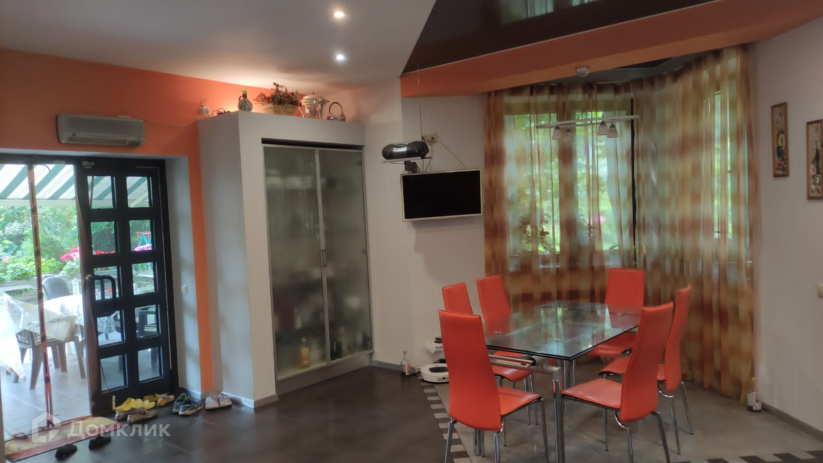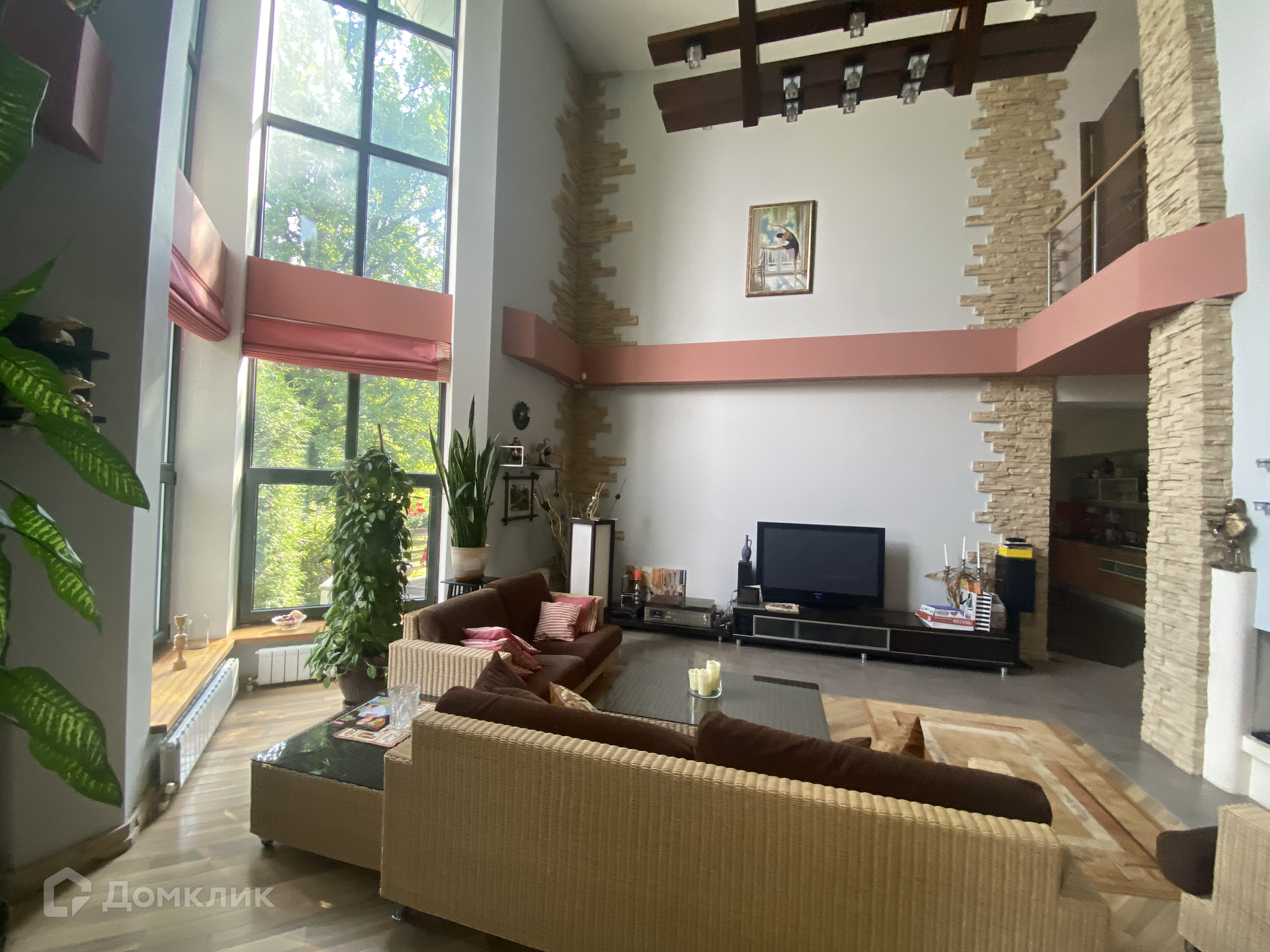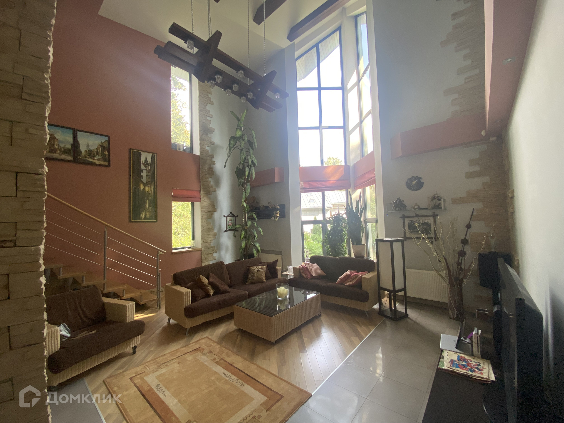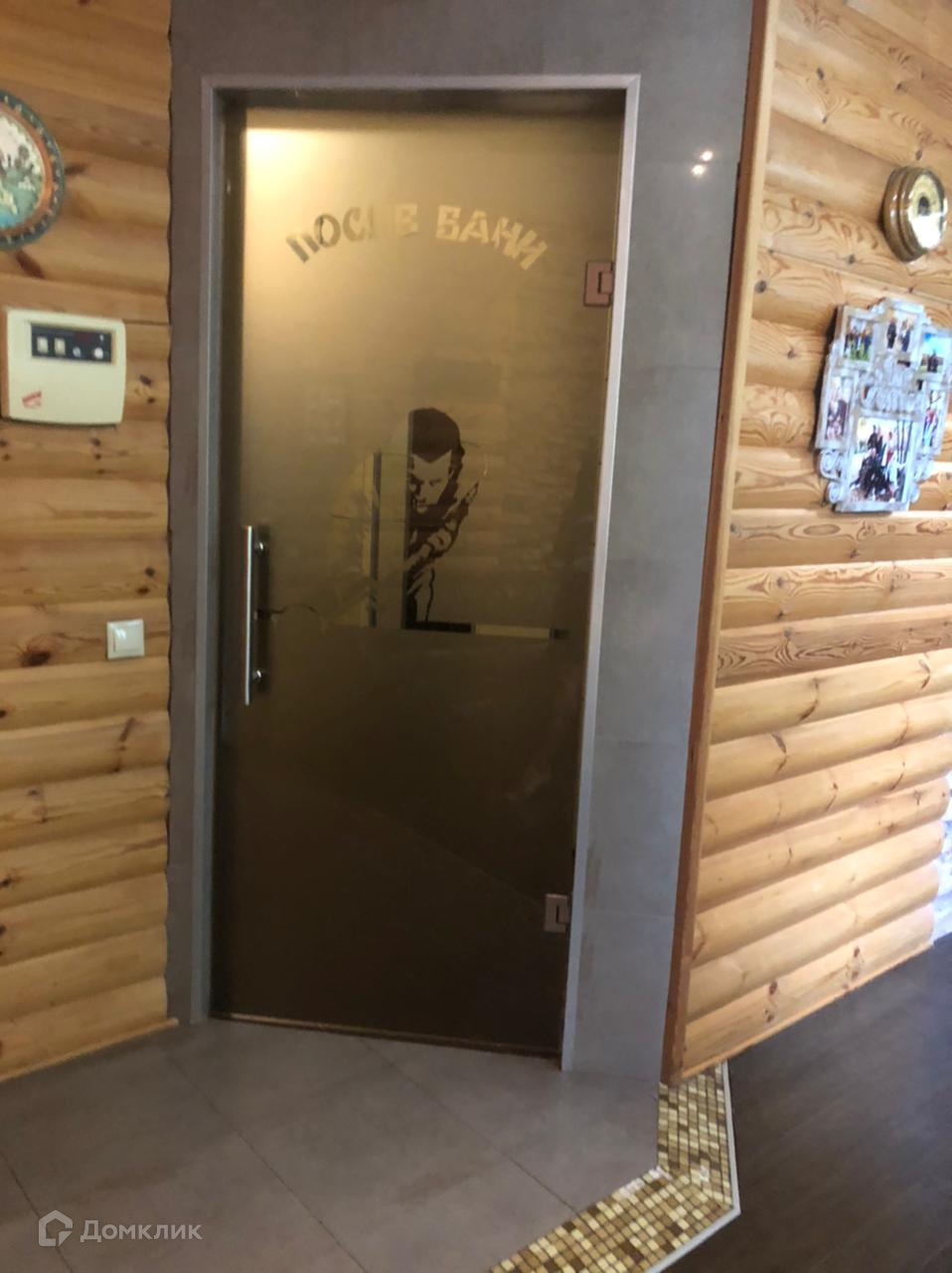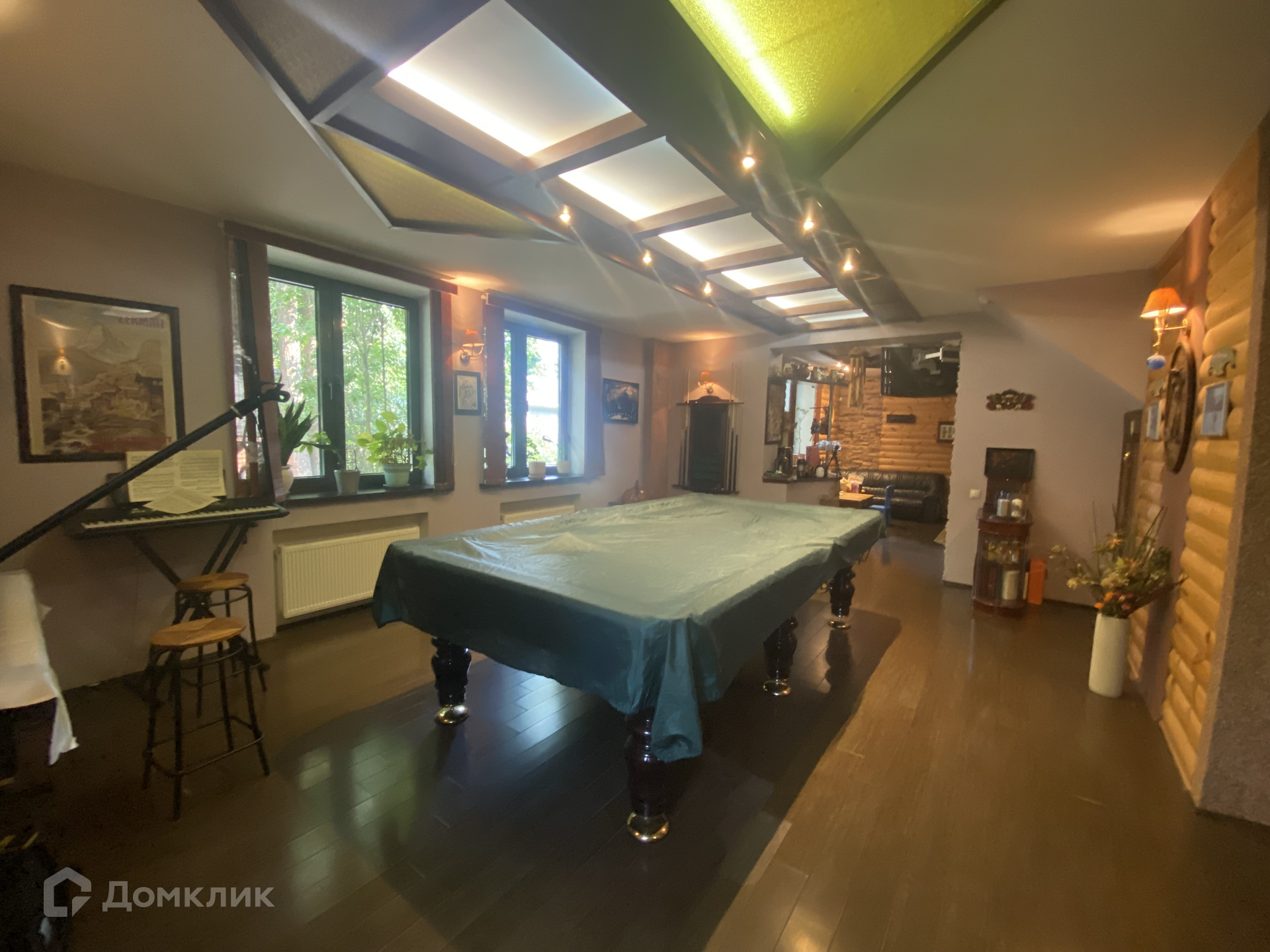 на 1-м этаже: прихожая, кухня-столовая с выходом на патио, гостиная с камином и панорамным остеклением, бильярдная, санузел с ванной и душевой кабиной, сауна с небольшим бассейном и душевой, комната для отдыха, котельная и прачечная комната;