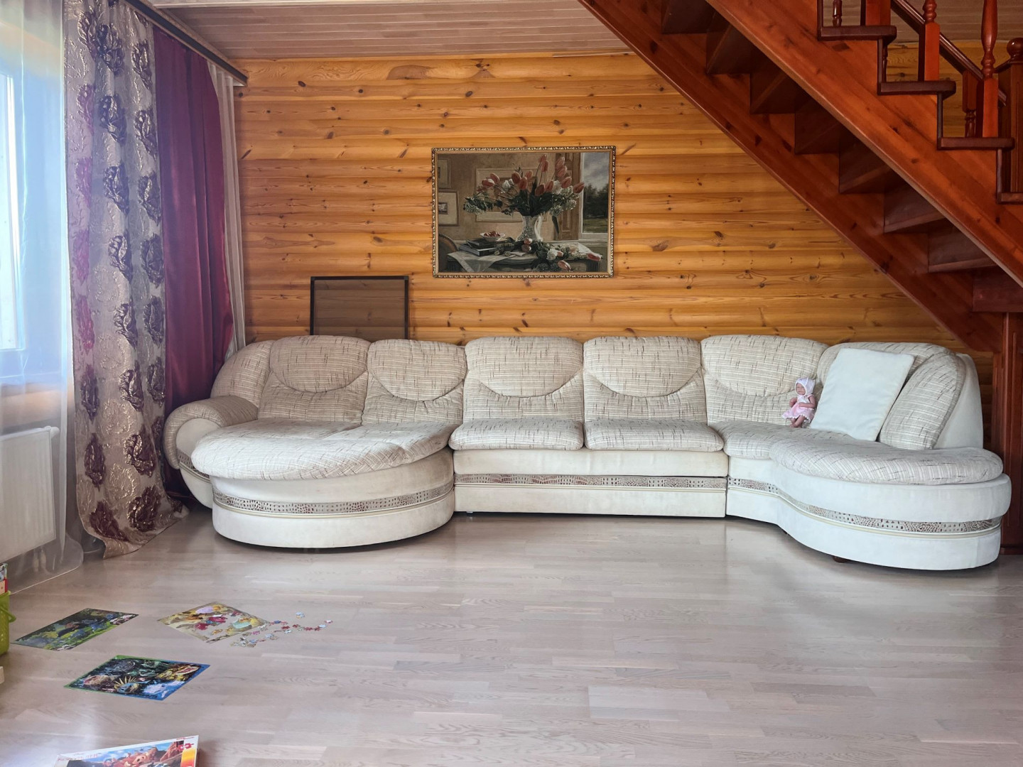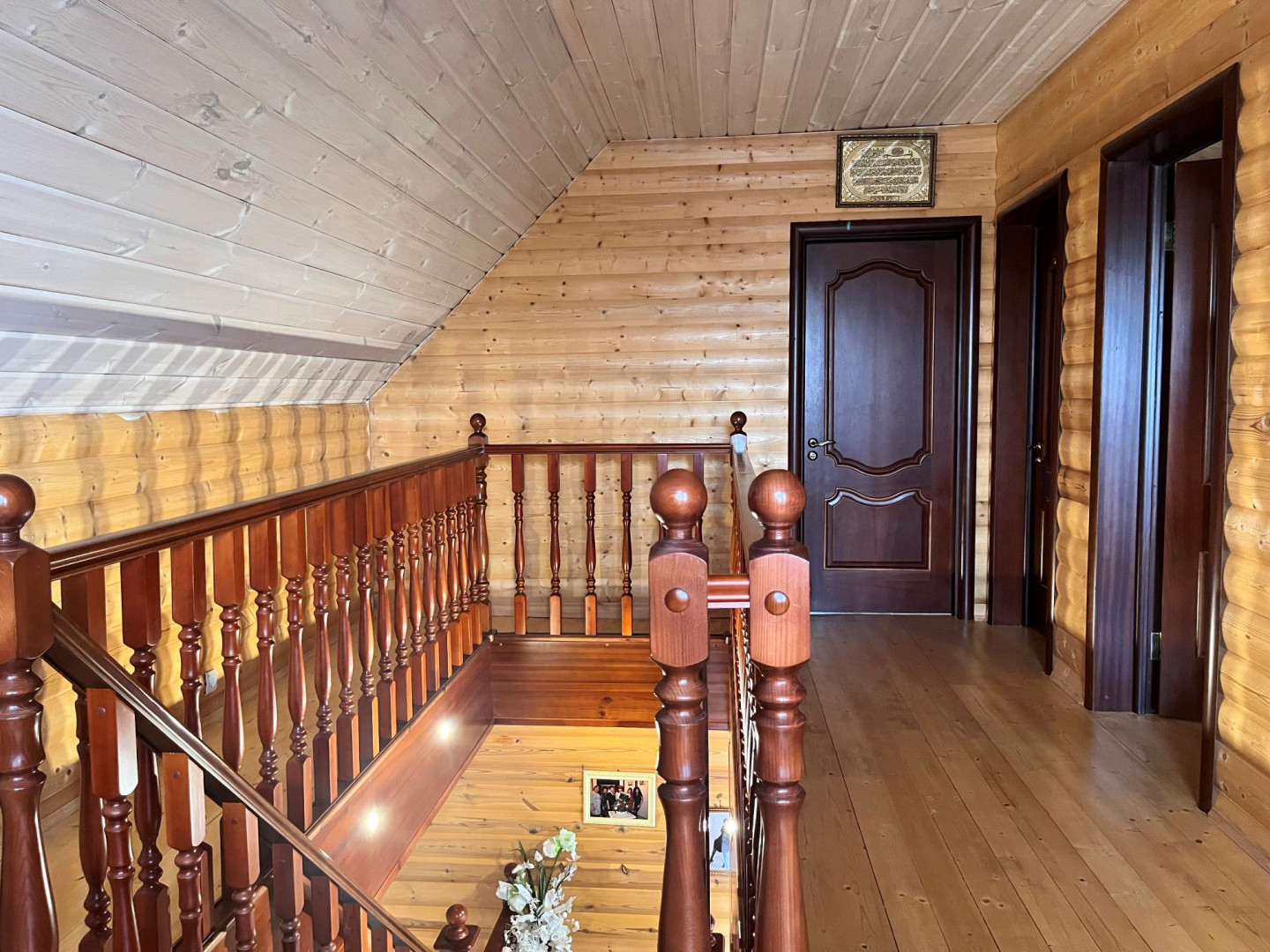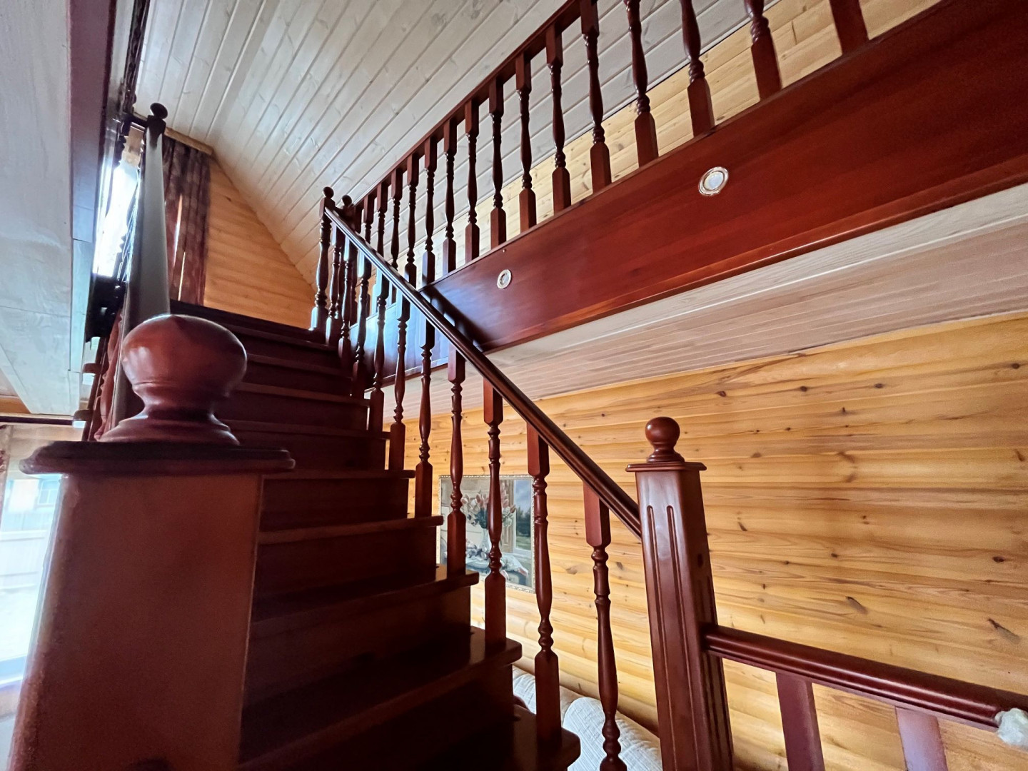 Лестница на второй этаж заказан и привезен из Москвы и задумана как архитектурный элемент и является продолжением деревянного натурального стиля всего дома.