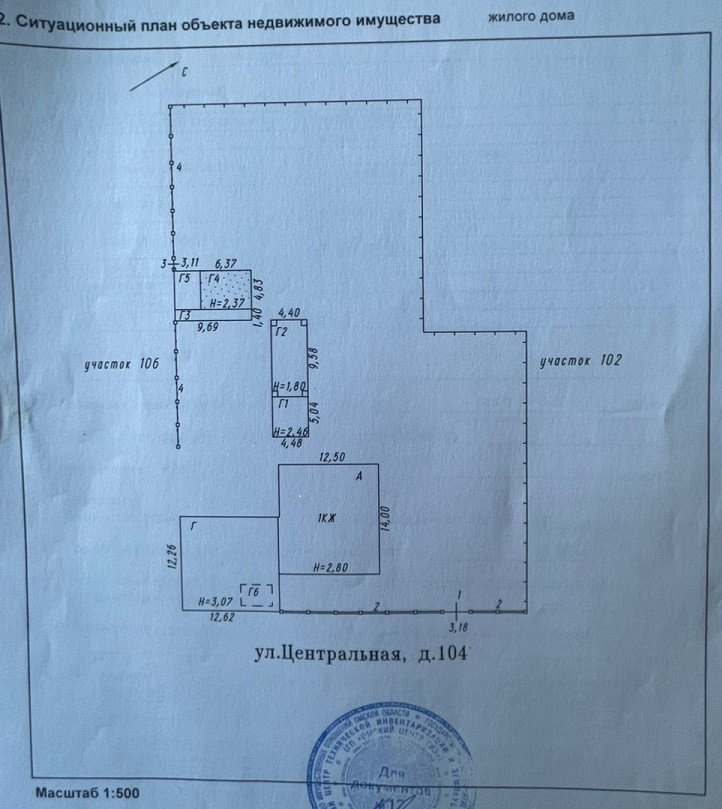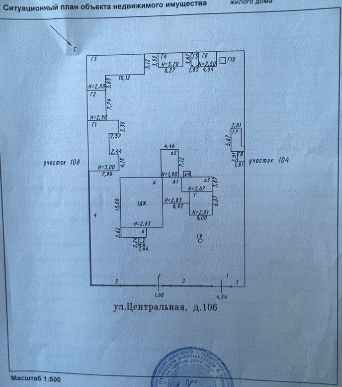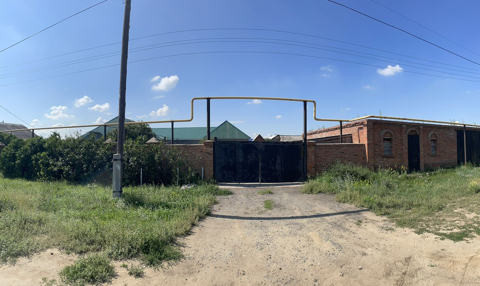 Площадь 2-го недостроенного дома - 143,9 кв.м. К дому пристроено кирпичное 1-этажное строение (см. фото кирпичной постройки справа от въездных ворот), которое построено под продуктовый магазин с гаражом. Гараж вмещает "Газель" и оборудован смотровой ямой. Данный дом (недострой) с кирпичным пристроем и 2-мя хозяйственными постройками (см. план на фото дома №104) находится на земельном участке площадью 2 376 кв.м.
