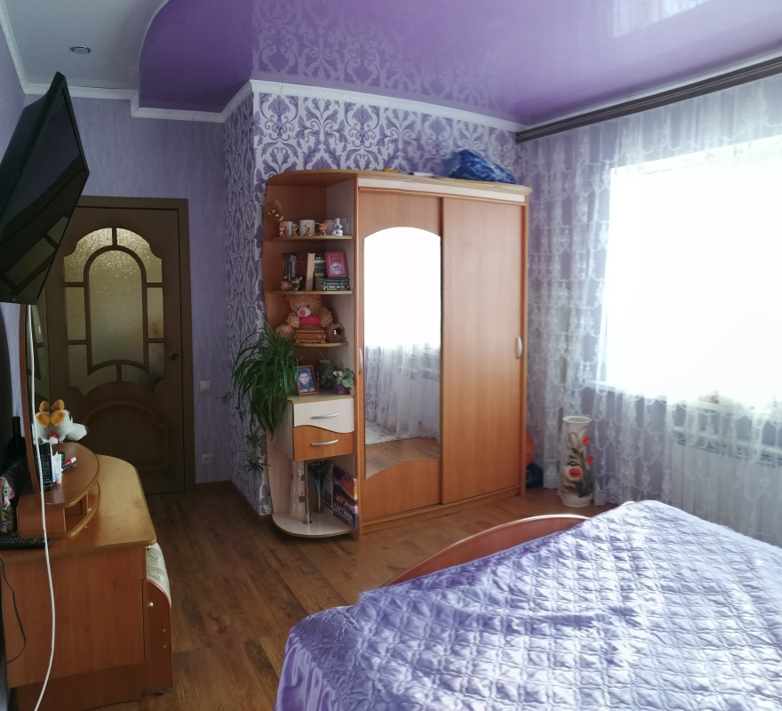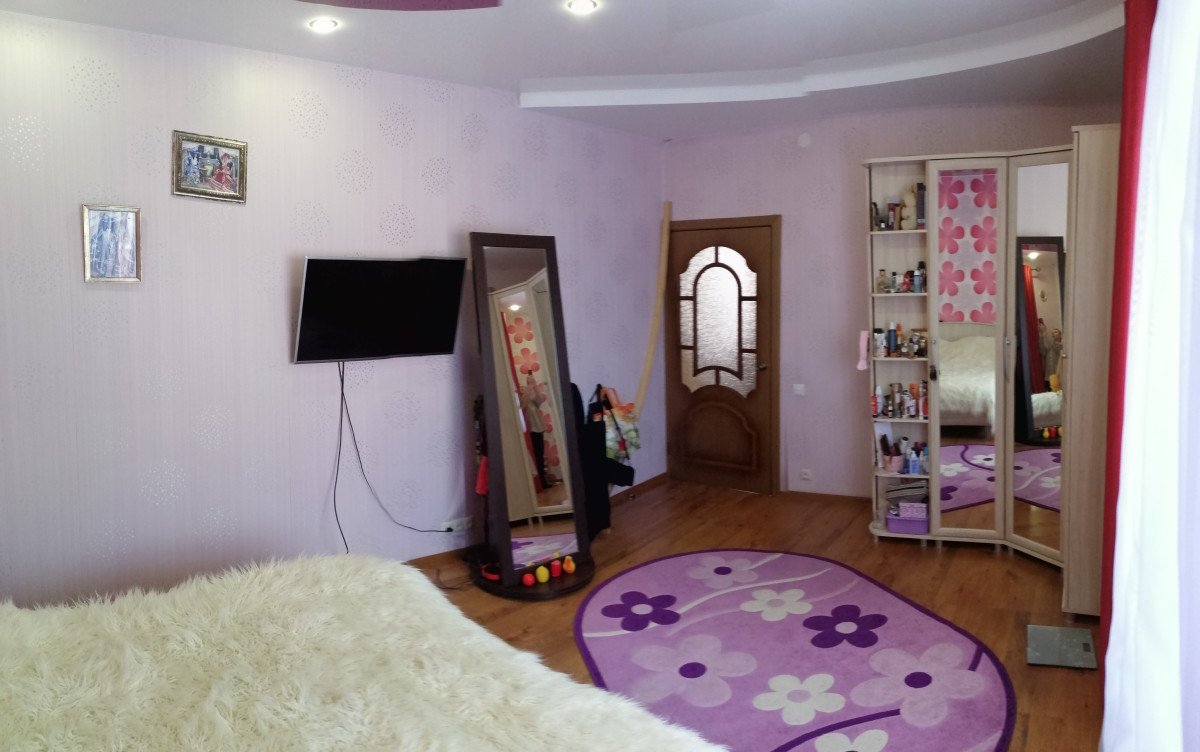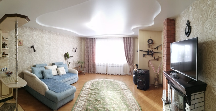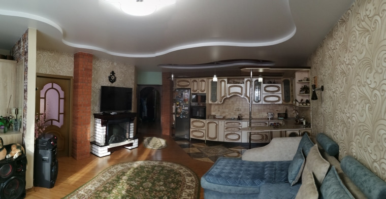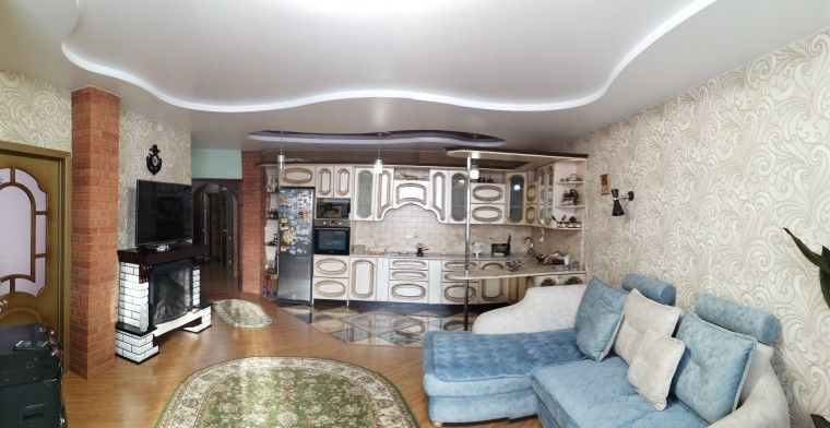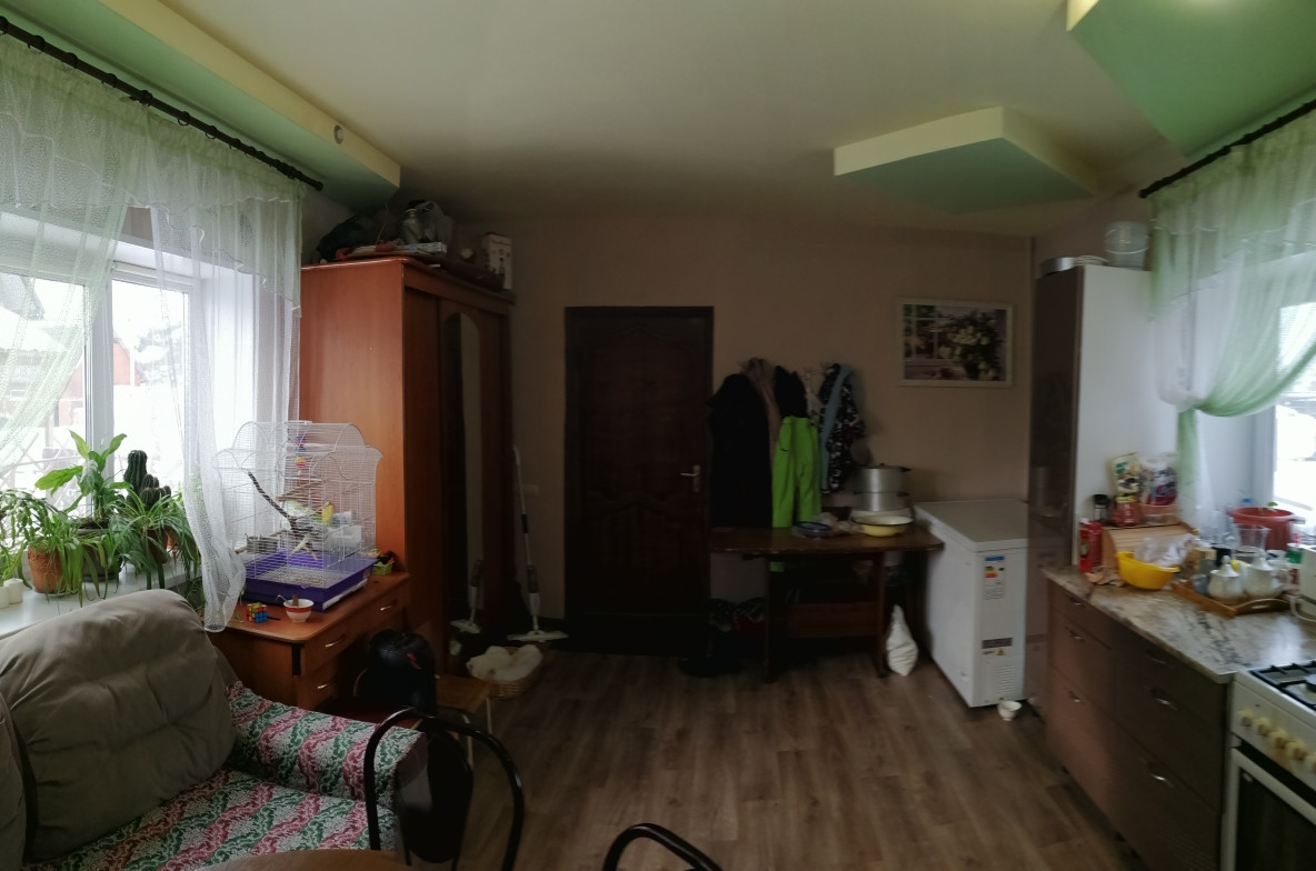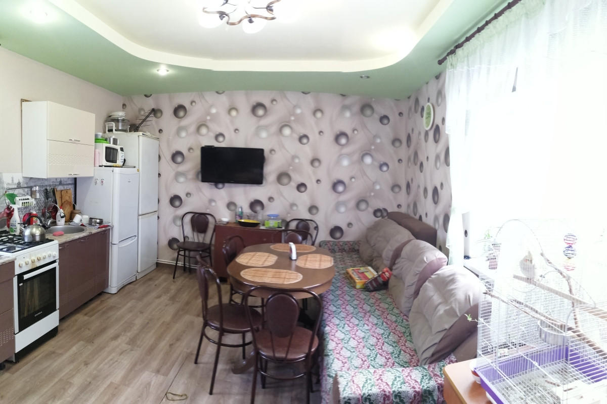 Уютная гостиная удобно поделена на зону гостиной и зону рабочего кухонного пространства. На полу ламинат и теплый кафельный пол. Пластиковые окна, красивые деревянные двери.