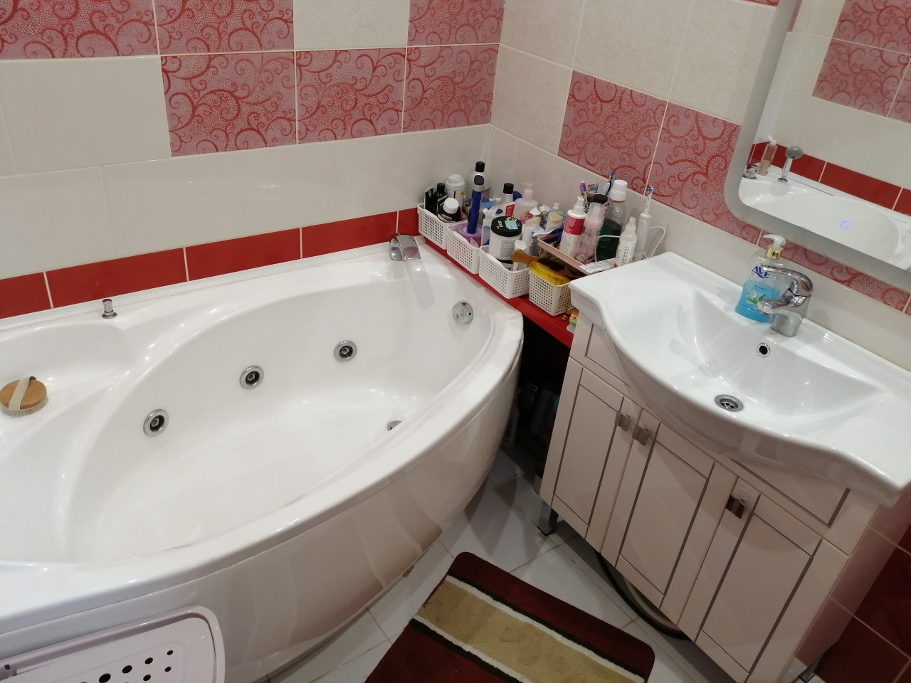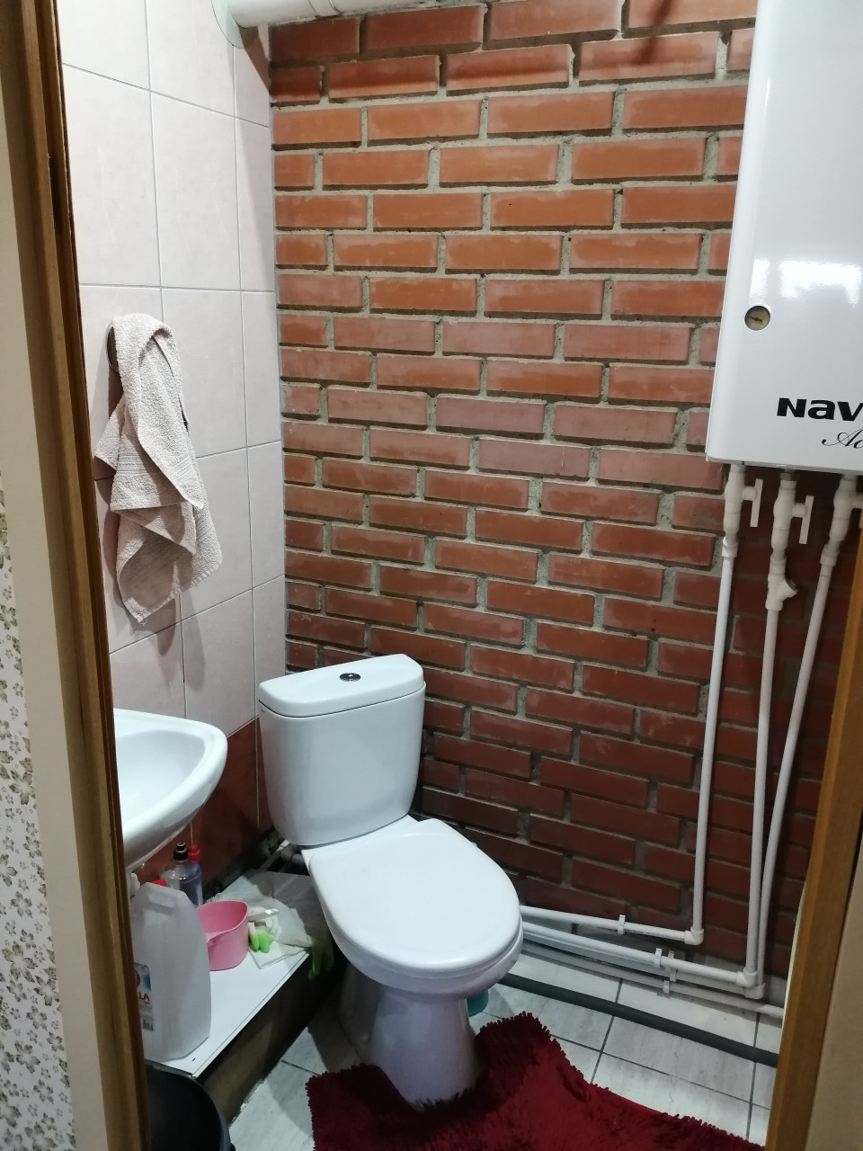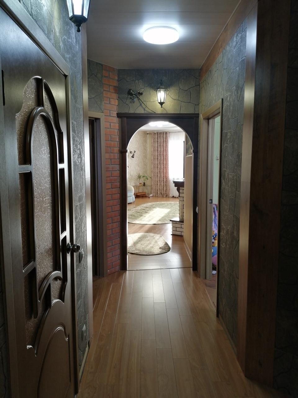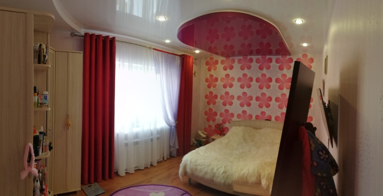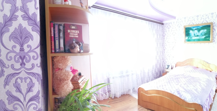Уютная гостиная удобно поделена на зону гостиной и зону рабочего кухонного пространства. На полу ламинат и теплый кафельный пол. Пластиковые окна, красивые деревянные двери.