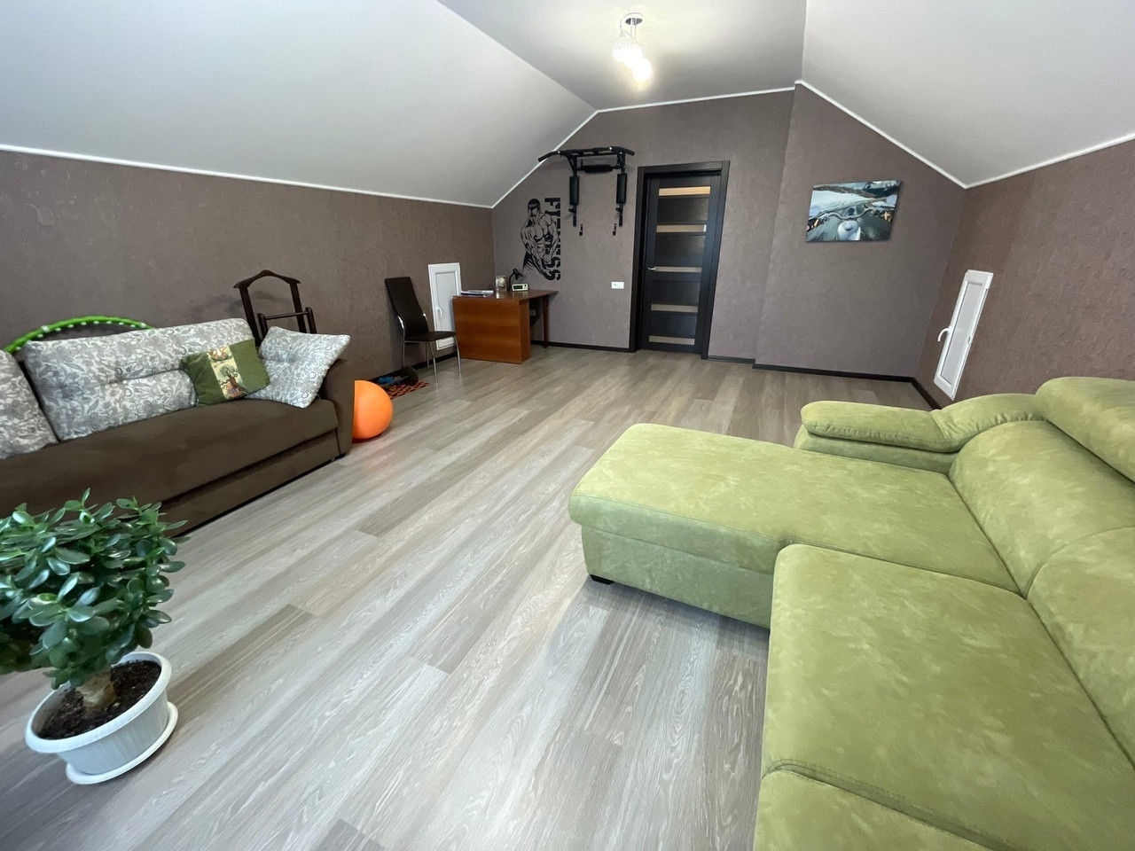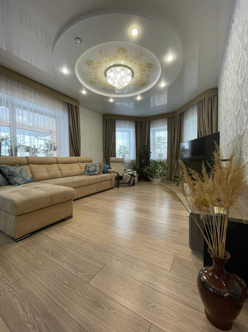 (кухня - студия с гостинной,3 спальни, гардеробная, ванная комната, туалет, котельная). Площадь мансардного этажа - 60,5 кв.м.(две комнаты и туалет). Строили для себя, с соблюдением всех технологий строительства. Внутренняя отделка дома проводилась с использованием качественных дорогих материалов в приятных нейтральных тонах. Первый этаж полностью теплый пол. Установлены качественные окна ПВХ. Установлен двухконтурный котел. Вода - скважина. Электричество 380Вт. Лестница на мансарду выполнена по заказу из дорогого качественного материала.Кухня с выходом на остекленную и открытую террасу. К дому пристроено отапливаемое помещение с ремонтом 80 кв.м. На территории присутствует отдельное комплексное строение(гараж + хозблок + баня). В бане теплый пол из кафеля, стены и потолок обшиты вагонкой из липы, баня на дровах.Огород ухожен, имеется все плодово-ягодные насаждения, цветочные клумбы. Улица тихая. Хорошие подъездные пути (асфальт). До магазина и остановки 200 м.