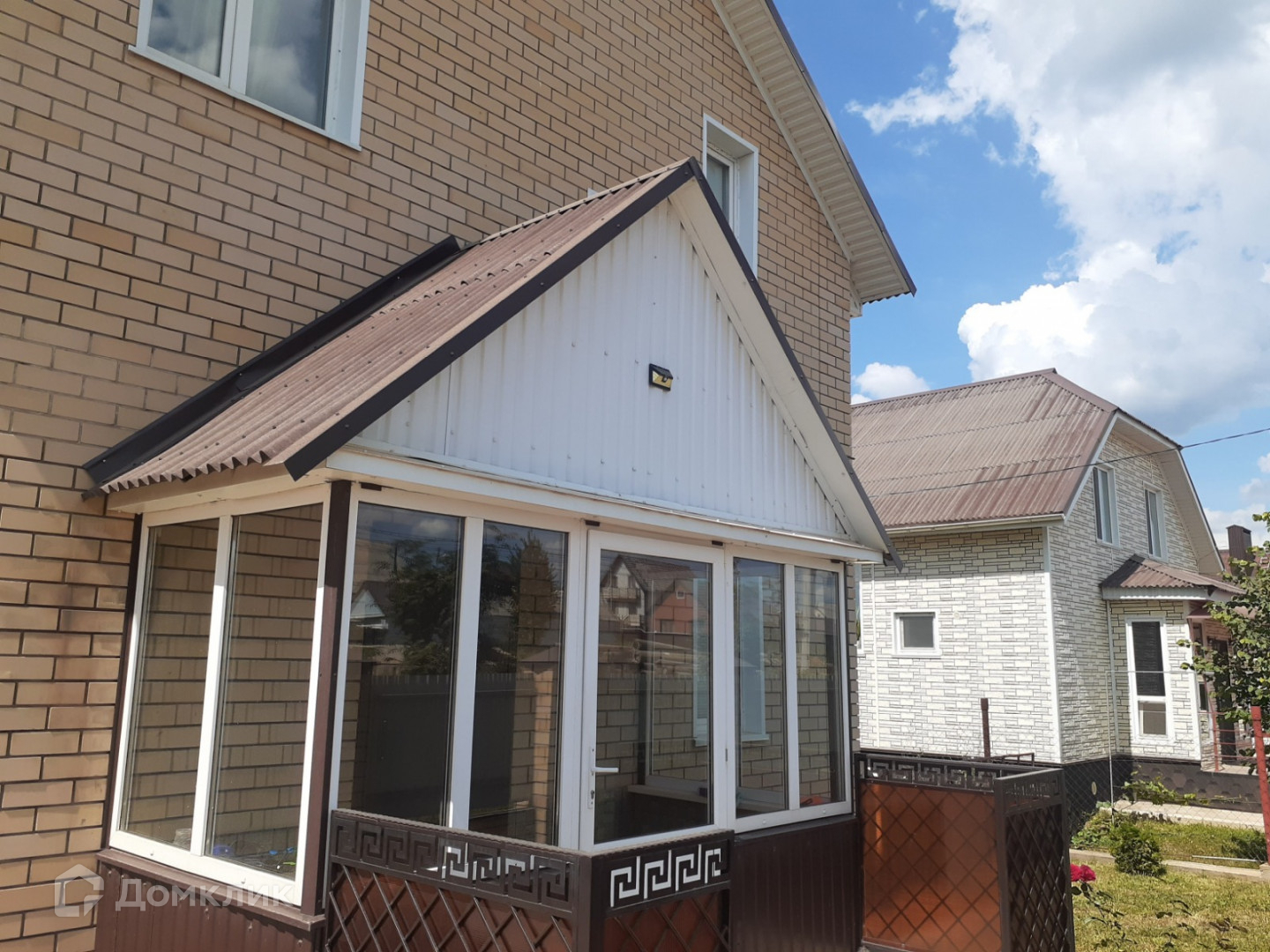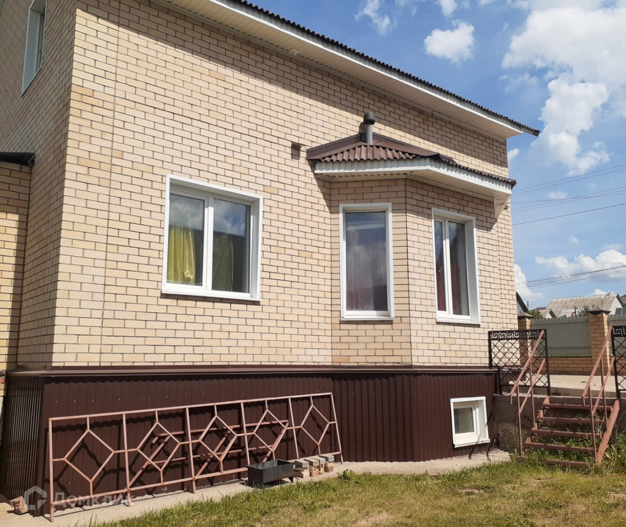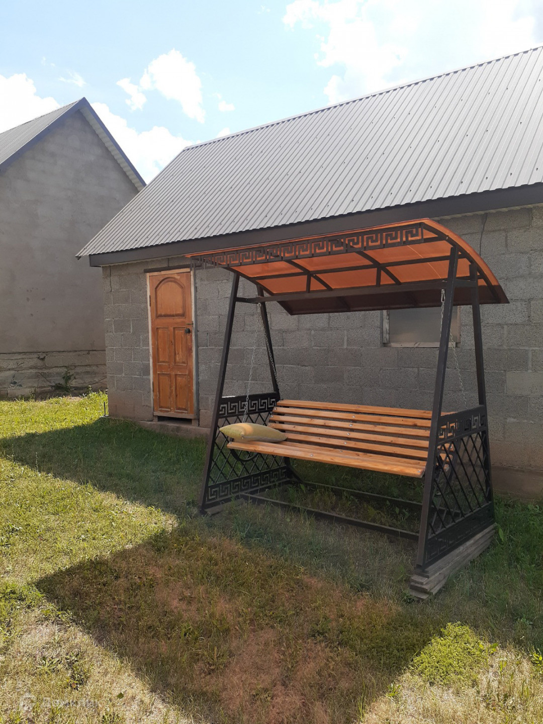 Гараж на 2 машины с автоматическими воротами, корпус бани под крышей, очень красивая веранда с элементами ковки. открывается отличный вид на природу. Во дворе кованные качели в едином стиле с верандой.
