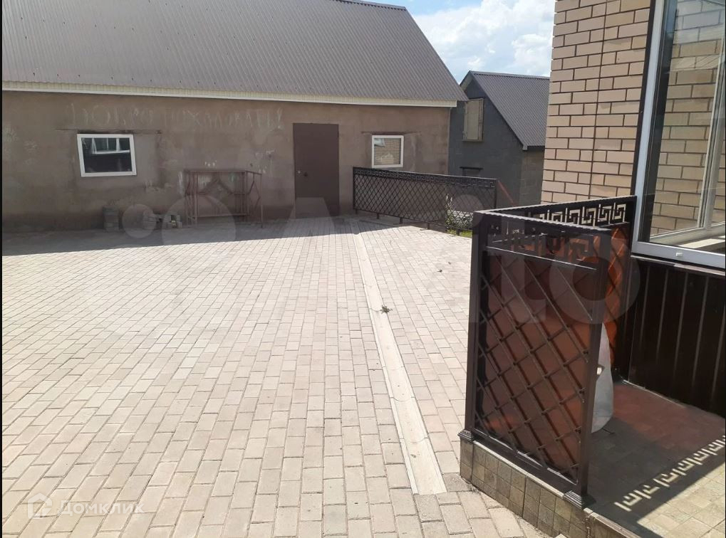 Во дворе  дома брусчатка, перед домом асфальт, ворота с ковкой, забор полный с кирпичной кладкой в одном стиле с домом.