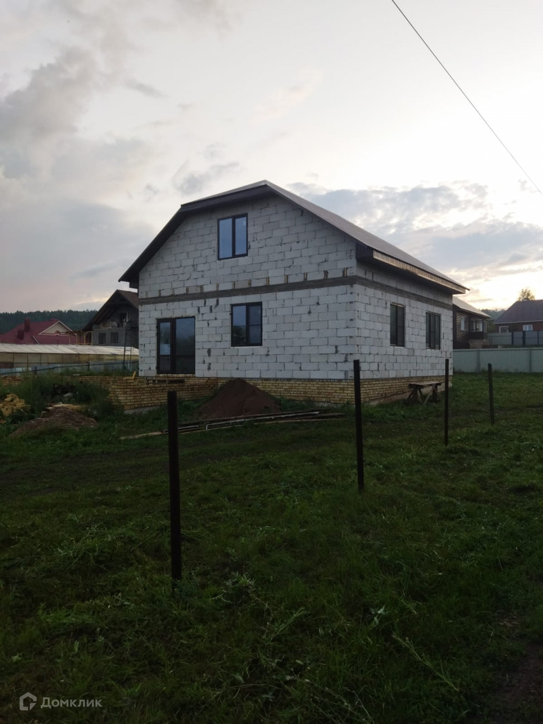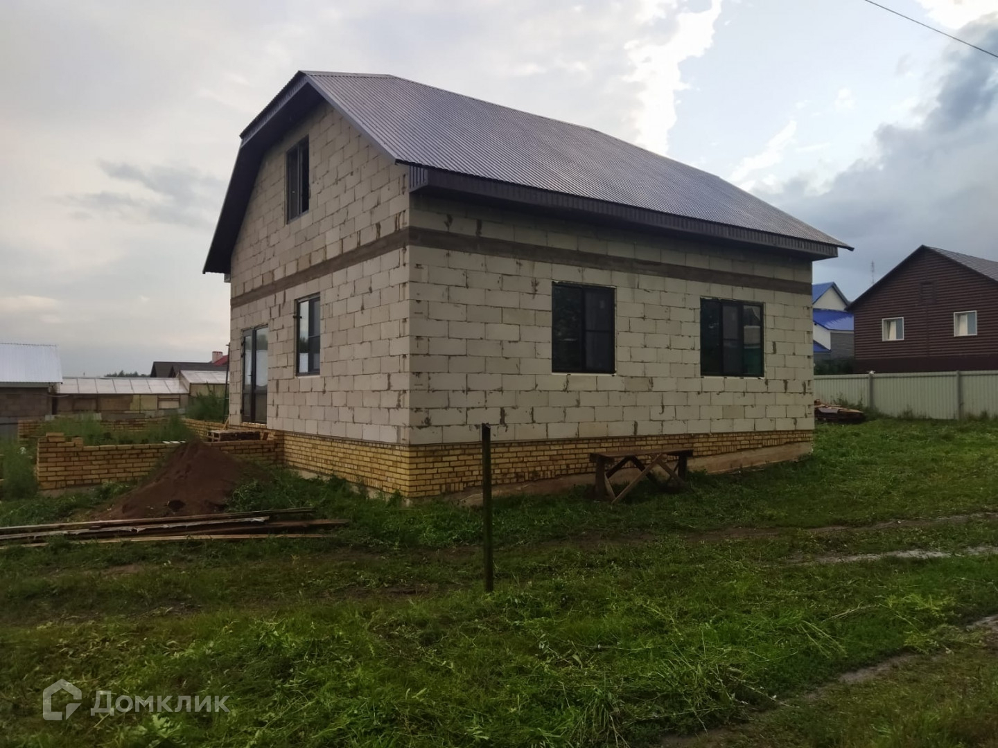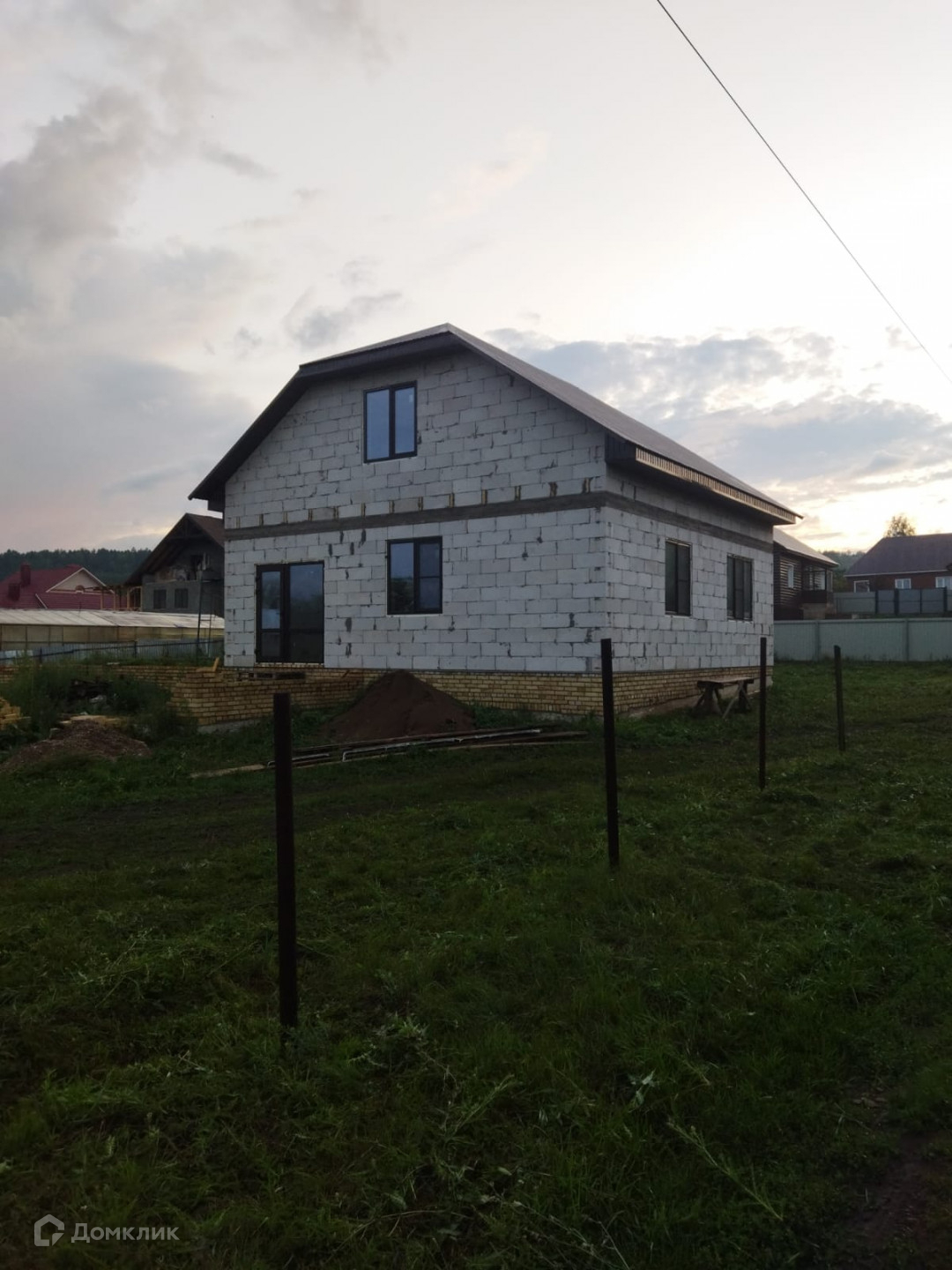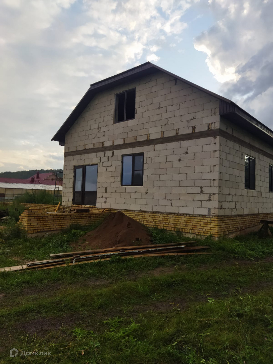 Дом построен из газоблока, установлены окна, крыша перекрыта профнастилом.