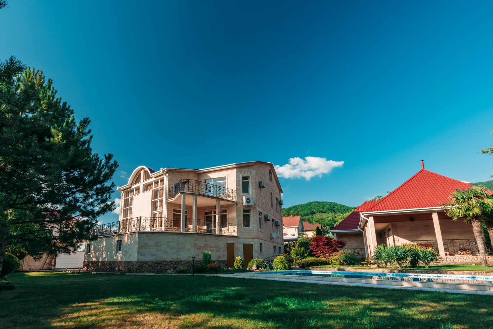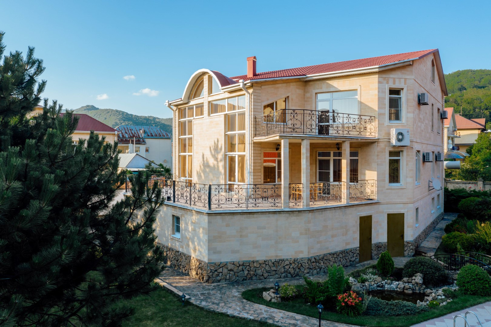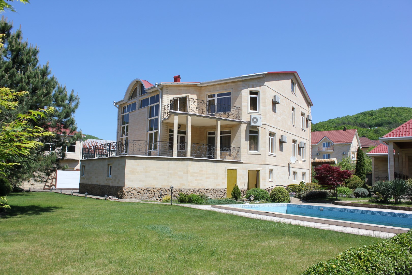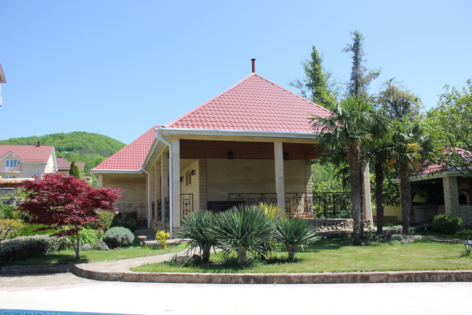 Двухэтажный гостевой дом 179,1 кв. Первый этаж: сауна с комнатой отдыха, кухня столовая 48,1 кв.м., санузел, душевая. На мансардный этаж ведет лестница из натурального дерева. Мансардный этаж: две комнаты для отдыха 26,3 и 37,3 кв.м., санузел. Подведены все коммуникации, имеется современная котельная на ЖТ, отопительная система, система очистки воды. Полив растений и газонов водой из ручья. Вода закачивается в емкость 5 кубов. На территории также расположены: беседка, зона барбекю. Подстанция – 230 кВт на 30 домов. Использование электроэнергии по необходимости. Есть личная подстанция на 4,5 кВт. Подведены трубы для газа к котлу отопления, соседи газом уже пользуются. Проведены городской телефон и сигнализация. Под охраной оба дома и периметр территории. Возможна прописка (есть у соседей).