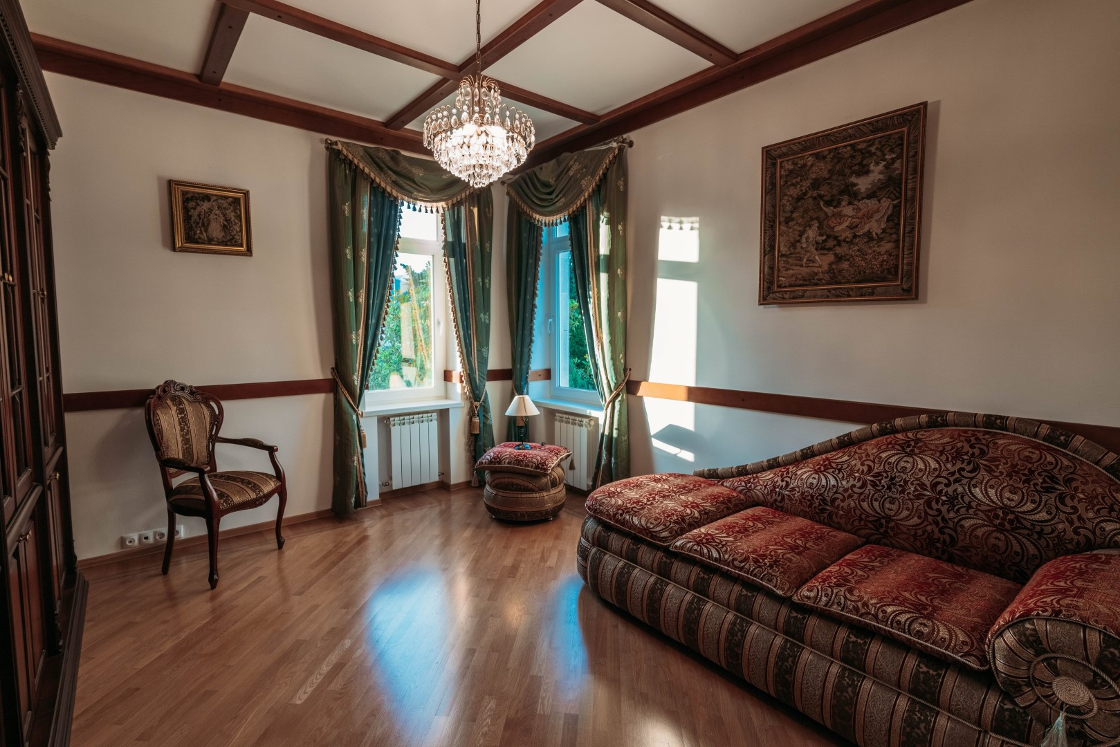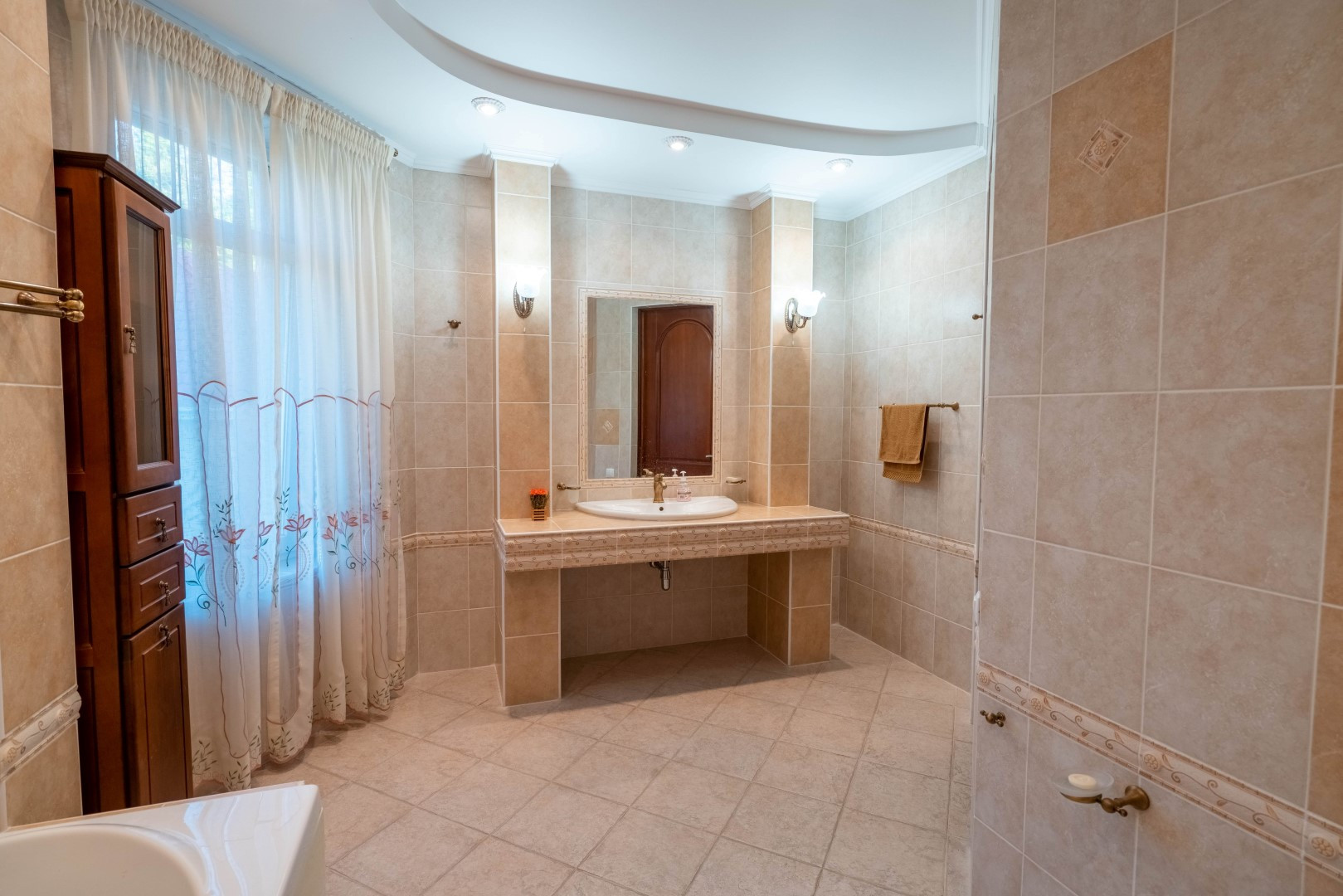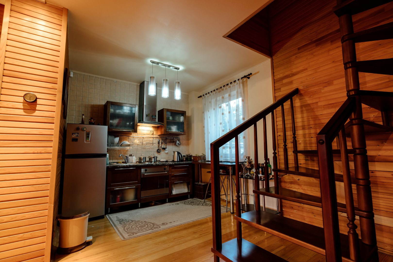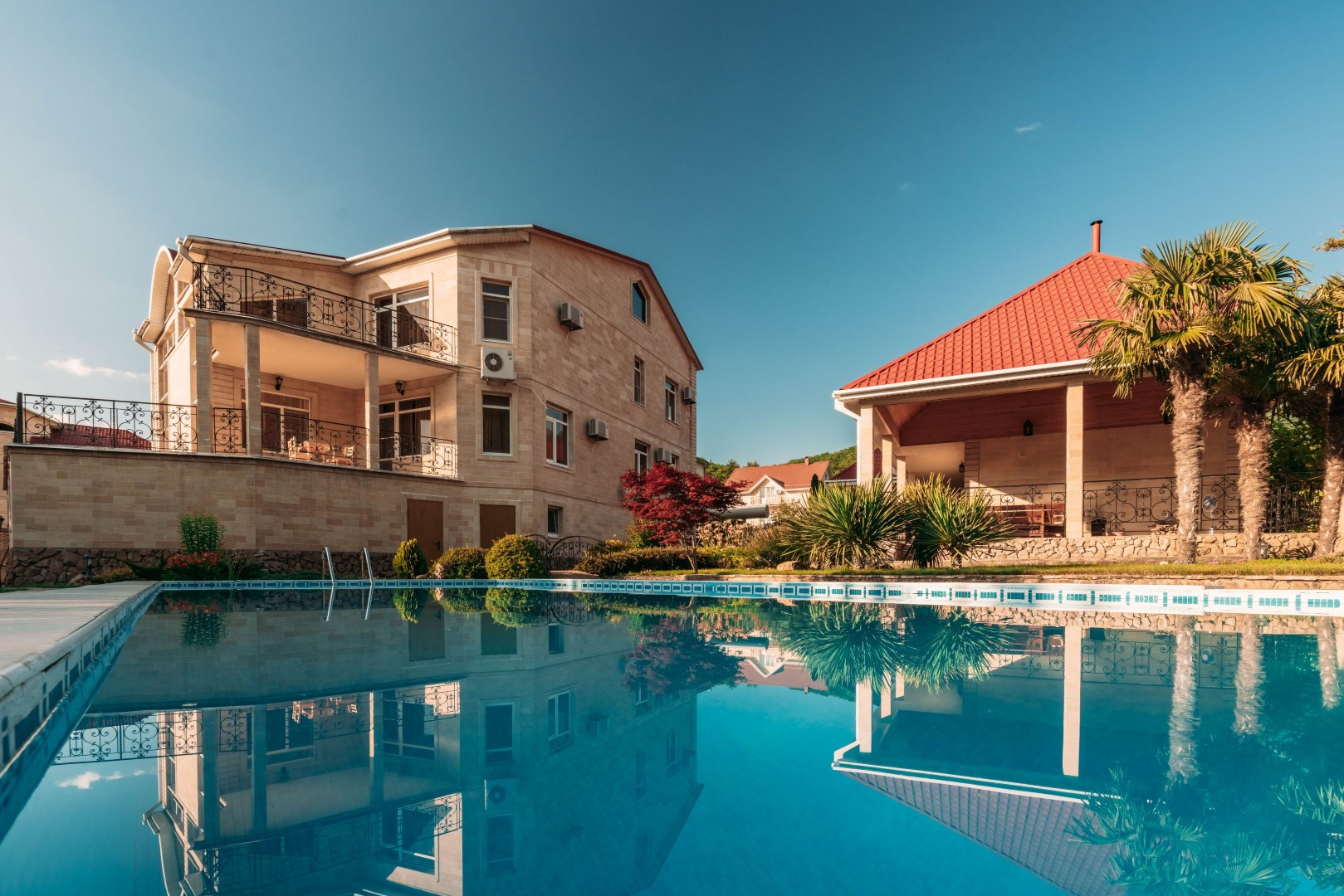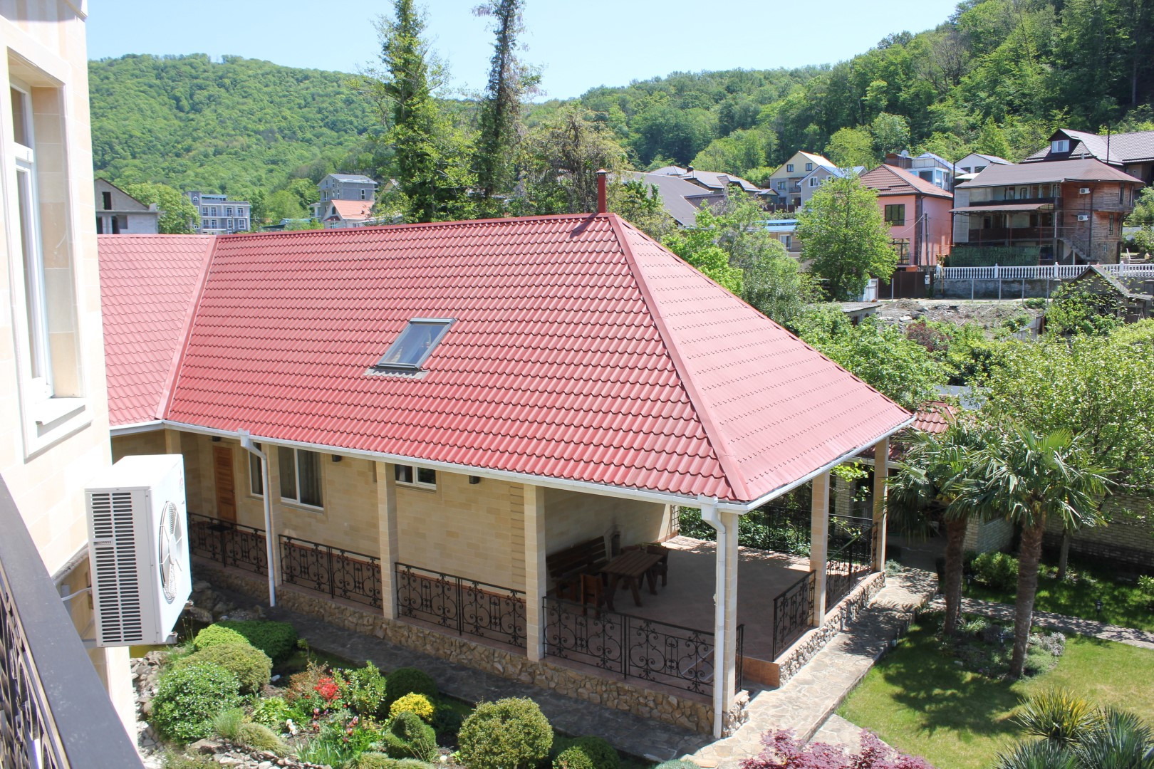 Двухэтажный гостевой дом 179,1 кв. Первый этаж: сауна с комнатой отдыха, кухня столовая 48,1 кв.м., санузел, душевая. На мансардный этаж ведет лестница из натурального дерева. Мансардный этаж: две комнаты для отдыха 26,3 и 37,3 кв.м., санузел. Подведены все коммуникации, имеется современная котельная на ЖТ, отопительная система, система очистки воды. Полив растений и газонов водой из ручья. Вода закачивается в емкость 5 кубов. На территории также расположены: беседка, зона барбекю. Подстанция – 230 кВт на 30 домов. Использование электроэнергии по необходимости. Есть личная подстанция на 4,5 кВт. Подведены трубы для газа к котлу отопления, соседи газом уже пользуются. Проведены городской телефон и сигнализация. Под охраной оба дома и периметр территории. Возможна прописка (есть у соседей).