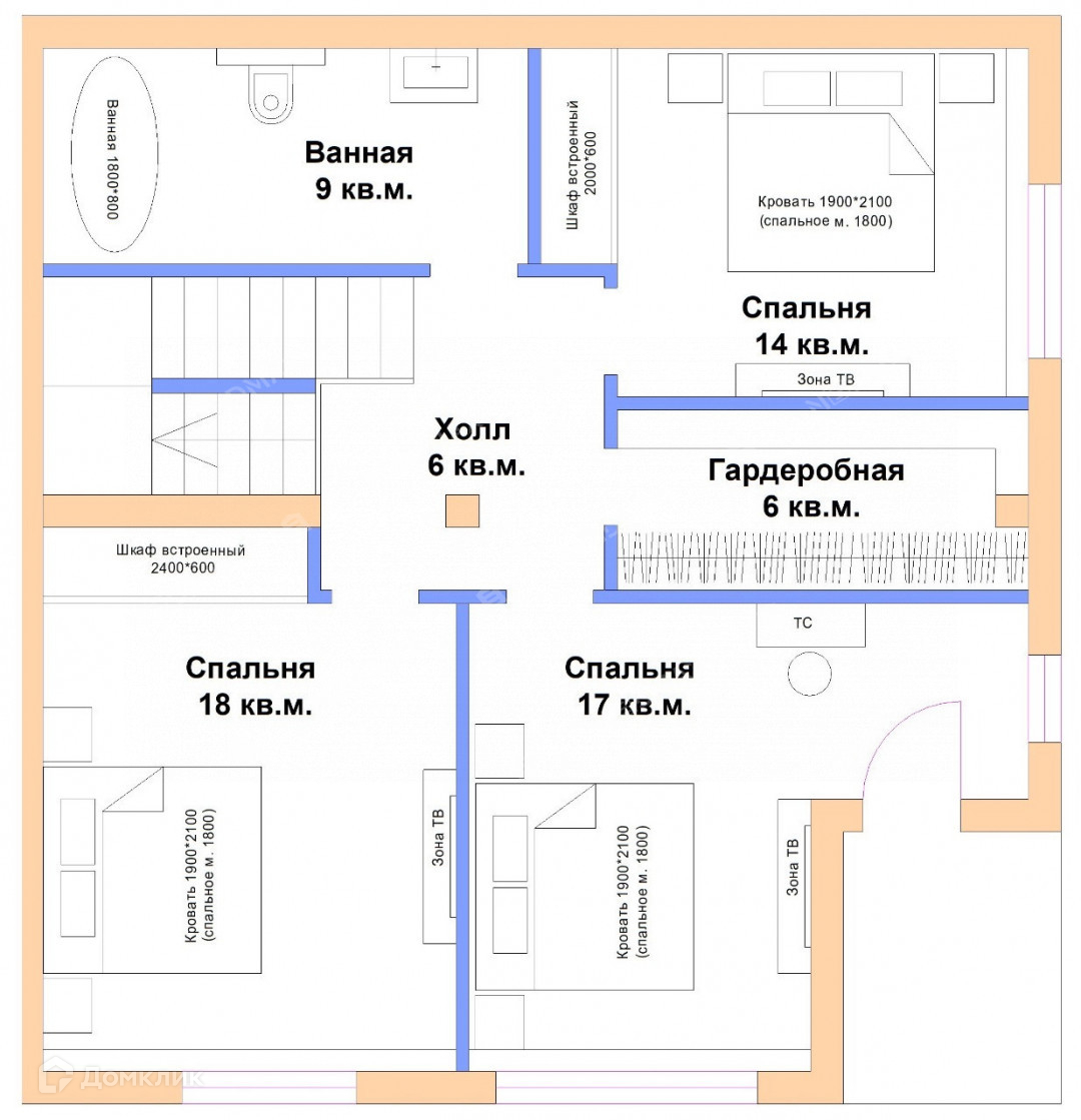 Второй этаж: три спальни, санузел, гардеробная, холл.